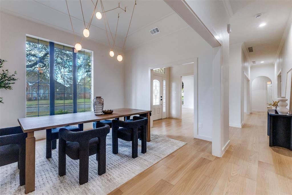 On either side of the foyer are the formal living room with fireplace and the formal dining room. The well-designed floor plan offers split bedrooms, with the primary suite and one bedroom on one side of the home and two bedrooms with a Jack-and-Jill bathroom on the other.