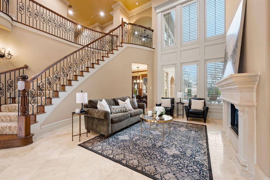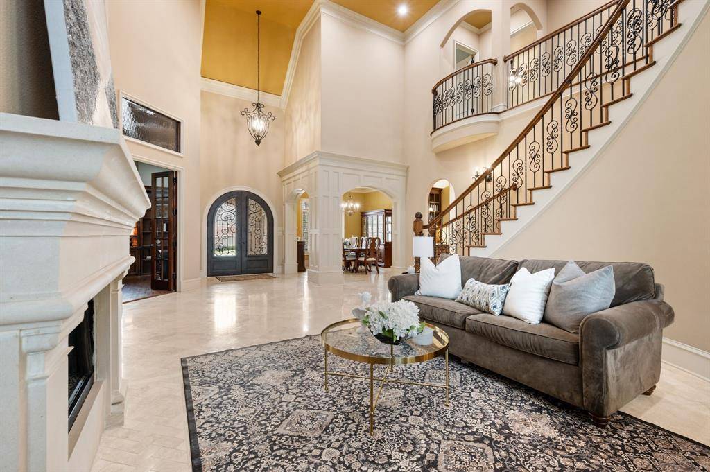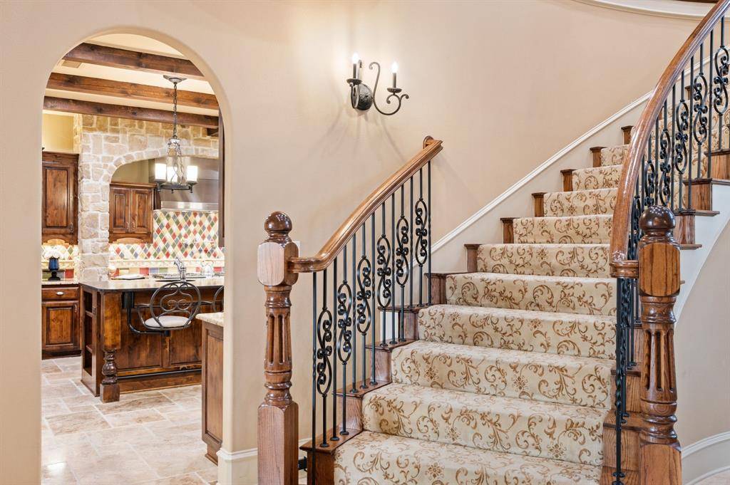 Inside, the home opens to a dramatic entry with soaring ceilings, a sweeping staircase, and natural light pouring through tall windows into the main living spaces. Beautiful architectural details, warm wood beams, and stone accents carry throughout the home, continuing seamlessly into the kitchen and family room. The living spaces flow effortlessly, blending warmth and craftsmanship with generous proportions designed for both grand entertaining and comfortable daily living.
