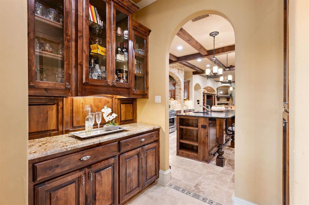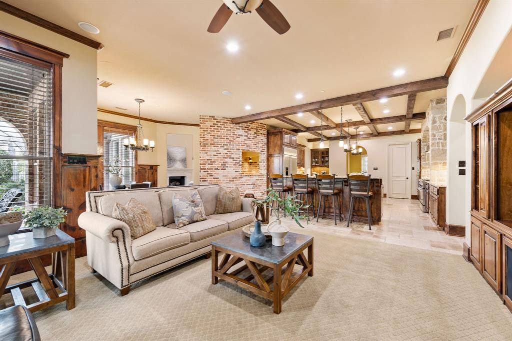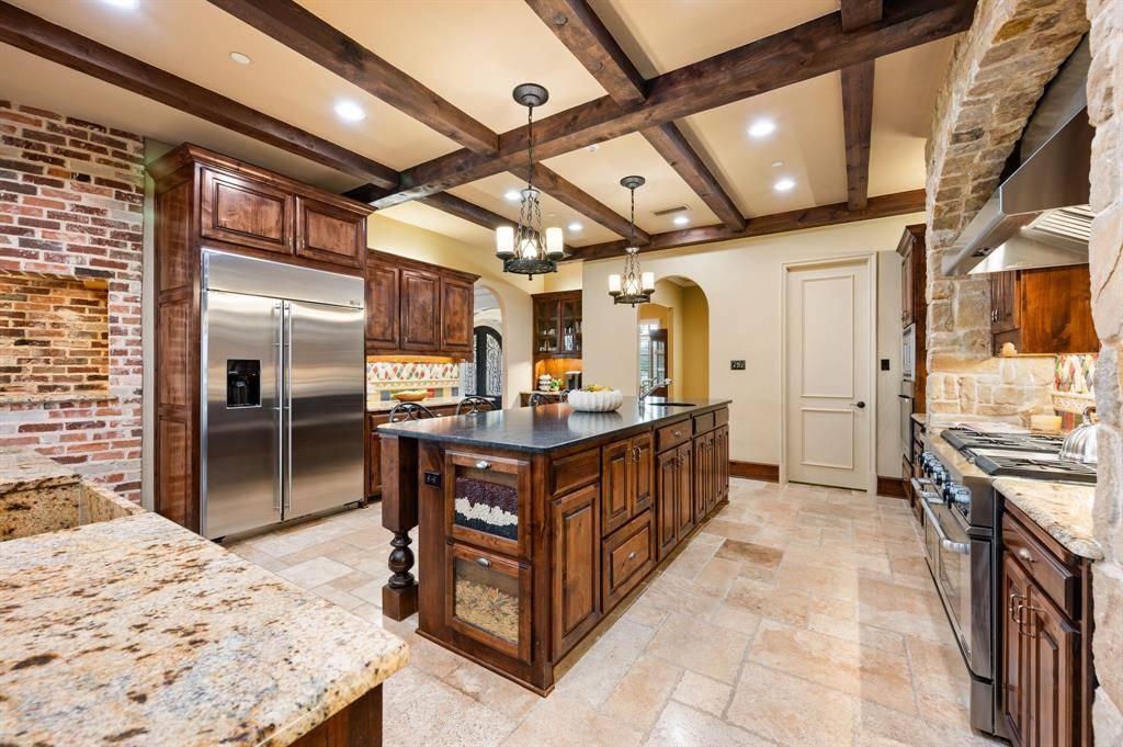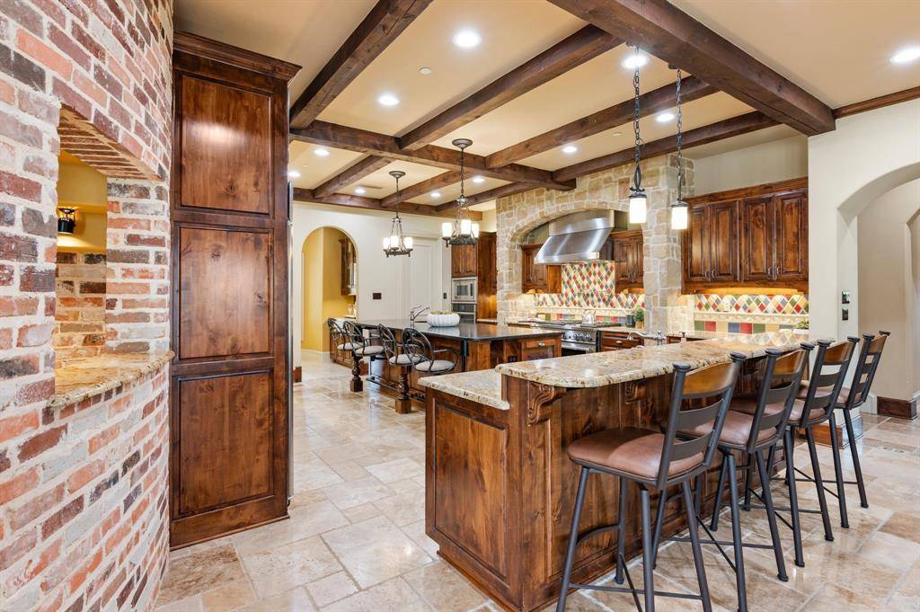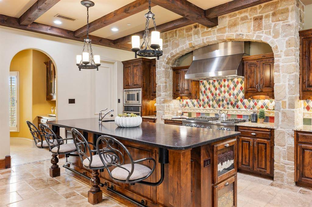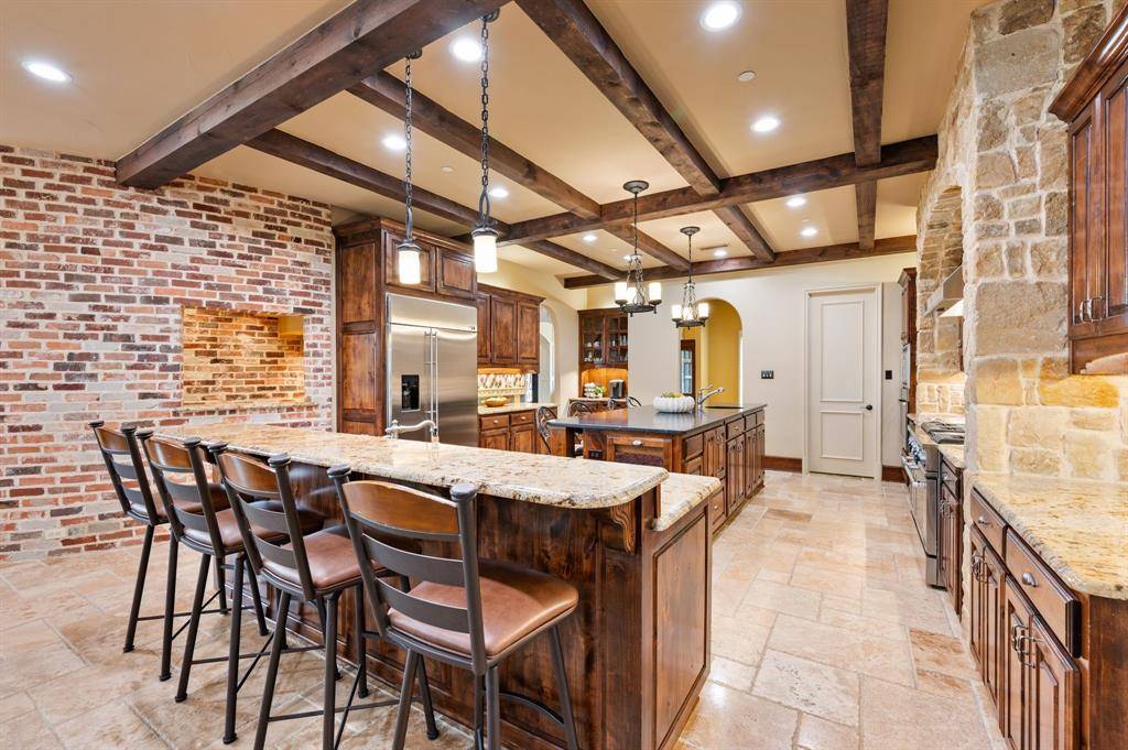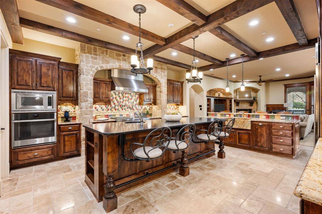 The kitchen and family room become the heart of the home, where rich wood cabinetry, striking beams, and a substantial island create a space that feels both sophisticated and welcoming. It is a setting where gatherings naturally linger, whether hosting friends for an evening or enjoying quiet mornings at home.
