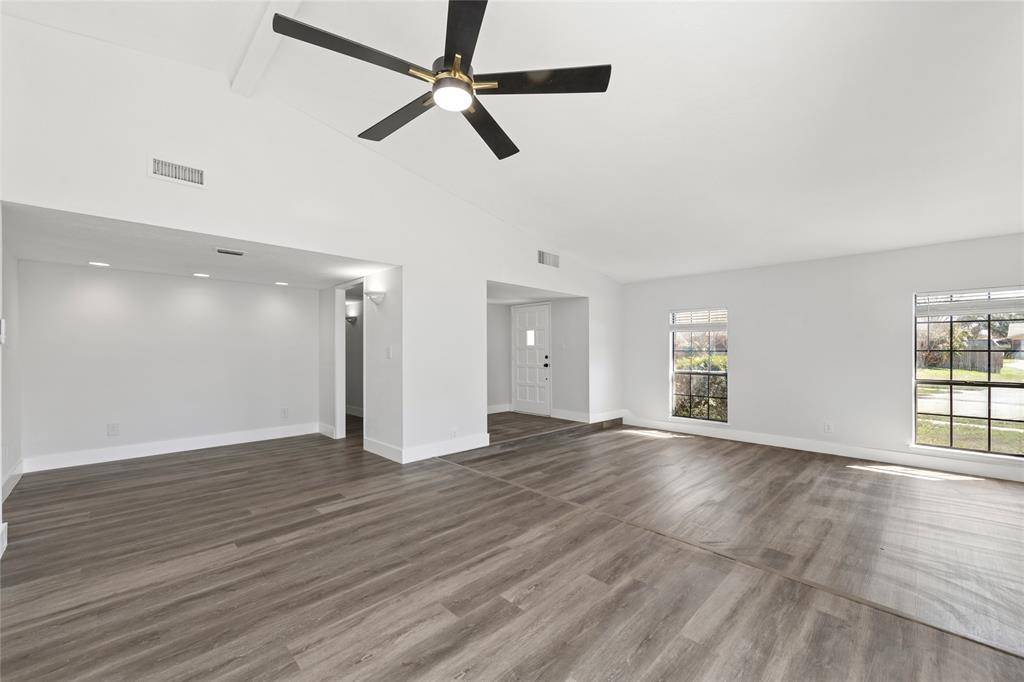 This beautiful 4-bedroom, 2-bathroom home is located in a prime neighborhood near George Bush. The home features 4 spacious bedrooms and two update bathrooms, along with a remodeled kitchen complete with updated countertops, stove, and microwave. As you enter through the front door, you will immediately notice the open and inviting front living area, which connects to the formal living room featuring a charming brick fireplace and soaring sloped ceilings. The home also offers a larger open living space in the family room, seamlessly connected to the kitchen and breakfast area, perfect for everyday living and entertaining. Step outside to enjoy the large backyard with a swimming pool, a covered patio for outdoor relaxation, and a sizeable side yard that provides additional space for activities.