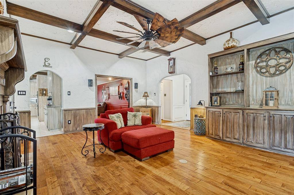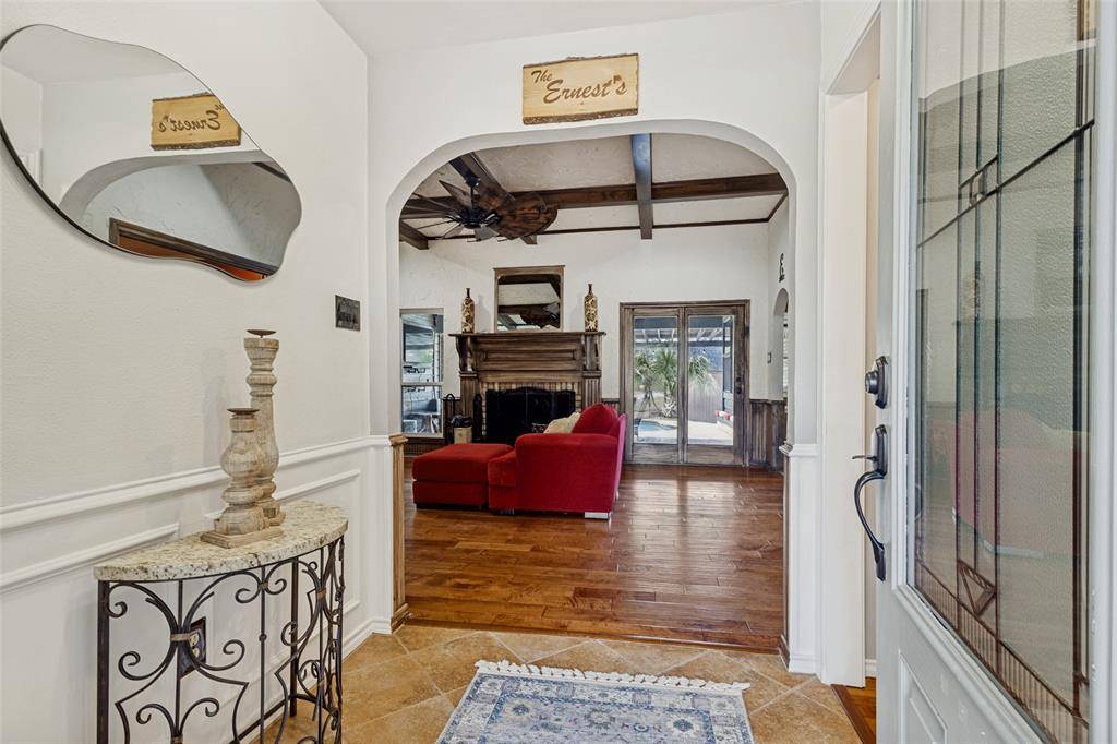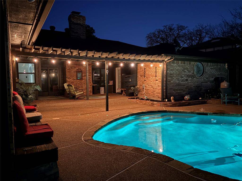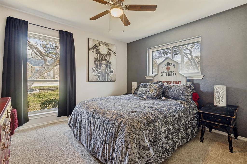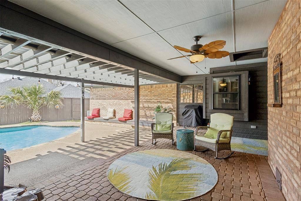 Beautifully maintained 4-bedroom, 3-bath home in the highly desirable community of Trophy Club! Golf cart friendly and ready for fun, this spacious 2,627 sq ft home sits on a quarter-acre lot and features a versatile floor plan with two living areas and two dining spaces—perfect for entertaining. The inviting family room showcases a coffered ceiling and cozy fireplace, while the kitchen offers updated stain resistant marble countertops, double ovens, ample cabinetry, and a walk-in pantry. The private primary suite includes a sitting area and spa-like bath, with an adjacent flex space ideal for an office, nursery, or workout room. Spring into Summer by stepping outside to enjoy the spacious covered patio and sparkling pool, perfect for relaxing or hosting guests. An electric iron gate secures the driveway and oversized garage for added privacy. Located near parks, shopping, dining, and top-rated schools. Recently added a $10k Water Softener, new pool pump, new roof in 2021 and all new energy efficient windows throughout.