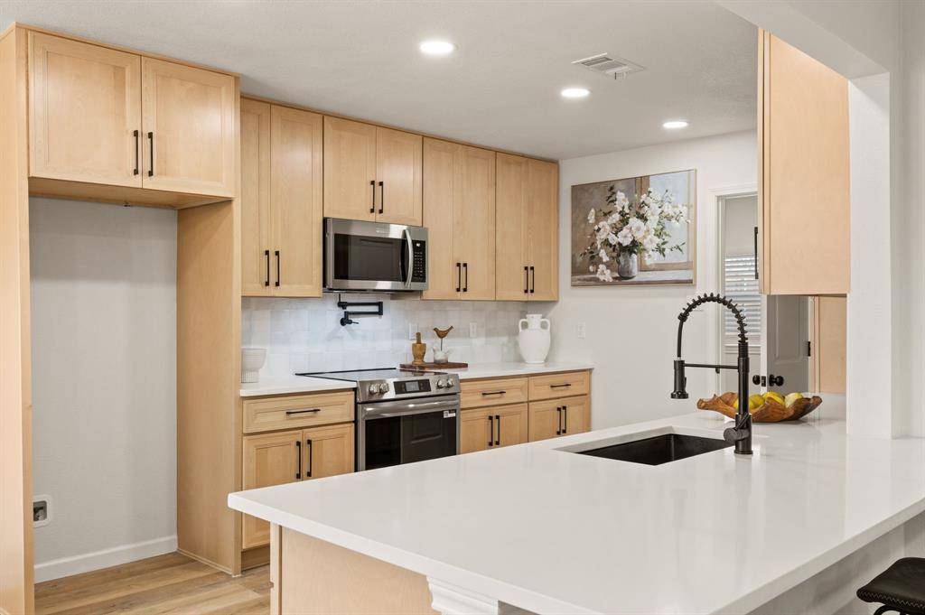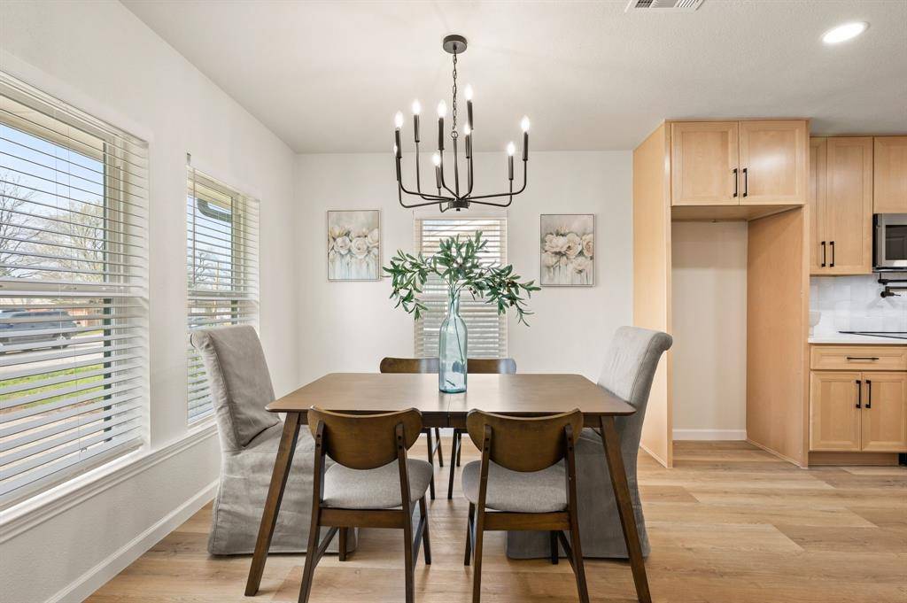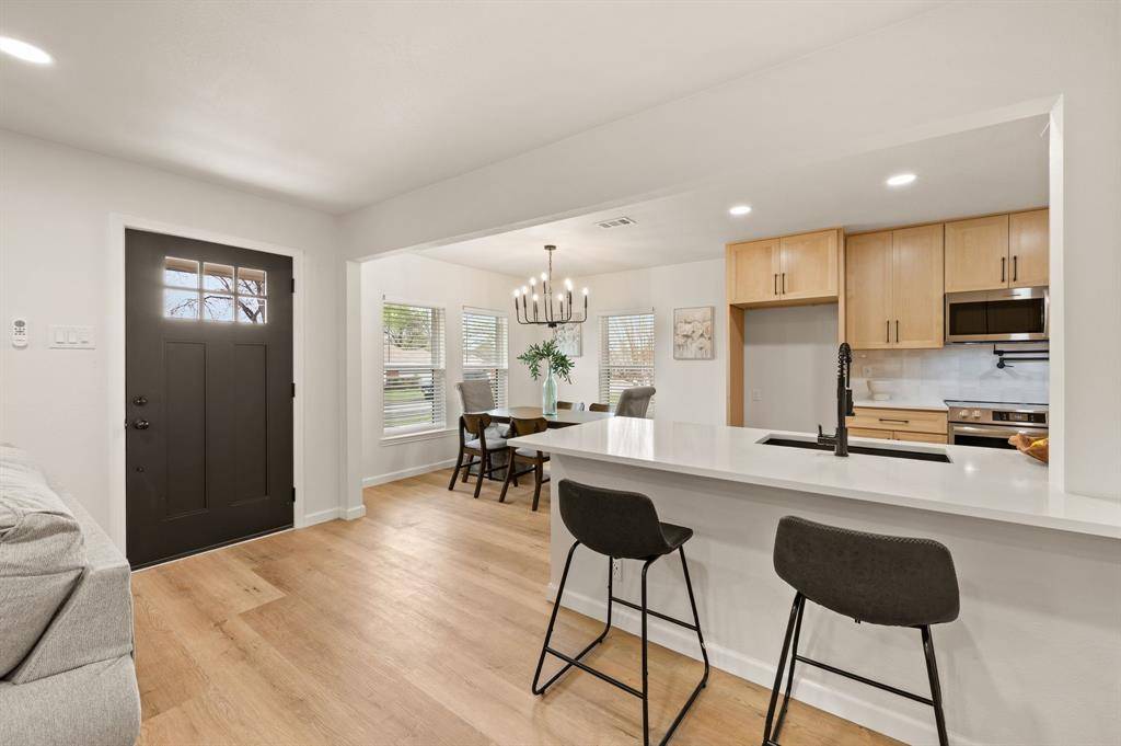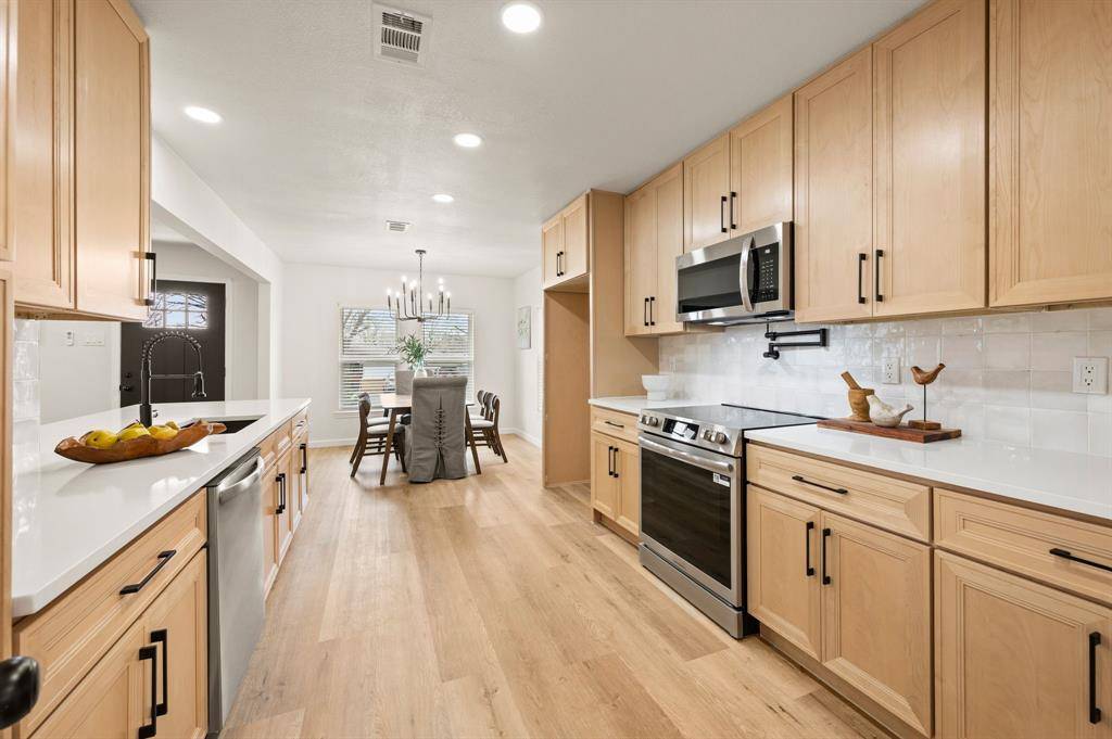 STUNNING fully renovated 3 bedroom 2 bath 1545 square foot home within walking distance to historic downtown Grapevine! Nothing has been left untouched in this one of a kind home. Complete high end interior & exterior remodel. Updates include new roof, HVAC, plumbing, windows, electrical, insulation, custom cabinetry, LVP floors, quartz countertops, paint inside & out, matte black fixtures, LED lighting & much more! Large living area that is open to kitchen & dining is perfect for entertaining. Your chef quality kitchen contains custom natural wood cabinetry with soft close hinges, high end stainless steel appliances, pot filler, pantry, quartz countertops, USB ports & granite sink. Spacious secondary bedrooms with custom closets that offers various living configurations are adjacent to fully renovated magazine quality guest bathroom. GIANT primary bedroom with seating area offers features not often found in homes of this size. Attached spa quality primary bathroom contains walk in shower for 2 with body sprays, dual vanities, quartz countertops and large walk in closet. Outside you will find brand new landscaping, gutters, sod & 8 foot privacy fence. Large backyard is perfect for spending time outside. Award winning GCISD schools. Located within minutes to major roads, schools, shopping, & parks. Homes like this do not hit the market often. Come see YOUR new home today!