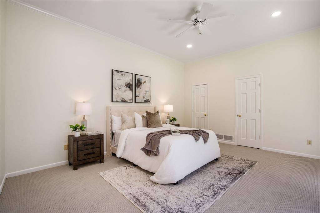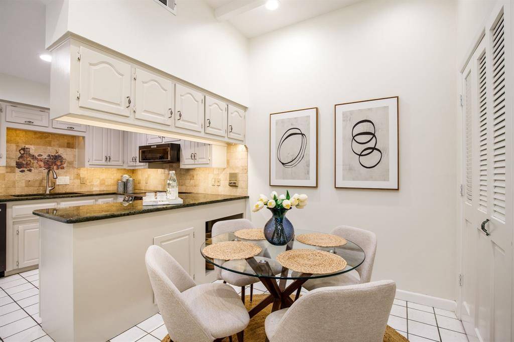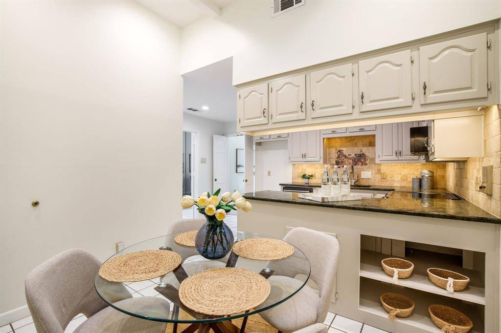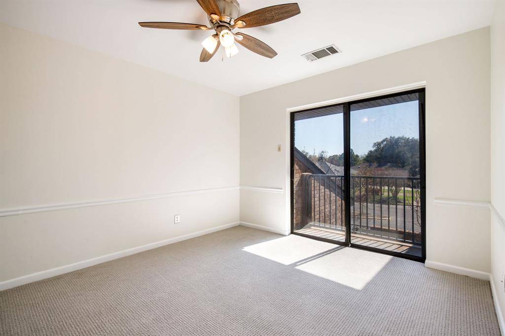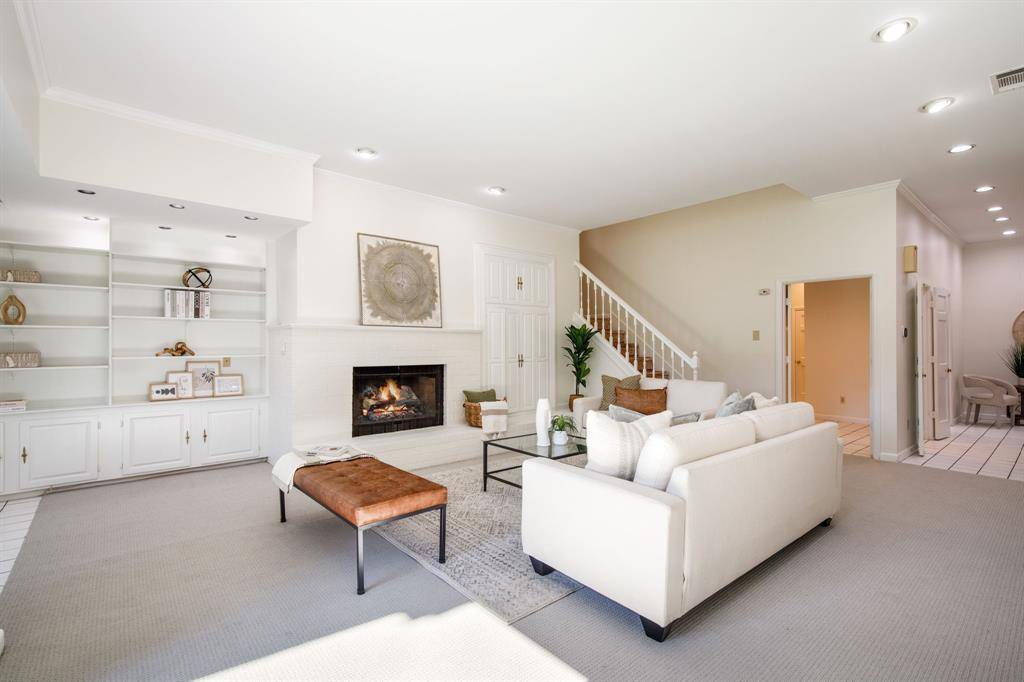 Rare opportunity to own an updated townhome with NO HOA ideally positioned directly across from the prestigious Brookhaven Country Club, offering a lifestyle of convenience and recreation. This well-designed home features a desirable floor plan with the primary suite located on the first level, creating a private retreat. The beautifully updated primary bathroom showcases dual sinks, custom mirrors and sconces, a wall of custom built-ins, an enormous walk-in shower, and a spacious walk-in closet. The primary bedroom also features recently installed LED can lighting. The expansive family room is the heart of the home and highlights a striking brick fireplace with built-ins, perfect for relaxing or entertaining. Adjacent to the family room is a versatile flex space ideal for a home office or library with extensive built-in bookshelves. Large sliding glass doors in both spaces bring in abundant natural light. The kitchen offers granite countertops, freshly painted cabinetry, an electric range, built-in microwave, and opens to the breakfast nook, while a spacious dining area sits at the front of the home. Upstairs you will find two bedrooms, a full bath, and a large, air-conditioned storage area perfect for a craft room, exercise space, or hobby room. One upstairs bedroom includes a private balcony. The backyard is designed for low-maintenance living with artificial turf, a pergola for outdoor relaxation, and beautiful azaleas. All carpet in the home is new and the roof was replaced in 2026. Both air conditioners are newer - 2021 & 2023, and the two Water Heaters were replaced in 2025. Brookhaven Country Club offers three championship golf courses, tennis, pickleball, fitness center, swimming, and dining with several membership levels available. The location is convenient to shopping, restaurants, Addison, and major highways.