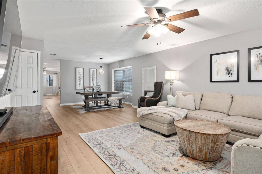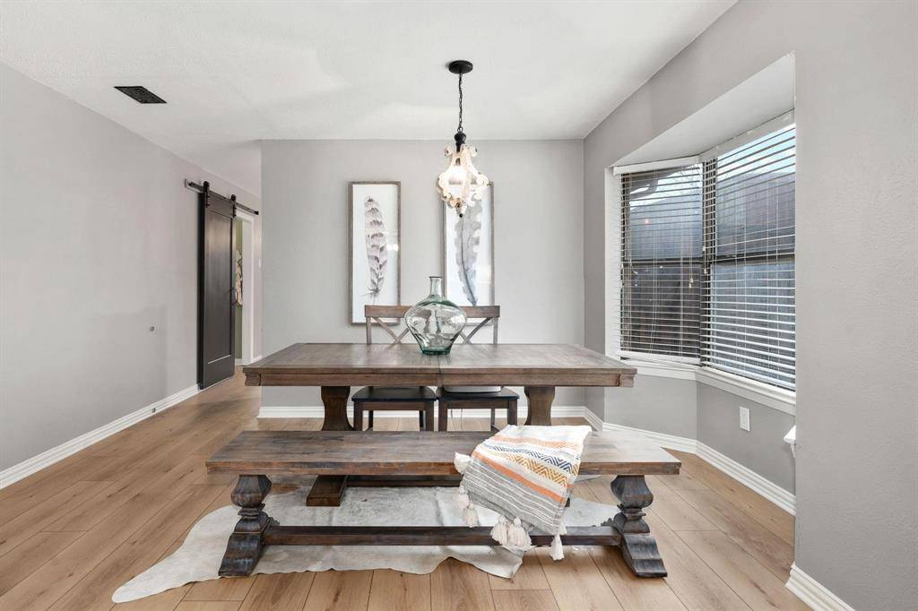 Manicured landscaping, mature trees, and a grand elevation create a welcoming entrance to this beautifully maintained 3-bedroom, 2-bath home in Carrollton. Inside, the open-concept layout features stylish upgrades including shiplap accents, a sliding barn door, and gorgeous plank LVP flooring throughout—no carpet. The soft gray and white color palette is complemented by updated fixtures, hardware, and thoughtful design details.