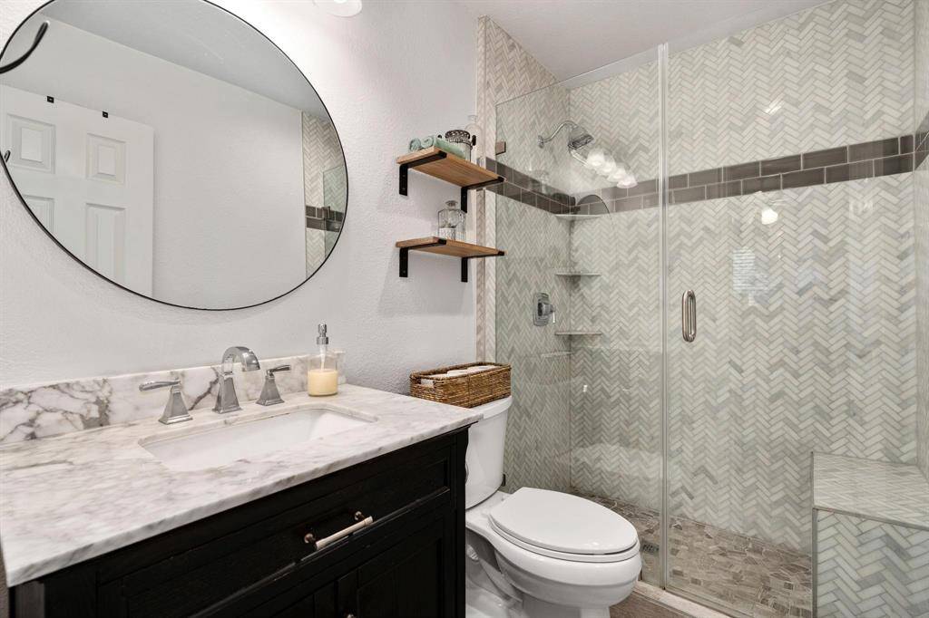 The remodeled kitchen is a standout with granite countertops, stainless steel appliances, oversized subway tile backsplash with natural edge detail that extends to the ceiling, floating shelves, and pendant lighting over the peninsula breakfast bar. A convenient serving window opens to the patio, perfect for entertaining. The dining area is highlighted by a charming bay window that fills the space with natural light.