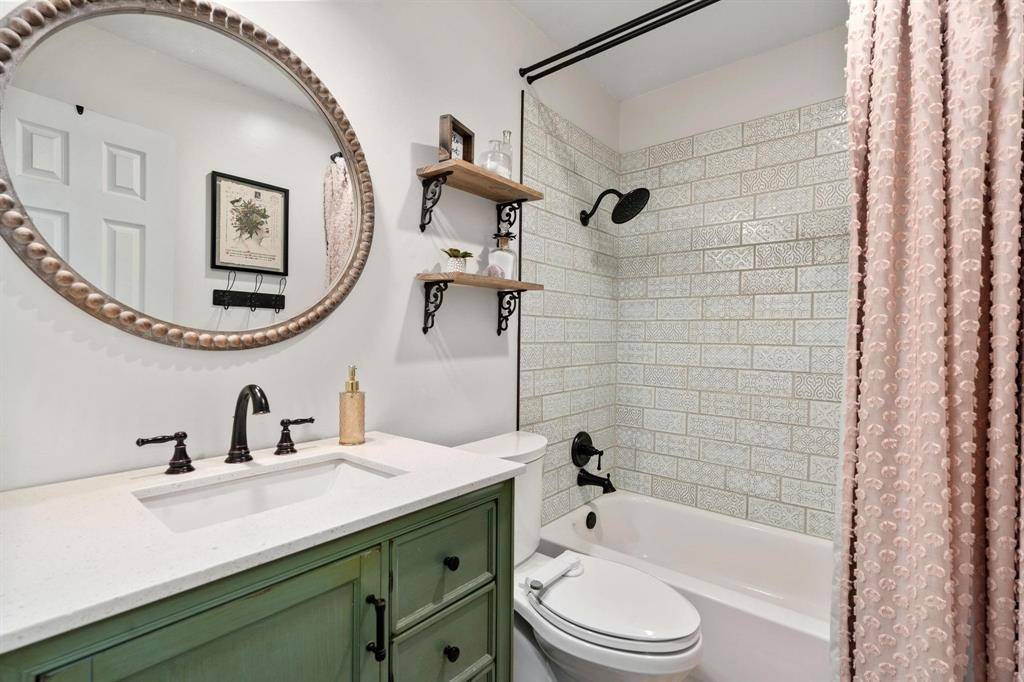 The spacious family room features an impressive corner fireplace with an extended hearth, creating a warm and inviting focal point. Both bathrooms have been tastefully updated with designer tile and decorative mirrors.