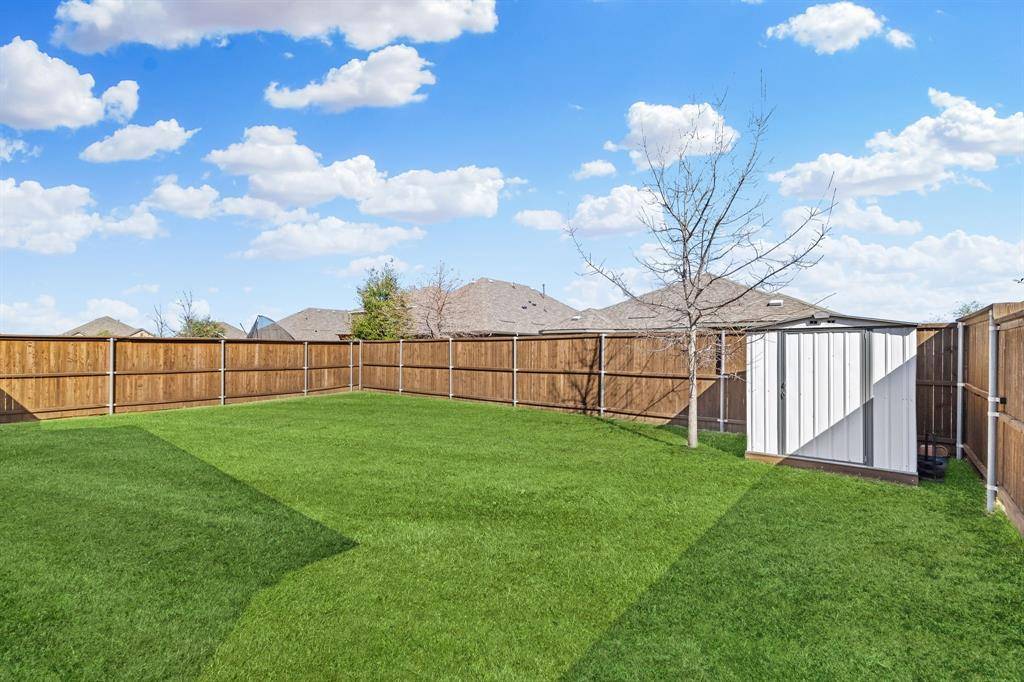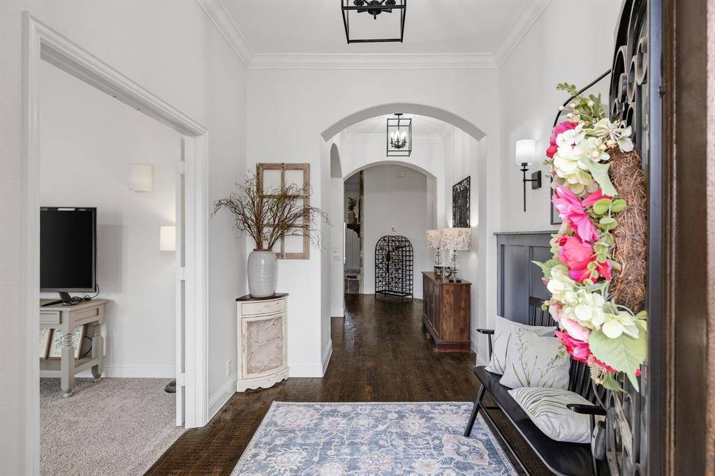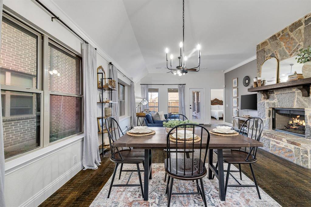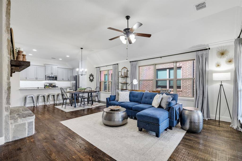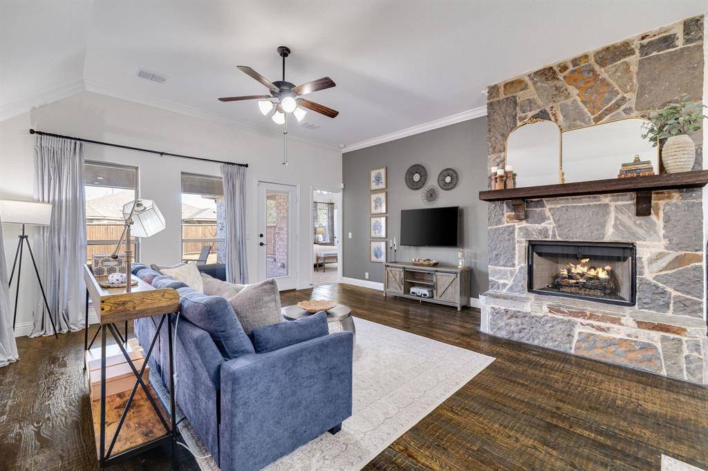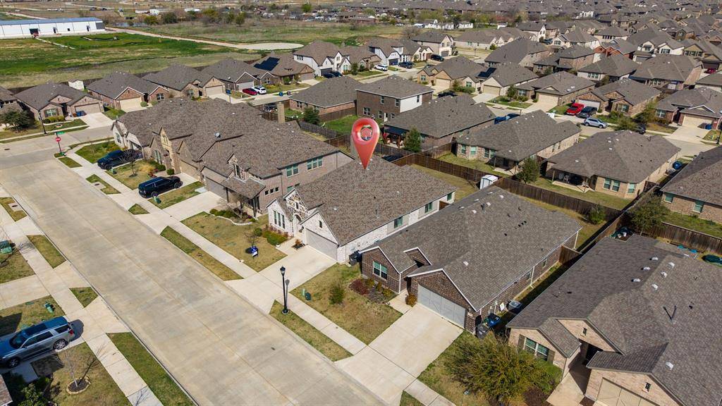 Welcome to this beautifully maintained 3 bedroom, 2 bathroom home with a dedicated study, built in 2020 and ideally situated on a quiet cul-de-sac in one of the fastest growing areas in North Texas. Inside, you'll find real hand-scraped wood floors flowing through the main living areas, complemented by crown molding, decorative lighting, and fresh interior paint that create a warm and inviting atmosphere. The spacious living room is anchored by a stunning full stone fireplace with a cedar block mantle and raised hearth, making it the perfect focal point for relaxing or entertaining. The kitchen features granite countertops, ample cabinetry, and a functional layout that opens seamlessly to the living and dining spaces. Two generously sized guest bedrooms and a private study offer flexibility for family, guests, or a home office. All windows are energy efficient, with tinted windows in the living area providing added privacy and comfort. Step outside to enjoy the large covered patio overlooking a fenced backyard, ideal for outdoor dining, gatherings, or simply unwinding. Additional highlights include a sprinkler system and an epoxy coated garage floor. The community includes access to a swimming pool, tennis courts, and walking trails. Located in a prime and rapidly developing corridor near the PGA headquarters and the future Universal Studios theme park, this home offers incredible access to shopping, dining, and entertainment while still maintaining a peaceful neighborhood feel. Zoned for the highly prestigious Prosper ISD. Don't miss the opportunity to own a move-in ready home in one of North Texas' most exciting growth areas.