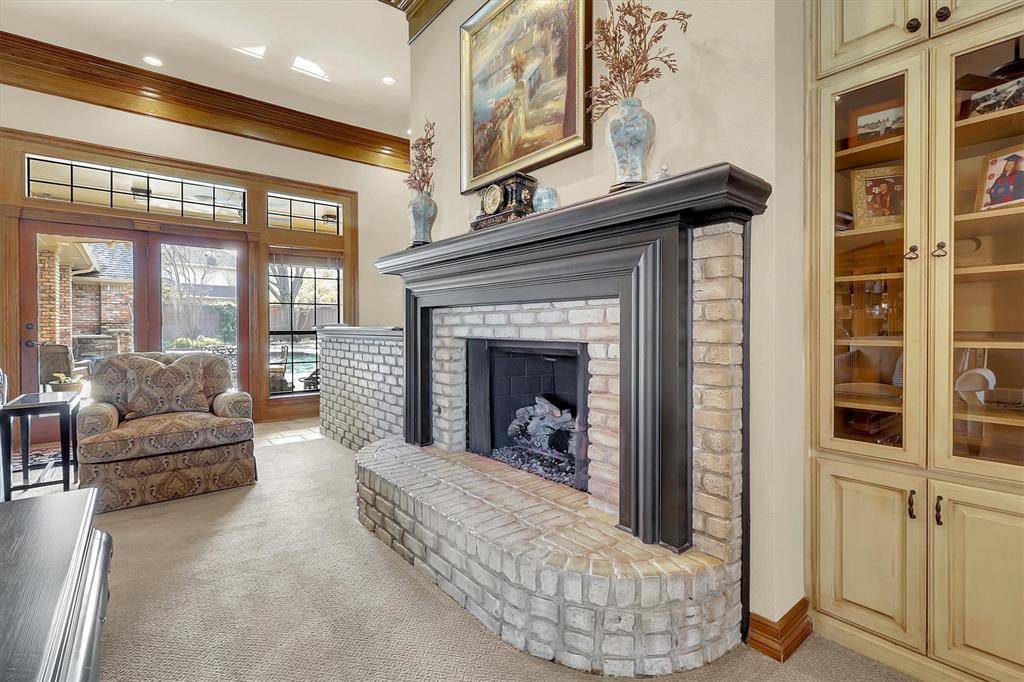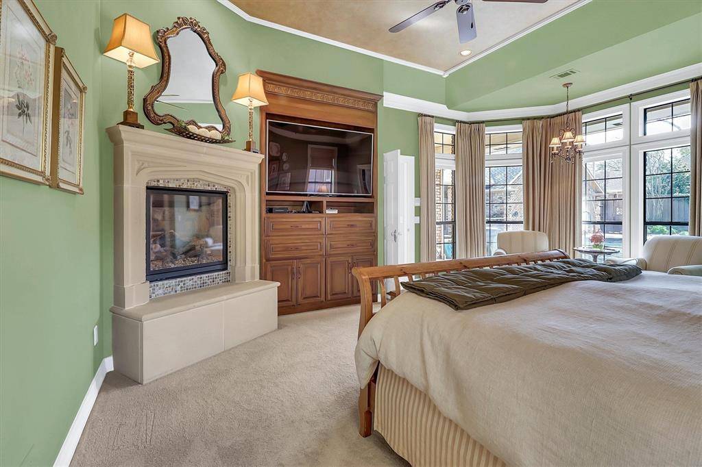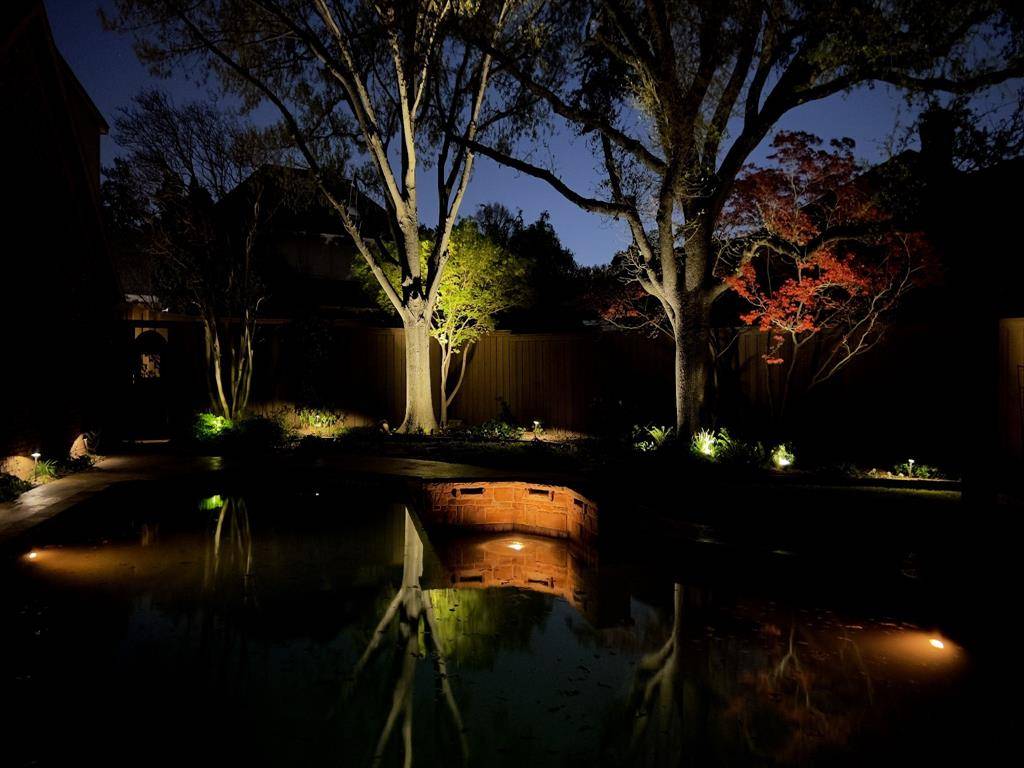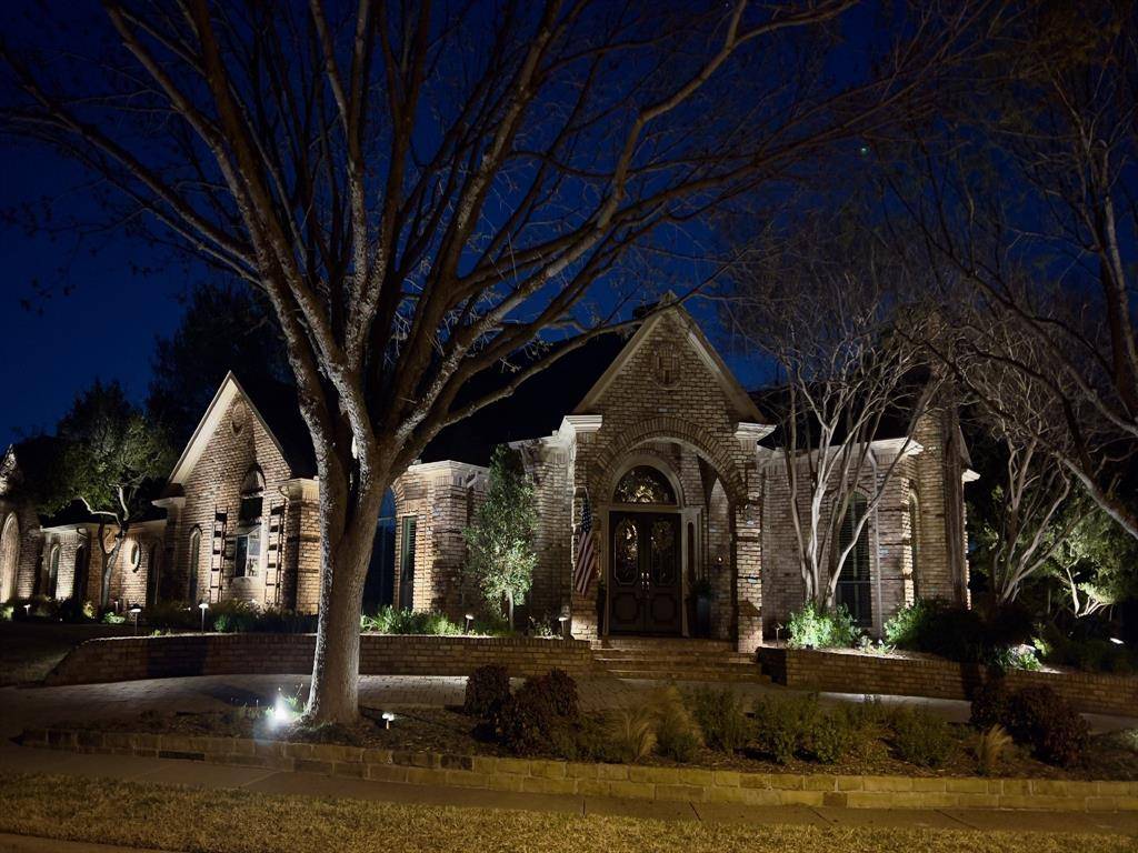 Luxury living at its best in this totally private custom designed home retreat situated on a quiet cul-de-sac and set on nearly half an acre lot in highly coveted West Plano. This superior north-facing spacious 5 bedrooms, 4 bedrooms on first floor home offers an exceptional blend of elegant interior space and resort-style outdoor view of backyard pool from its living areas. It's an outdoor vacation. The primarily one-story home concept boasts of an incredible backyard lifestyle featuring an inviting sparkling pool and spa with a tranquil waterfall and 3 covered patios showcasing designer pergola and an outdoor kitchen that offers memory-making times with friends and family in this private fenced backyard. Decorator-influenced interior welcomes all to a grand entry boasting of double doors and hardwood floors opening to two living areas for family living or entertaining ease. Inviting downstairs living areas showcase 2 fireplaces, exquisite picture paneling, elevated ceilings, walk-in bar area with sink, beverage fridge, and extensive crown molding while offering flexibility as a study or sitting area. Formal Dining Room features hardwood flooring, classic wainscoting, and can easily serve as a dining space or a flexible game area. Gourmet chef's kitchen boasts of 5 burner cooktop, abundant cabinetry, custom cooktop Venta Hood, breakfast bar, center work island, designer window planter box, and separate utility room with extensive shelving, cabinets, and sink. Primary Bedroom is upgraded with cast stone fireplace and built-in cabinets for television and drawer plus shelving. Primary Bedroom is perfect as an attached room with built-in shelving, fireplace, & multiple options for an office or nursery. Upstairs spacious room with a full bath has multiple potential uses as a 3rd living area or 5th bedroom. For enhanced security and to accentuate the extensive landscaping this home includes Custom LED Landscape Lighting Controllers for both front-yard and back-yard