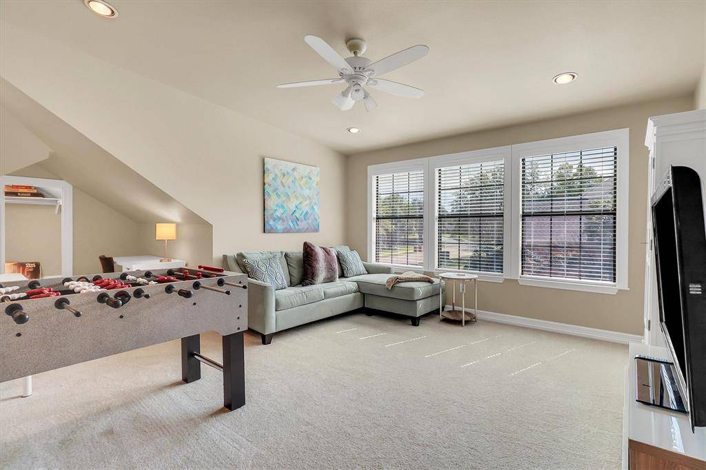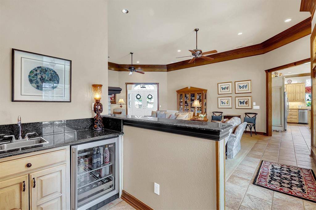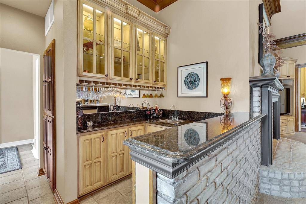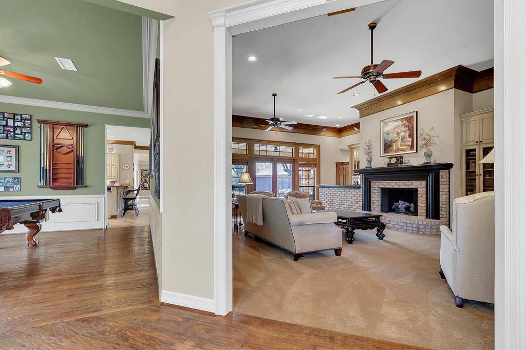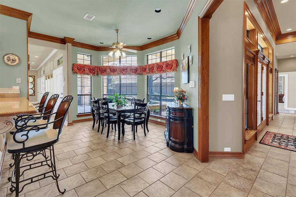 Luxury living at its best in this totally private custom designed home retreat situated on a quiet cul-de-sac and set on nearly half an acre lot in highly coveted West Plano. This superior north-facing spacious 5 bedrooms, 4 bedrooms on first floor home offers an exceptional blend of elegant interior space and resort-style outdoor view of backyard pool from its living areas. It's an outdoor vacation. The primarily one-story home concept boasts of an incredible backyard lifestyle featuring an inviting sparkling pool and spa with a tranquil waterfall and 3 covered patios showcasing designer pergola and an outdoor kitchen that offers memory-making times with friends and family in this private fenced backyard. Decorator-influenced interior welcomes all to a grand entry boasting of double doors and hardwood floors opening to two living areas for family living or entertaining ease. Inviting downstairs living areas showcase 2 fireplaces, exquisite picture paneling, elevated ceilings, walk-in bar area with sink, beverage fridge, and extensive crown molding while offering flexibility as a study or sitting area. Formal Dining Room features hardwood flooring, classic wainscoting, and can easily serve as a dining space or a flexible game area. Gourmet chef's kitchen boasts of 5 burner cooktop, abundant cabinetry, custom cooktop Venta Hood, breakfast bar, center work island, designer window planter box, and separate utility room with extensive shelving, cabinets, and sink. Primary Bedroom is upgraded with cast stone fireplace and built-in cabinets for television and drawer plus shelving. Primary Bedroom is perfect as an attached room with built-in shelving, fireplace, & multiple options for an office or nursery. Upstairs spacious room with a full bath has multiple potential uses as a 3rd living area or 5th bedroom. For enhanced security and to accentuate the extensive landscaping this home includes Custom LED Landscape Lighting Controllers for both front-yard and back-yard