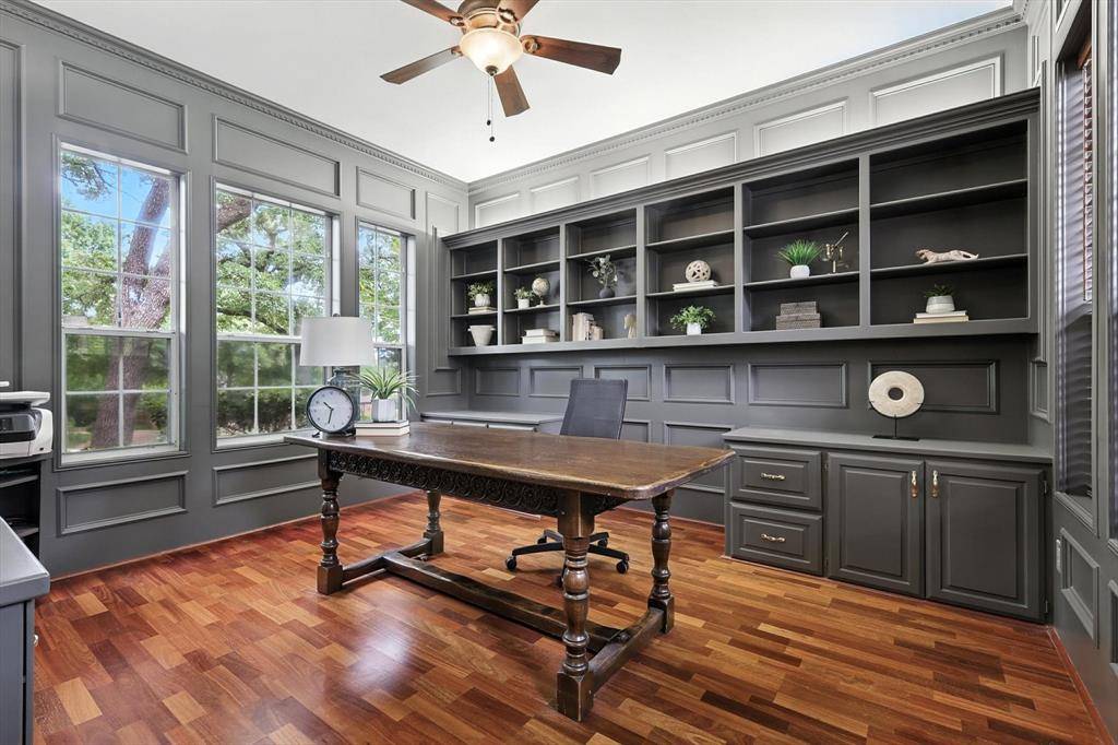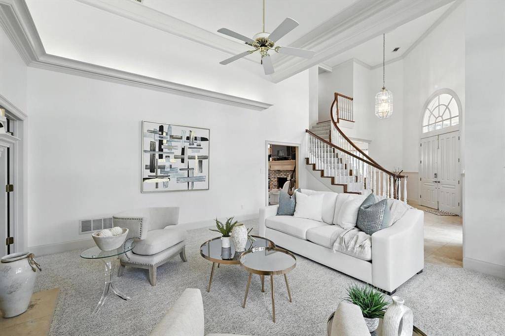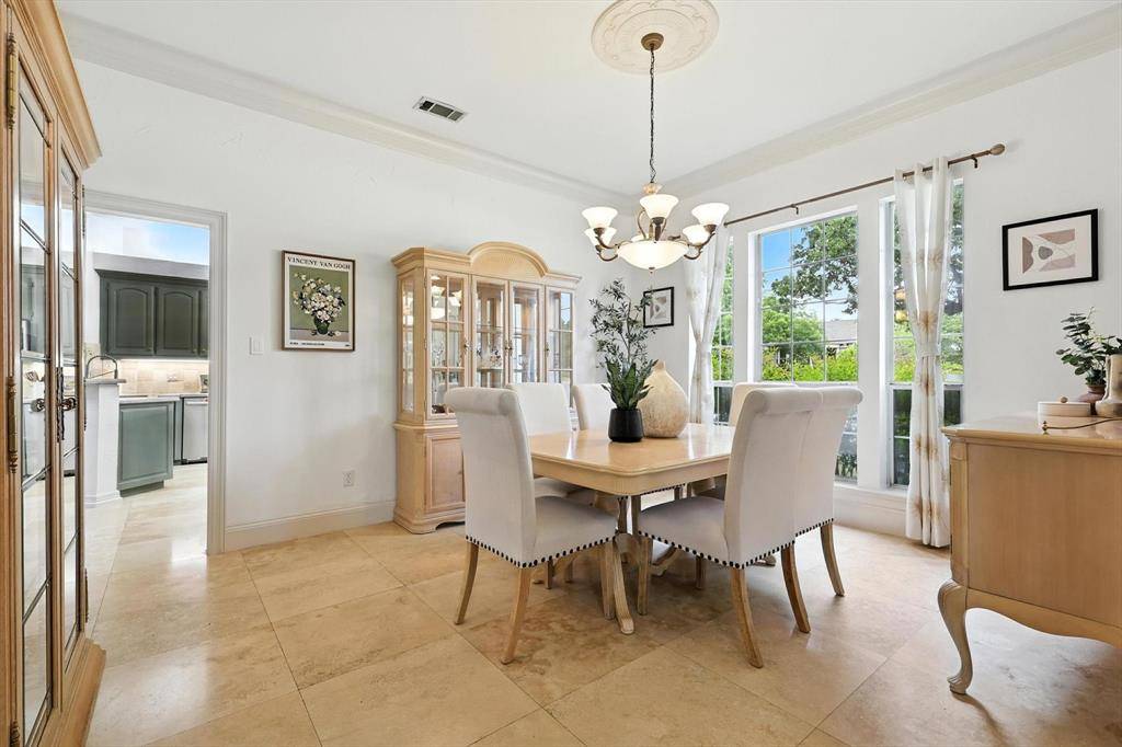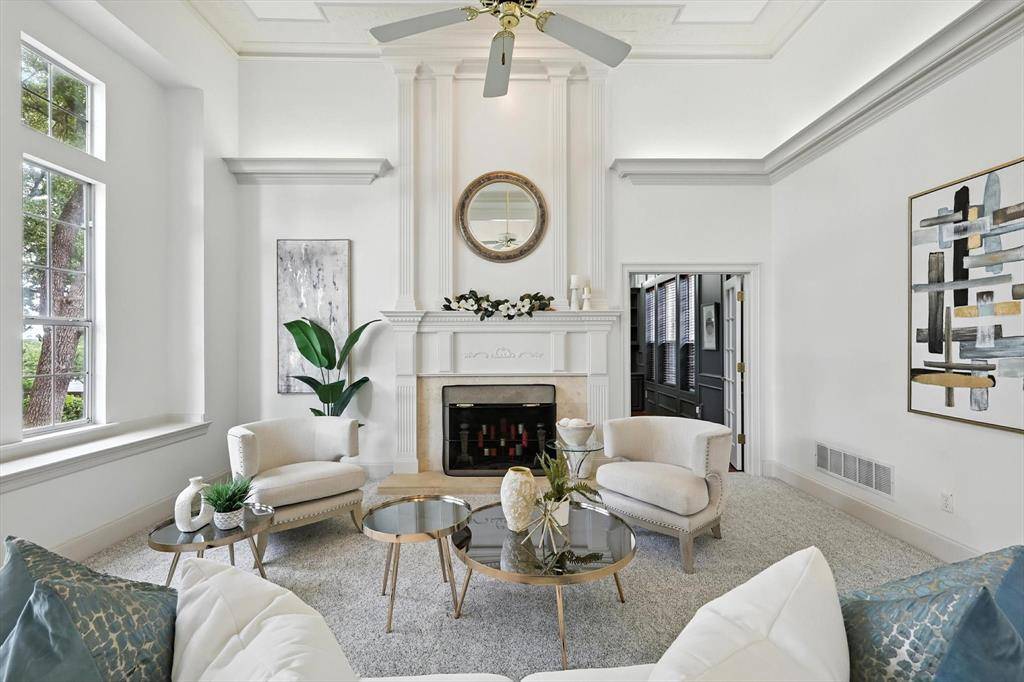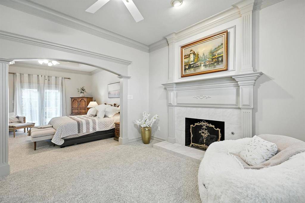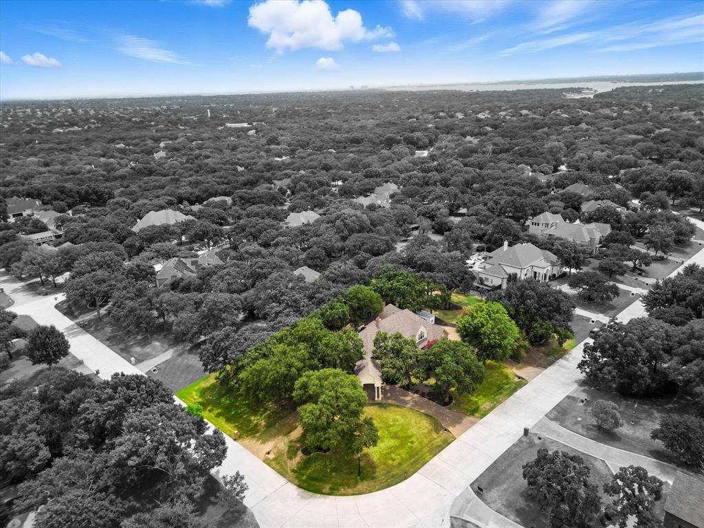 Peaceful perfection on a beautiful oversized corner lot in desirable Wichita Creek Estates of Flower Mound. Impressive curb appeal with grand porte-cochere and large circle drive way. The exquisite entry welcomes you to the expansive living room, gorgeous staircase and formal dining room with custom moldings, ceilings, and woodwork. New carpet and fresh paint throughout a bonus. Main level offers large office or flex room with tasteful paneled walls, built in shelves and beautiful neighborhood views. The heartbeat, or center of this home, includes a large family room with coffered ceiling, wet bar, brick fireplace, open to the large kitchen and secondary dining area. Remodeled chefs kitchen boasts premium stainless steel appliances, island, plenty of cabinet space, quartz counters, and designer finishes. Large, relaxing sunporch just off the kitchen provides additional living space and encourages reading or relaxing time with controlled temps. Also a perfect location for the plant enthusiast! Hallway off the kitchen leads to an oversized master wing ensuite with a large sitting area with fireplace perfect for reading or a secondary TV viewing area. Recently updated large spa like primary bathroom offers freestanding tub, separate vanities, two walk in closets, separate showers and plenty of storage. Deluxe utility room offers built in ironing board, sink and room for a refrigerator. Upstairs offers 3 bedrooms and 2 full bathrooms. One upstairs bedroom offers an ensuite and could serve as secondary master. Retreat to the peaceful backyard with lush landscaping and flagstone. Oversize 3 stall garage with plenty of storage. Roof replaced in 2019 Class 4 shingles. Gas line available for outdoor grill and kitchen cooktop. Sprinkler system in yard and flower beds. Walk or bike to Twin Coves park and Lake Grapevine. Desirable Exemplary Flower Mound Schools. Close to shops, restaurants, and DFW airport. Back yard perfect for a pool! CAD pool designs available on request!!
