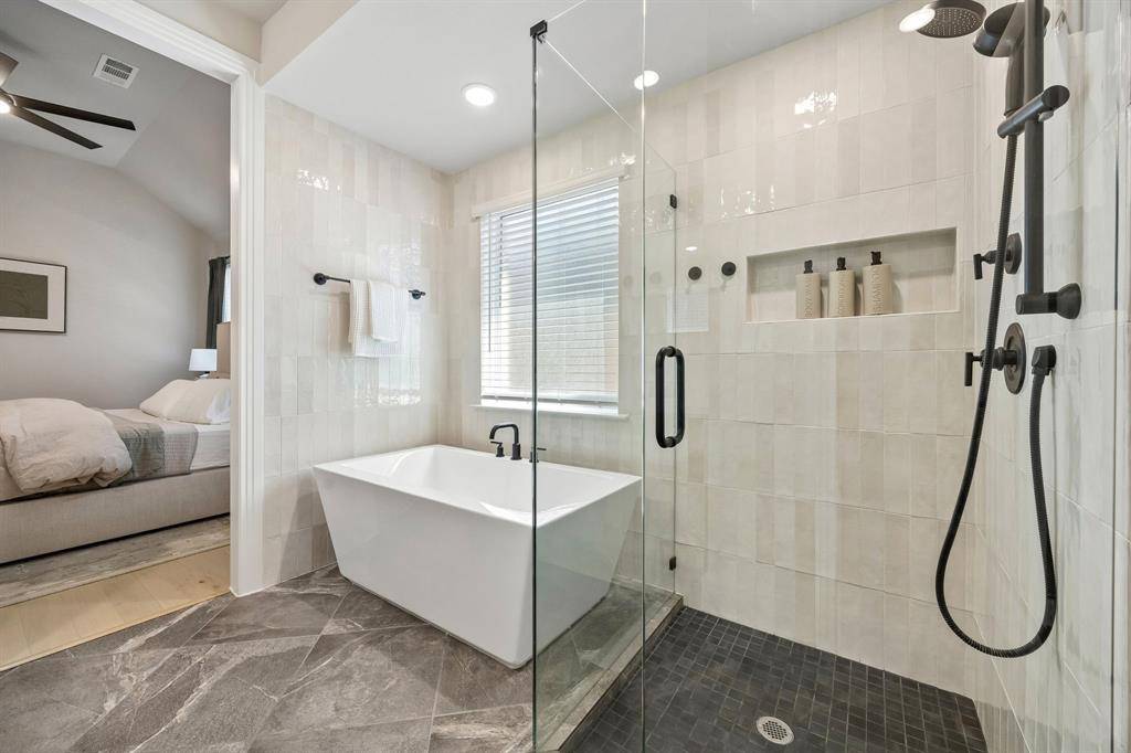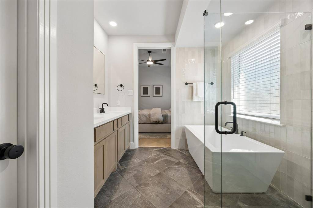 The private primary suite offers a spa-inspired bath with a floating tub and upgraded shower, while all bathrooms feature tile from floor to ceiling for a polished, complete look that stands out from many homes in this price point.