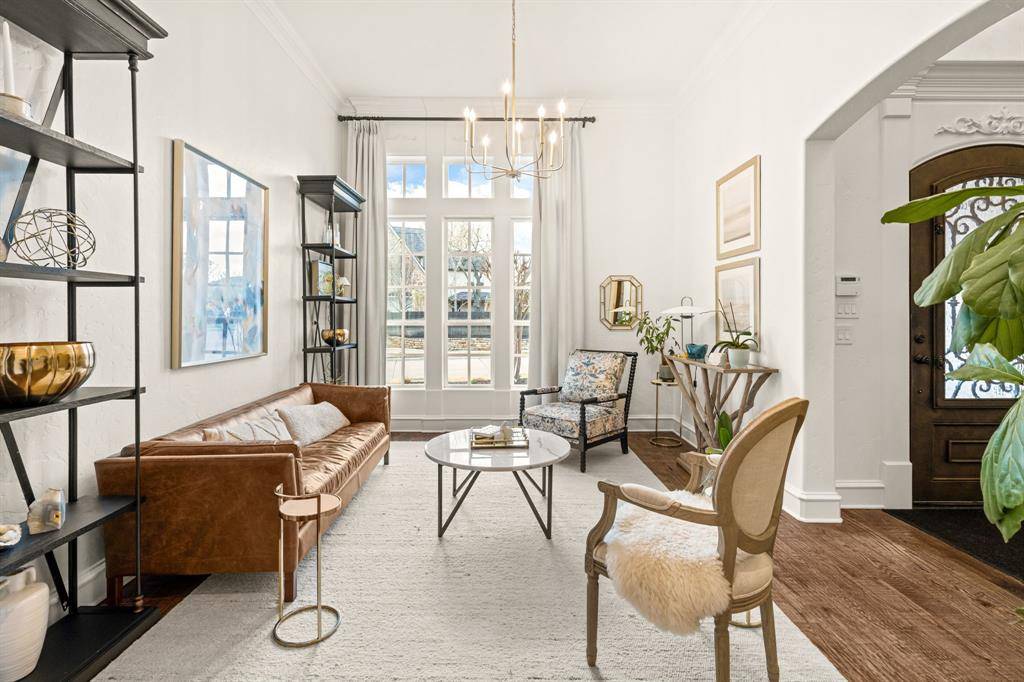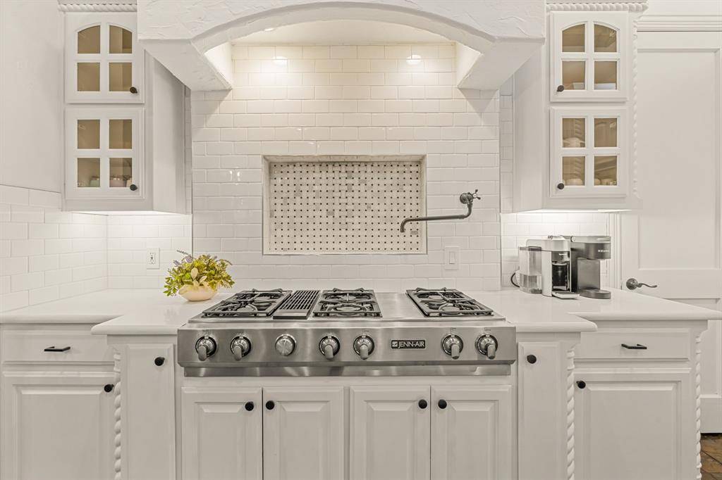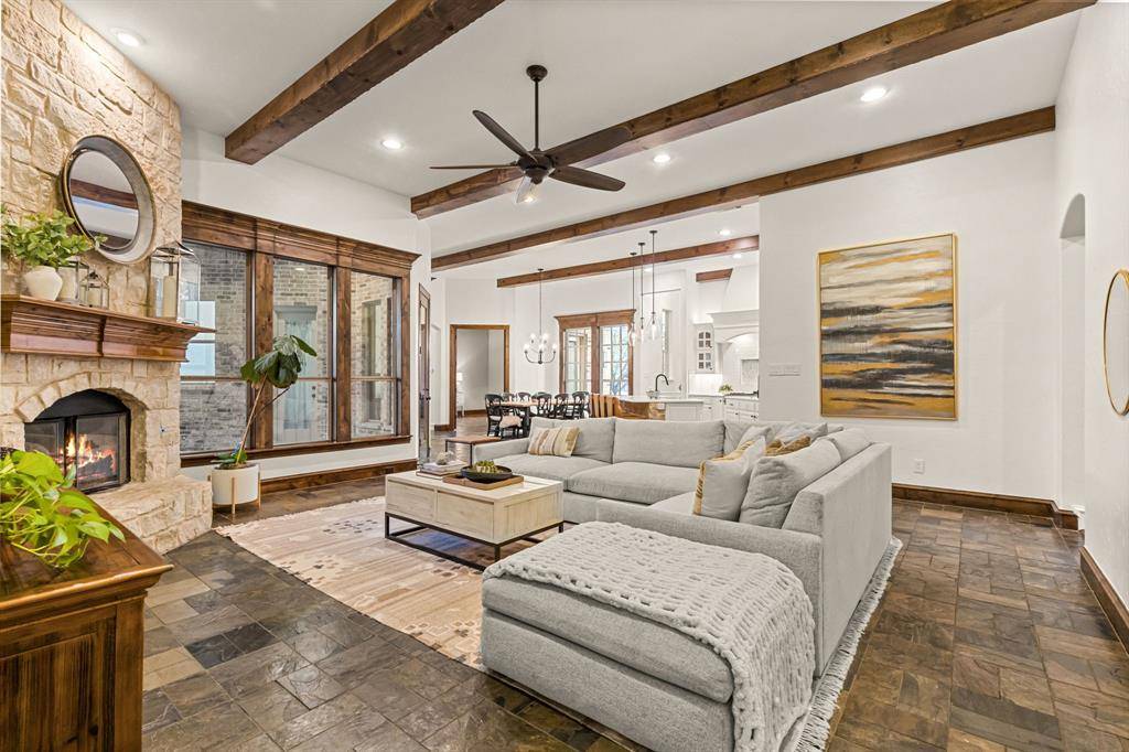 Solid construction and exposed wood beams bring warmth and character to the tall ceilings. The home has been freshly painted throughout and features an updated kitchen with quartz countertops, subway tile accented by marble backsplash, dual islands and sinks with updated faucets, a large pantry, warming drawer, and gas cooktop. Wood floors in the formal areas were replaced in 2025, and the primary bath offers refreshed paint, updated hardware and lighting, and a frameless glass shower plus a spacious closet.
