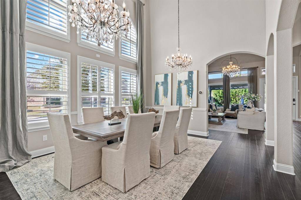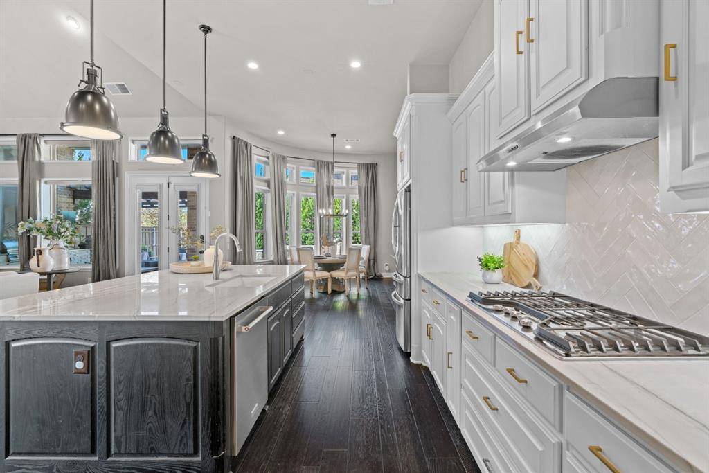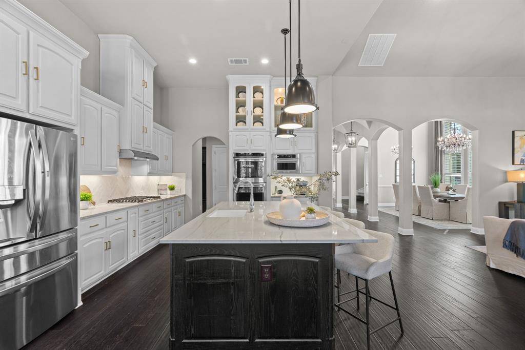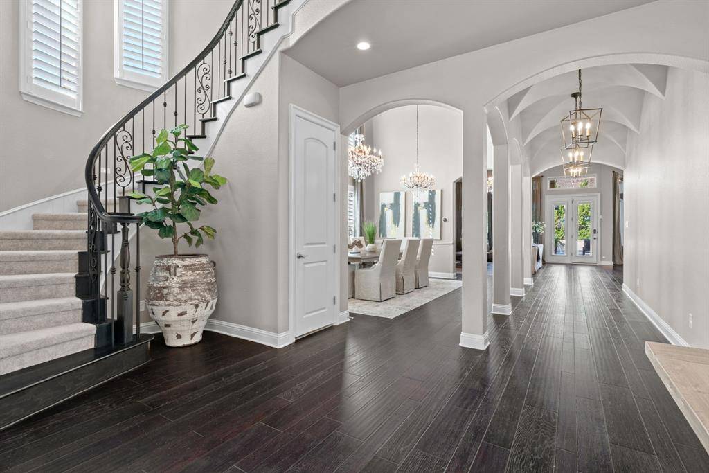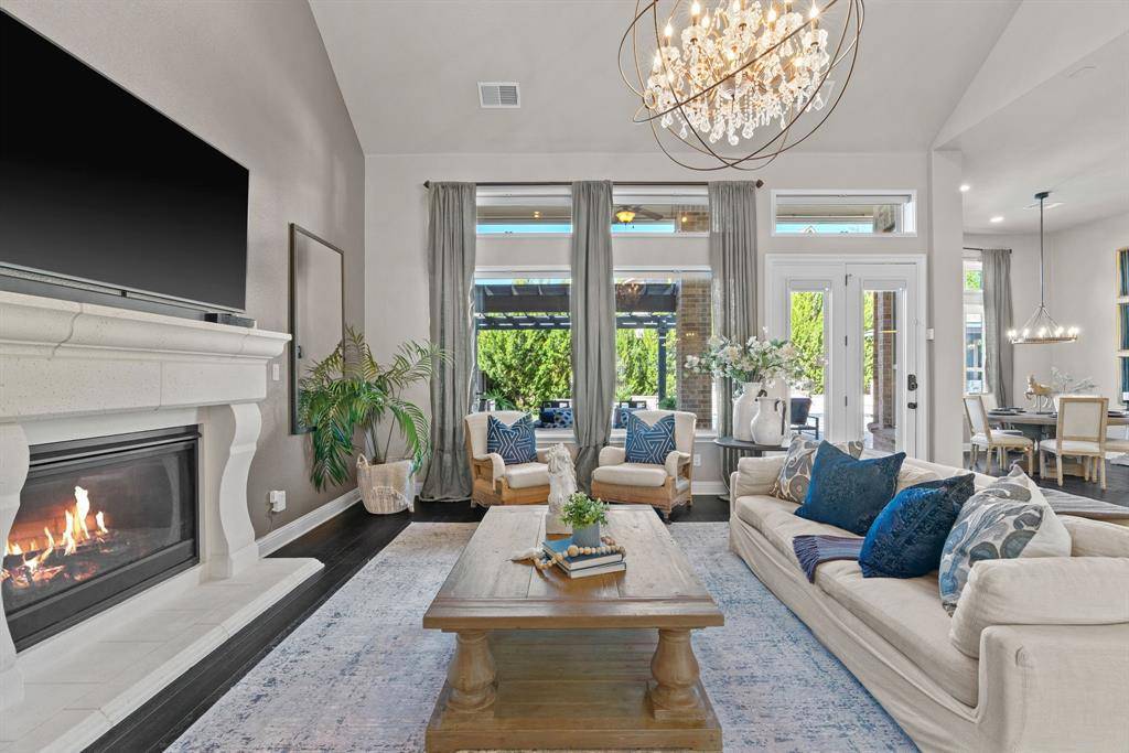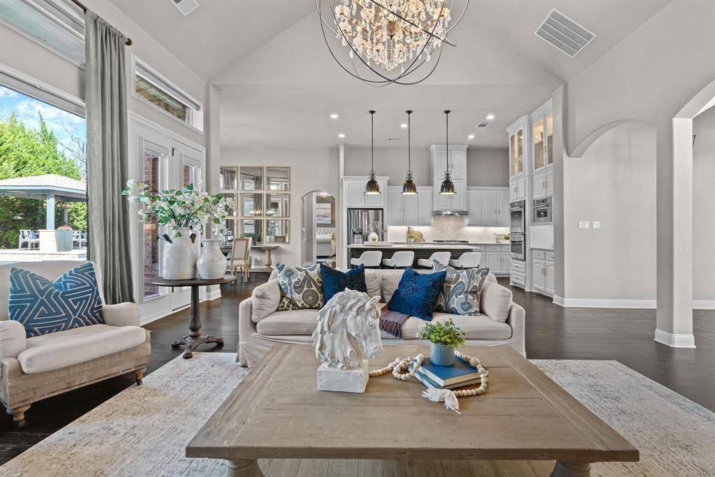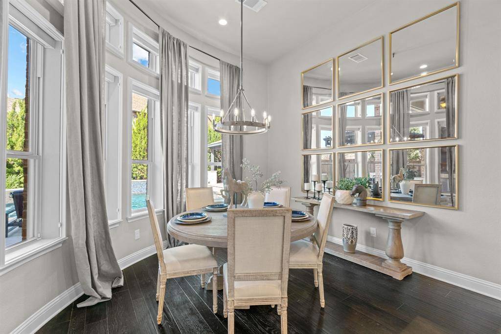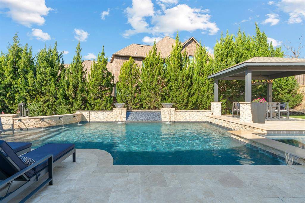 WOW! Luxury living meets resort-style outdoor paradise in this stunning home on an oversized corner homesite in Canyon Falls. From the moment you arrive, the custom wrought iron front door and elegant hardwood floors set the tone for the exceptional design throughout. The heart of the home is the incredible chef's kitchen featuring abundant cabinetry, expansive countertops, a spacious island, and a dedicated home planning center or office, perfect for work, homework, or everyday organization. The kitchen flows seamlessly into the open-concept living and dining areas, creating the perfect space for entertaining and everyday living with beautiful natural light and designer lighting throughout. The private primary retreat offers dual walk in closets and a spa inspired bath designed for relaxation. The first floor also features a guest suite, office and dining room, while three additional bedrooms, media and family room upstairs provide plenty of space for family and guests. Step outside to your backyard oasis designed for both entertaining and unwinding. Enjoy the resort style pool and spa, a cabana surrounded by mature trees, and a spacious covered patio complete with a built in grill,creating the ultimate outdoor living experience. Located in the highly sought after Canyon Falls community which features tons of amenities including walking and biking trails, community pool, parks, gym and ARGYLE ISD elementary school and high-school. Location is fantastic with great access to I-35, 377, 1171 and close to Liberty Christian Private School. This home is truly what you've been waiting for.