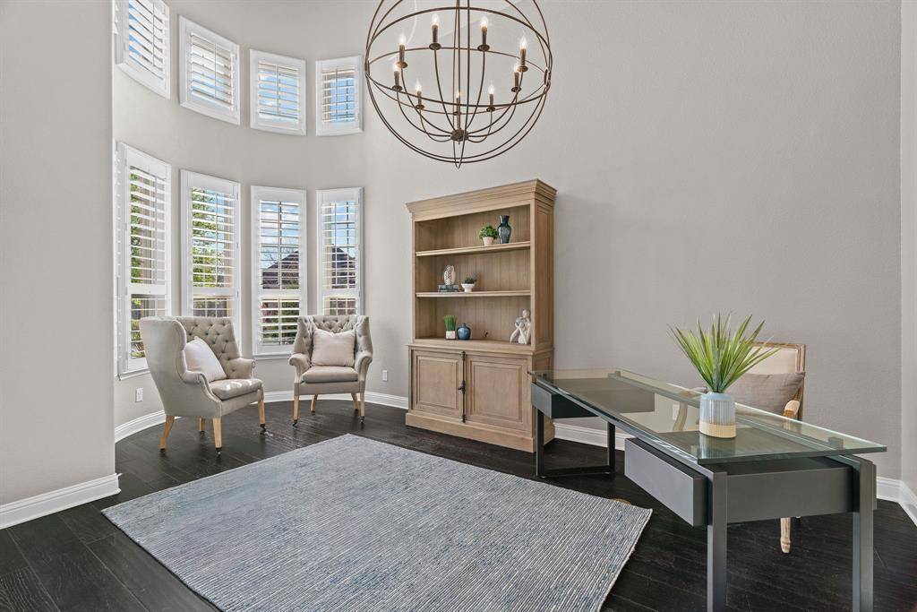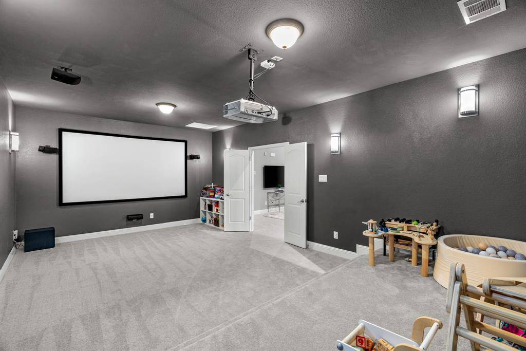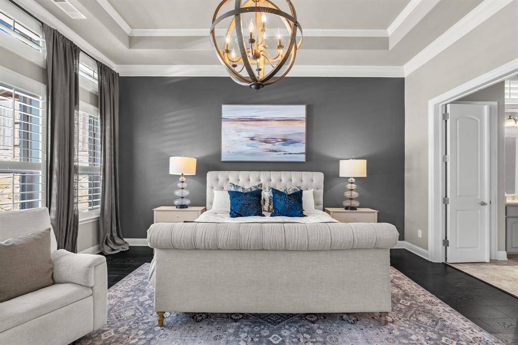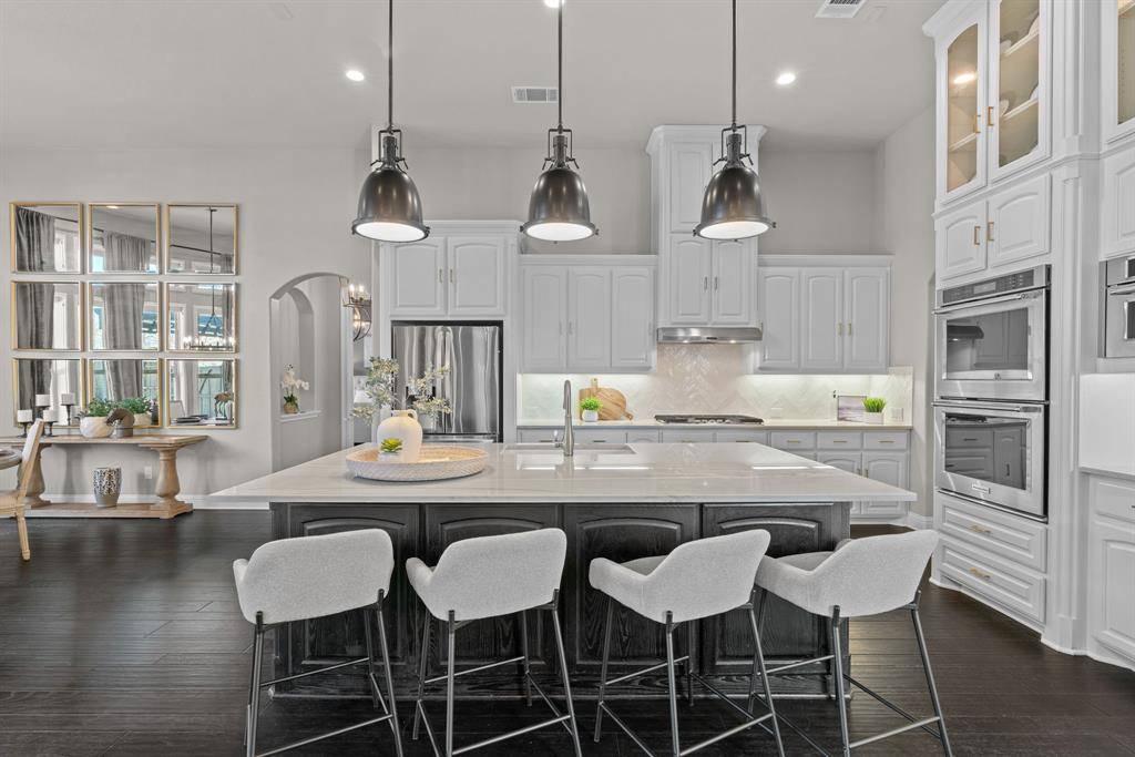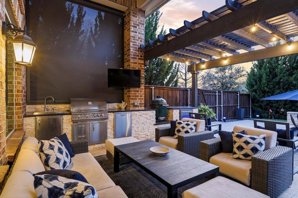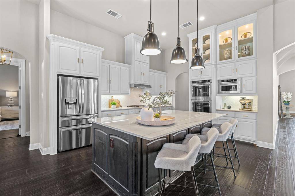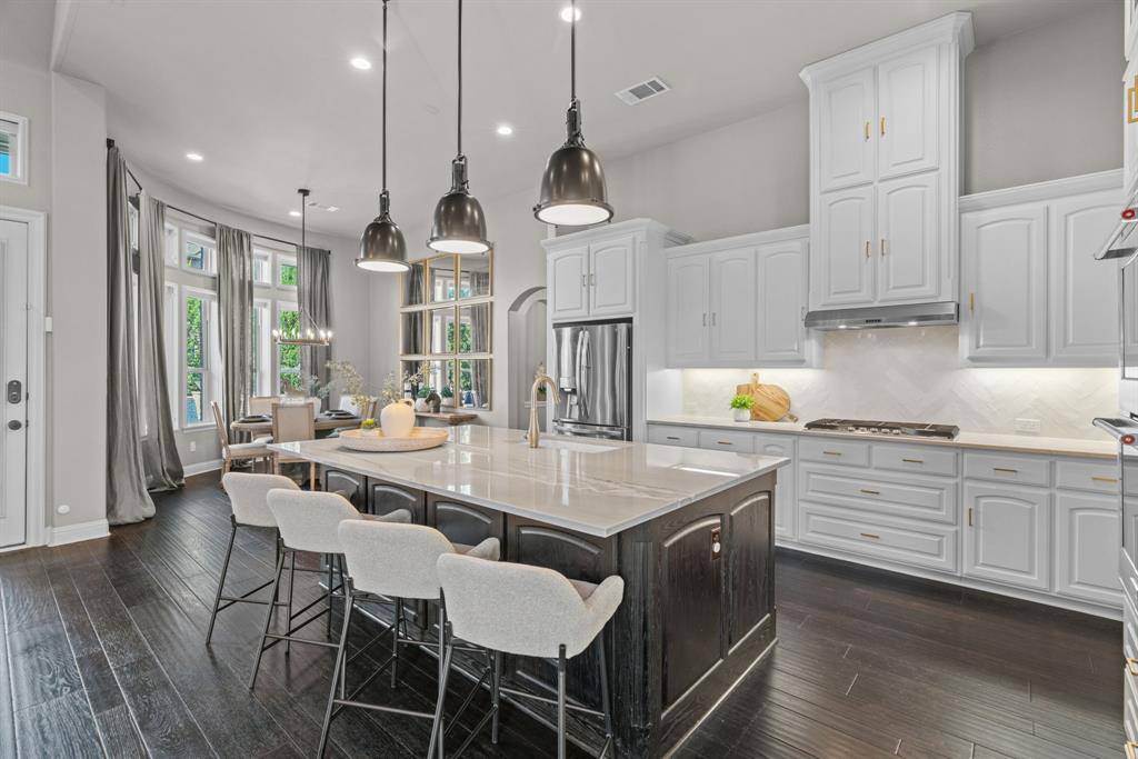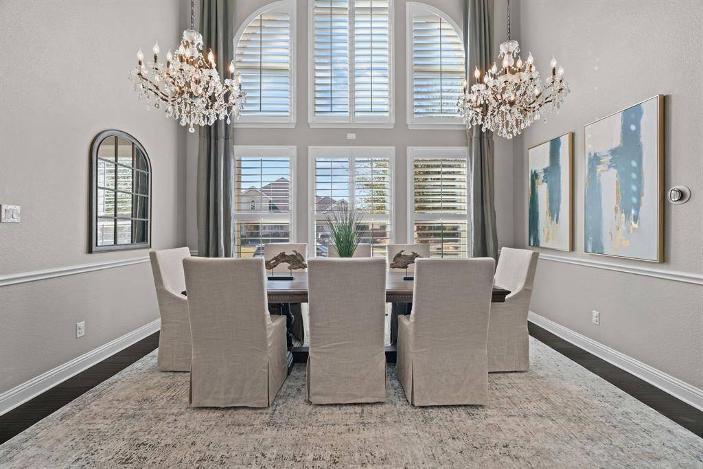 WOW! Luxury living meets resort-style outdoor paradise in this stunning home on an oversized corner homesite in Canyon Falls. From the moment you arrive, the custom wrought iron front door and elegant hardwood floors set the tone for the exceptional design throughout. The heart of the home is the incredible chef's kitchen featuring abundant cabinetry, expansive countertops, a spacious island, and a dedicated home planning center or office, perfect for work, homework, or everyday organization. The kitchen flows seamlessly into the open-concept living and dining areas, creating the perfect space for entertaining and everyday living with beautiful natural light and designer lighting throughout. The private primary retreat offers dual walk in closets and a spa inspired bath designed for relaxation. The first floor also features a guest suite, office and dining room, while three additional bedrooms, media and family room upstairs provide plenty of space for family and guests. Step outside to your backyard oasis designed for both entertaining and unwinding. Enjoy the resort style pool and spa, a cabana surrounded by mature trees, and a spacious covered patio complete with a built in grill,creating the ultimate outdoor living experience. Located in the highly sought after Canyon Falls community which features tons of amenities including walking and biking trails, community pool, parks, gym and ARGYLE ISD elementary school and high-school. Location is fantastic with great access to I-35, 377, 1171 and close to Liberty Christian Private School. This home is truly what you've been waiting for.