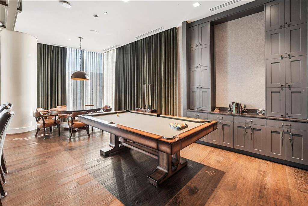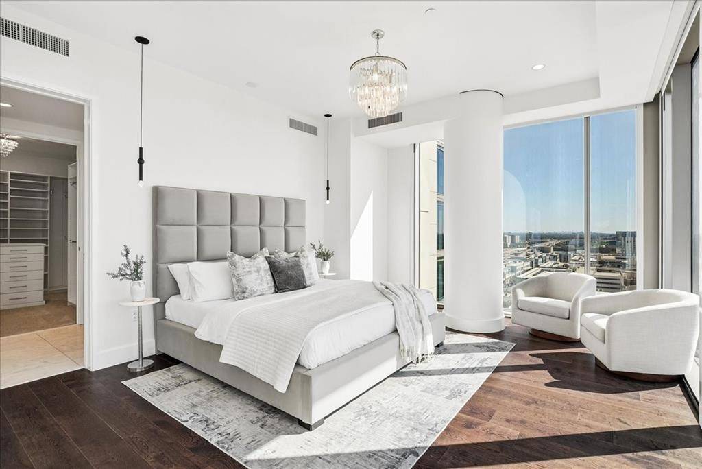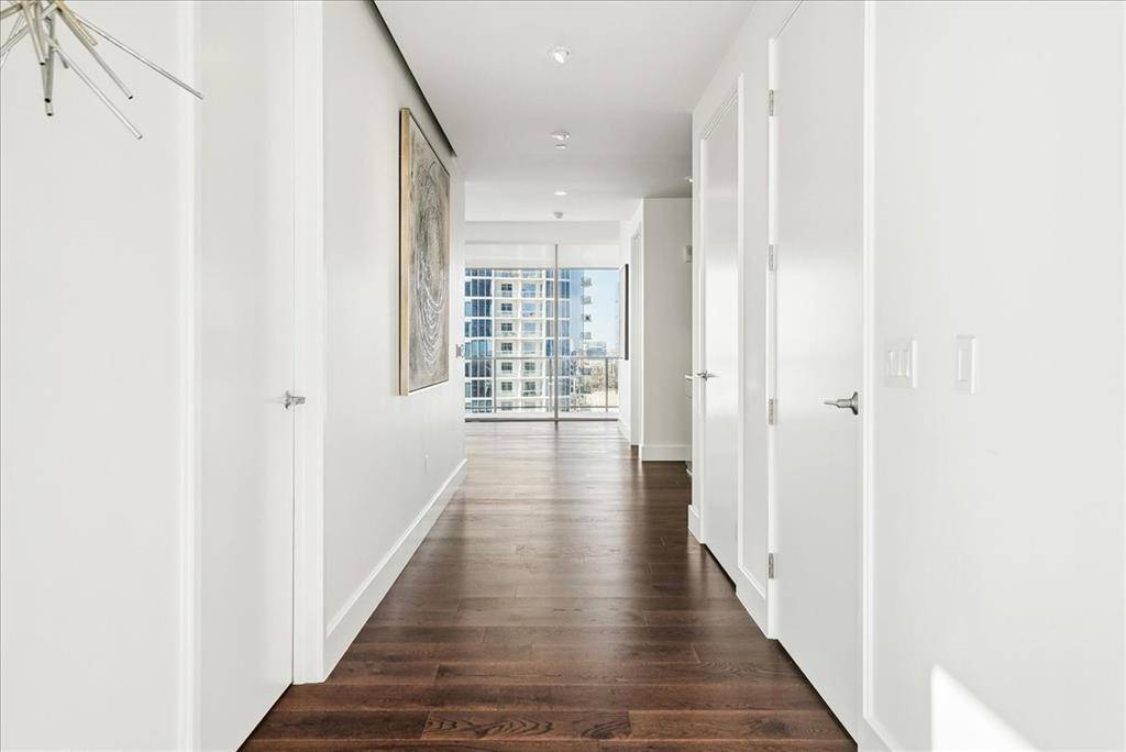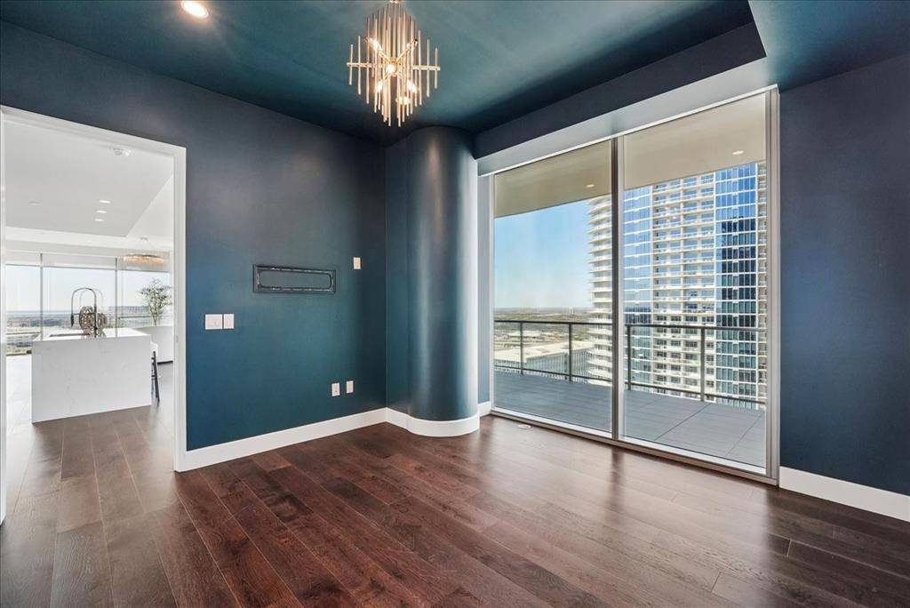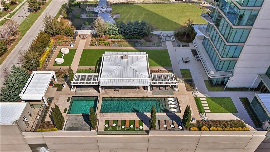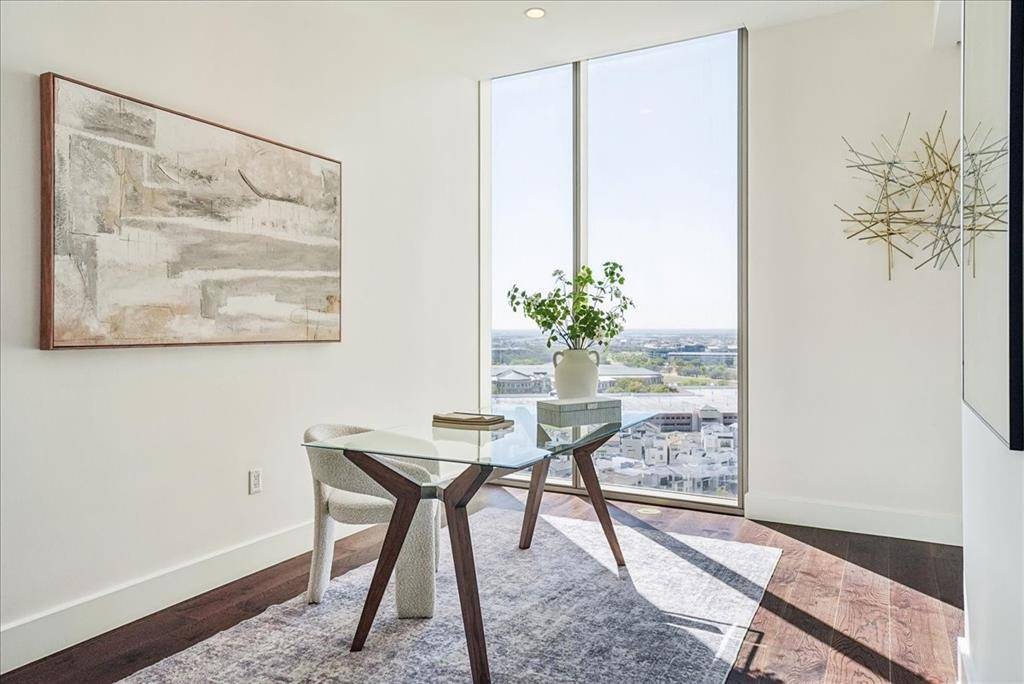 Windrose Tower is one of North Texas's most sought after communities. Situated high on the 17th floor, Residence 1701 showcases one of the building's most desirable vantage points with dramatic floor to ceiling windows framing breathtaking skyline and sunset views. Designed for entertaining and everyday comfort, the open concept floor plan seamlessly connects the living, dining, kitchen, and custom bar areas. The chef's kitchen features a striking quartzite waterfall island, custom cabinetry, Wolf and Sub Zero appliances, and a natural gas range- all positioned to capture the incredible views. The living area extends to a private balcony with a gas fireplace, perfect for enjoying morning coffee, golden hour sunsets, or city lights at night. The primary suite offers a peaceful retreat with a spa inspired bath featuring a soaking tub, oversized walk in shower, dual vanities, and a spacious custom closet. The secondary bedroom includes a private en suite bath with walk in shower and generous closet space. Designer finishes, hardwood floors, soaring ceilings, curated lighting, motorized shades, and smart home integration elevate every detail. Thoughtful upgrades throughout make Residence 1701 stand apart from other units. The home also includes two reserved garage parking spaces and a private storage unit. Residents enjoy premier amenities including concierge services, valet parking, a resort style saltwater pool with cabanas, state of the art fitness center, golf simulator, conference rooms, two lounge areas for large gatherings, outdoor kitchens, landscaped terraces, pet spa, and two guest suites. Located steps from the shopping, dining, and entertainment of Legacy West with convenient access to major highways and close proximity to both DFW International Airport and Love Field. Windrose Tower isn't just keeping pace with luxury living, it is leading the way. Residence 1701 and its distinctive features place you at the center of an effortless lock and leave lifestyle.