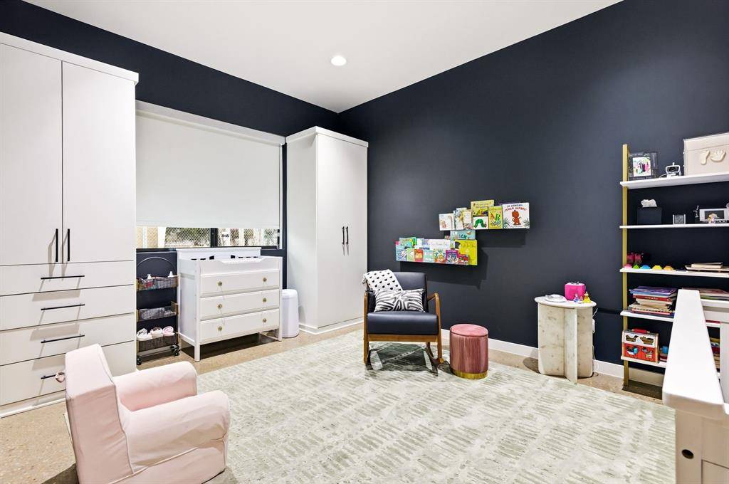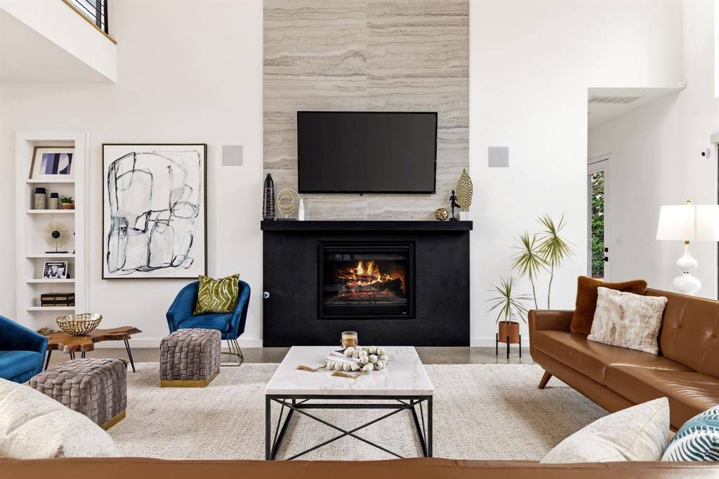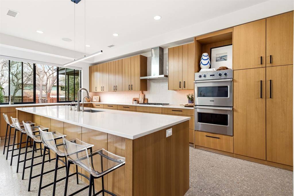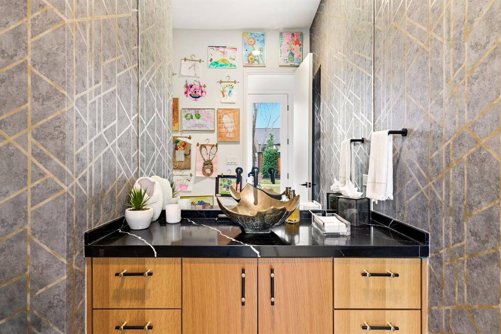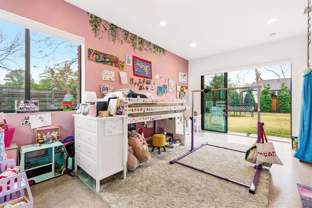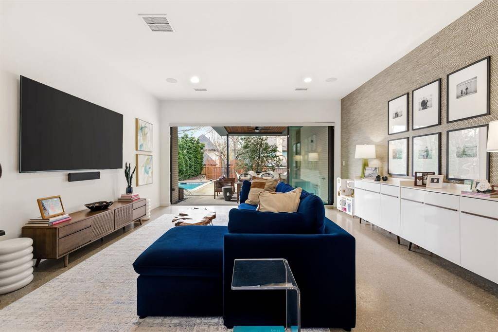 The home's centerpiece is a sprawling chef's kitchen, designed for connection. It features a unique serving window to the backyard and flows effortlessly into an open dining area and family room anchored by soaring, two-story ceilings. On beautiful Texas days, retractable sliding glass doors disappear to reveal a private, resort-style oasis. This outdoor sanctuary boasts an ozone purification pool, a sunken fire pit, and an outdoor kitchen with a built-in grill, all framed by multiple green spaces and a custom- built playhouse that architecturally mirrors the main