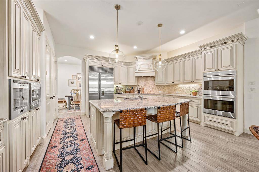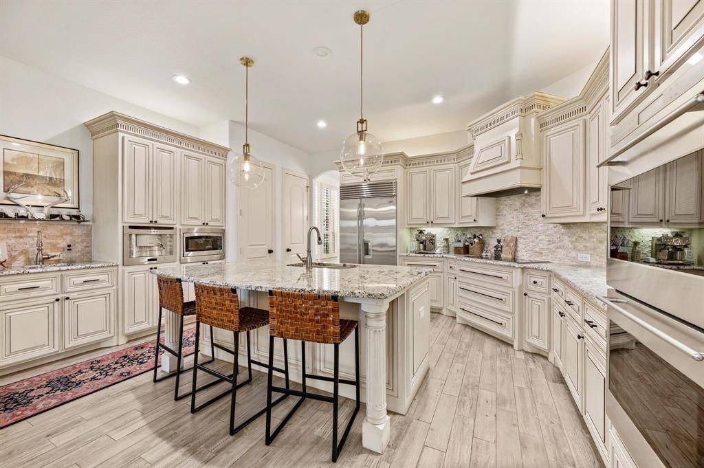 The gourmet kitchen is thoughtfully appointed with a wall of built ins, exotic granite countertops, a built in coffee maker and bar, integrated refrigerator, chef's induction cook top, double ovens, and a spacious island that seamlessly opens to the living area-ideal for both everyday living and entertaining.