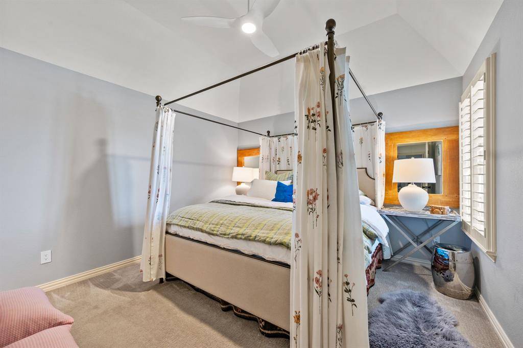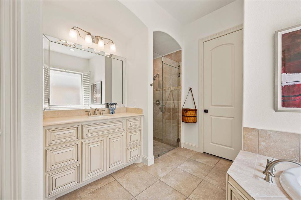 The main -level primary suite is filled with natural light and offers a spa-inspired bath complete with separate vanities, glass-enclosed shower, and a custom walk in closet.
