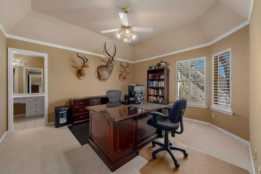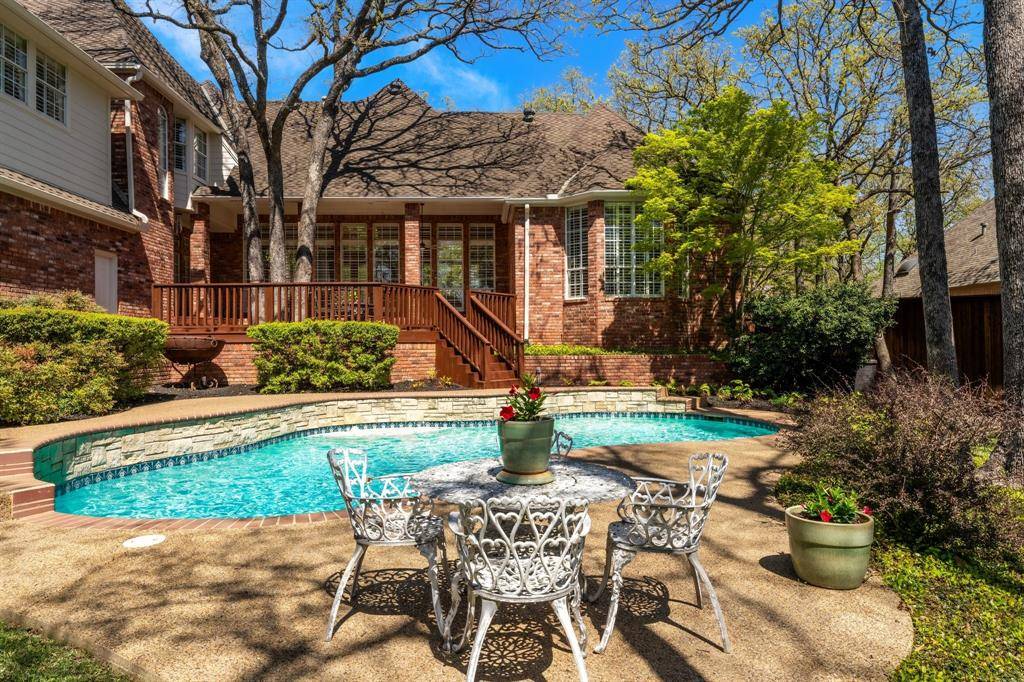 Welcome to 303 W Charlottesville— a true gem where timeless design, elegance, and an incredible backyard come together in the heart of Monticello, Colleyville. From the moment you step inside, soaring ceilings, rich wood floors, and a dramatic wall of windows create an immediate sense of space and warmth with an abundance of natural light. A striking floor-to-ceiling fireplace anchors the main living area, while custom woodwork and built-ins add character you simply don't find in today's homes. The layout is both functional and inviting. The expansive great room with a focal point fireplace serves as main hub in this one-of-a-kind home flowing seamlessly into a bright, well-appointed kitchen featuring vaulted ceilings, double ovens, a new stainless-steel refrigerator, ample cabinetry, and a center island with prep sink. Two dining areas offer flexibility for everything from casual mornings to hosting guests. The primary suite is a true retreat with a sitting area, direct access to the outdoor deck, and a spacious bath with generous closet space. Three additional bedrooms offer versatility for family, guests, or a home office, each with private dressing areas and cedar closets in a Jack-and-Jill design. Step outside and you'll understand what makes this home special. A large deck overlooks a sparkling pool, surrounded by lush, professionally landscaped grounds, mature trees, river rock and sprawling flower beds, vibrant gardens—all creating a private, resort-style setting perfect for entertaining or unwinding. Additional highlights include a game room with dedicated craft space, custom shutters throughout, multiple entry doors including a convenient kitchen entry, and an oversized three-car garage for a large truck or SUV with built-ins and workspace. Located near top-rated schools, parks, trails, tennis courts, lakes, shopping, and dining—homes like this, with this lot and level of care, rarely come available.