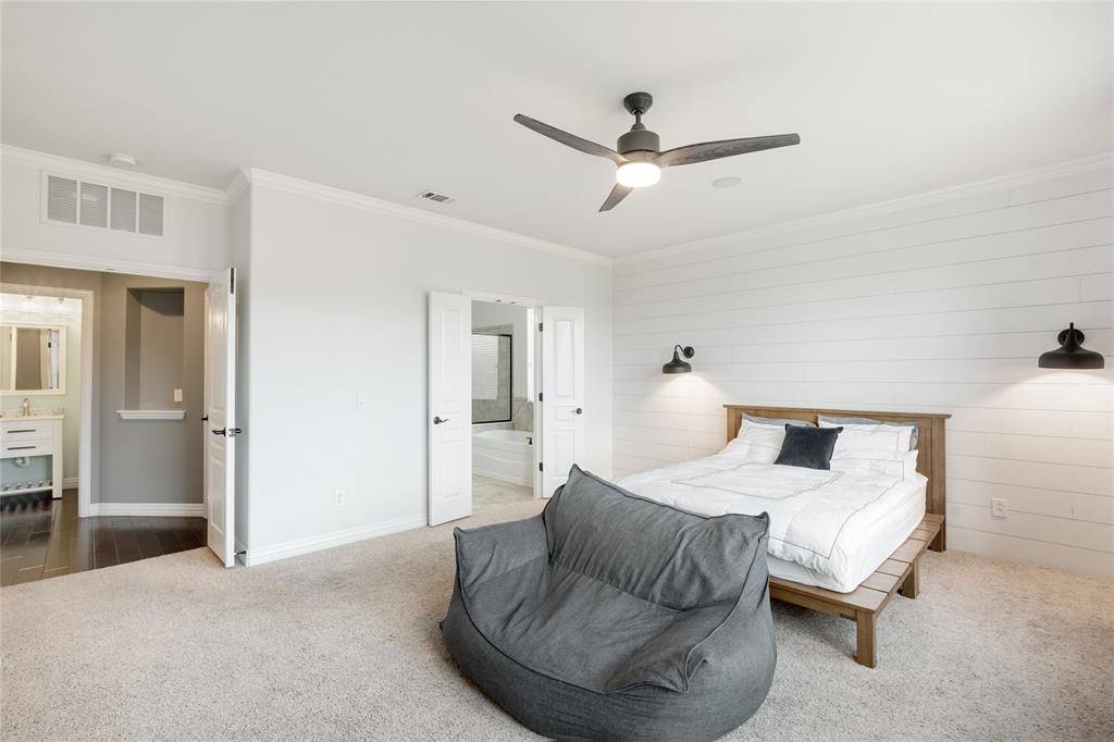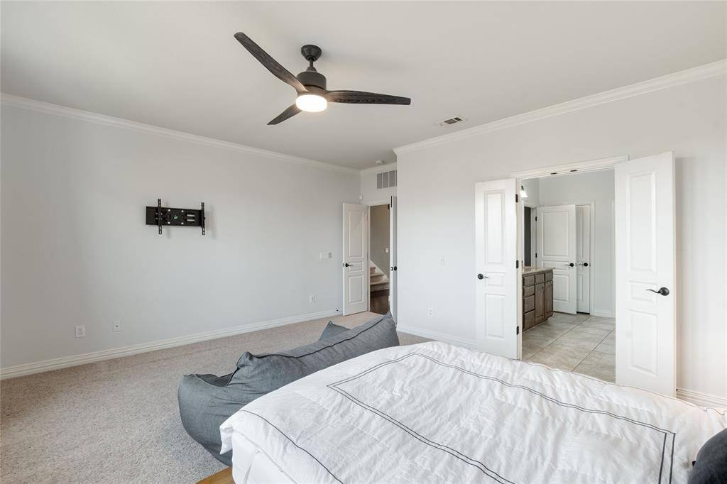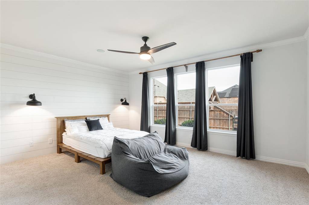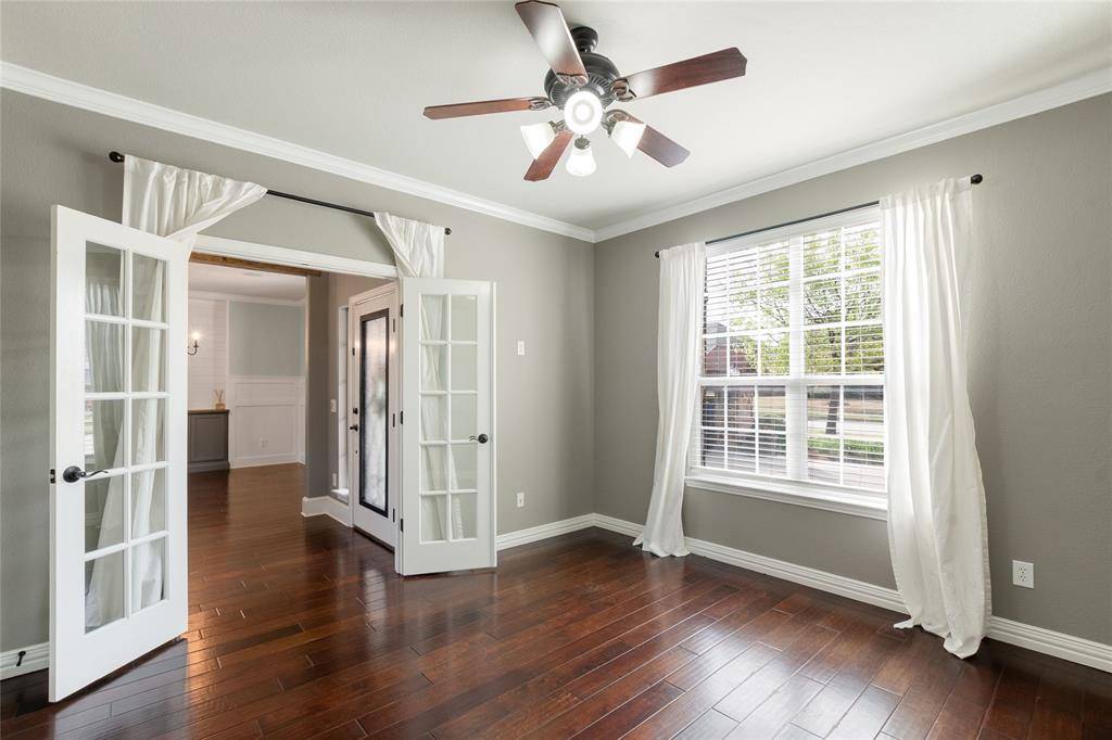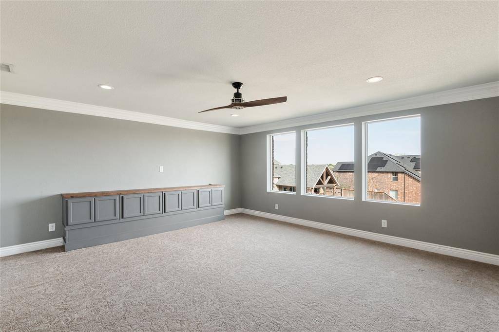 A private study with French doors provides an ideal work-from-home space. Upstairs features a large game room, media room with dry bar, and generously sized secondary bedrooms, each with walk-in closets.