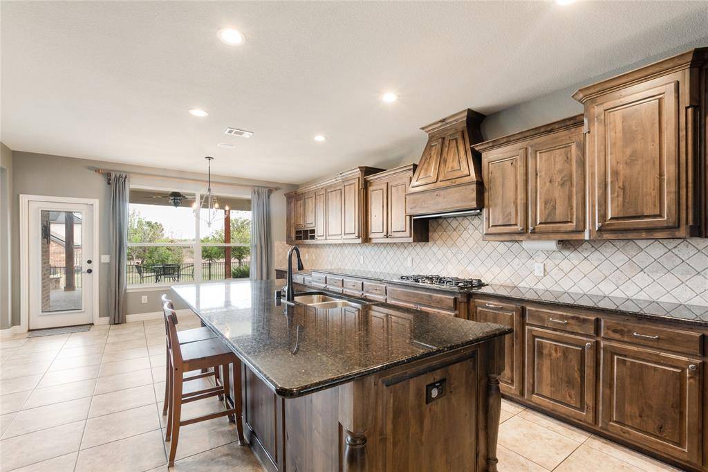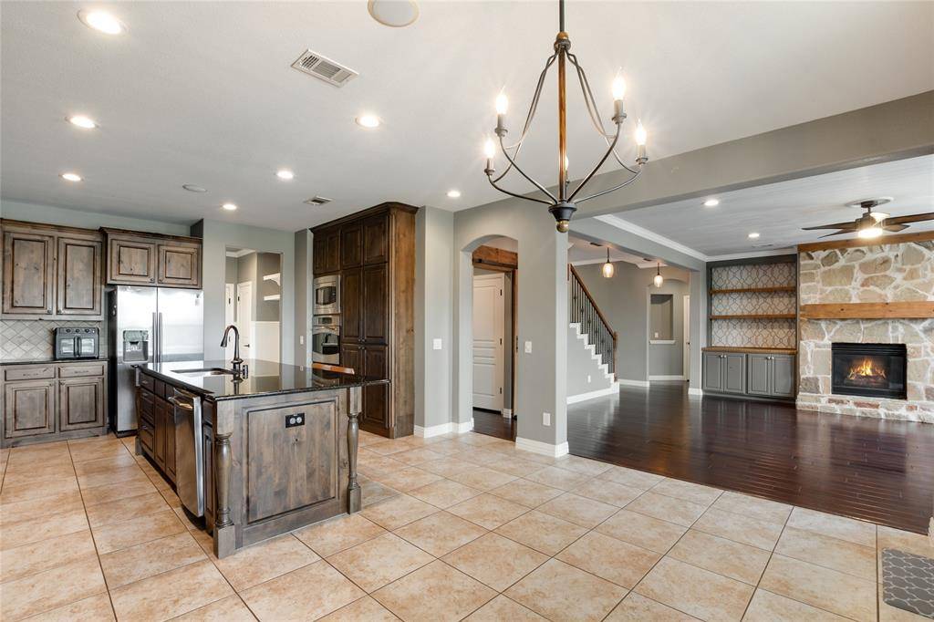 The spacious living area showcases a floor-to-ceiling stone fireplace, custom built-ins, and a beamed ceiling, seamlessly connecting to the kitchen and breakfast areas. The kitchen is equipped with a 5-burner gas cooktop, granite countertops, stainless steel appliances, large island, and ample cabinetry, along with a butler's pantry for added convenience.