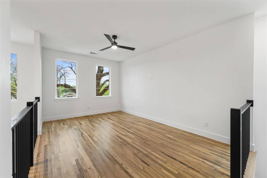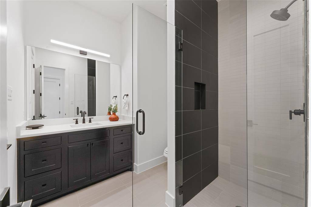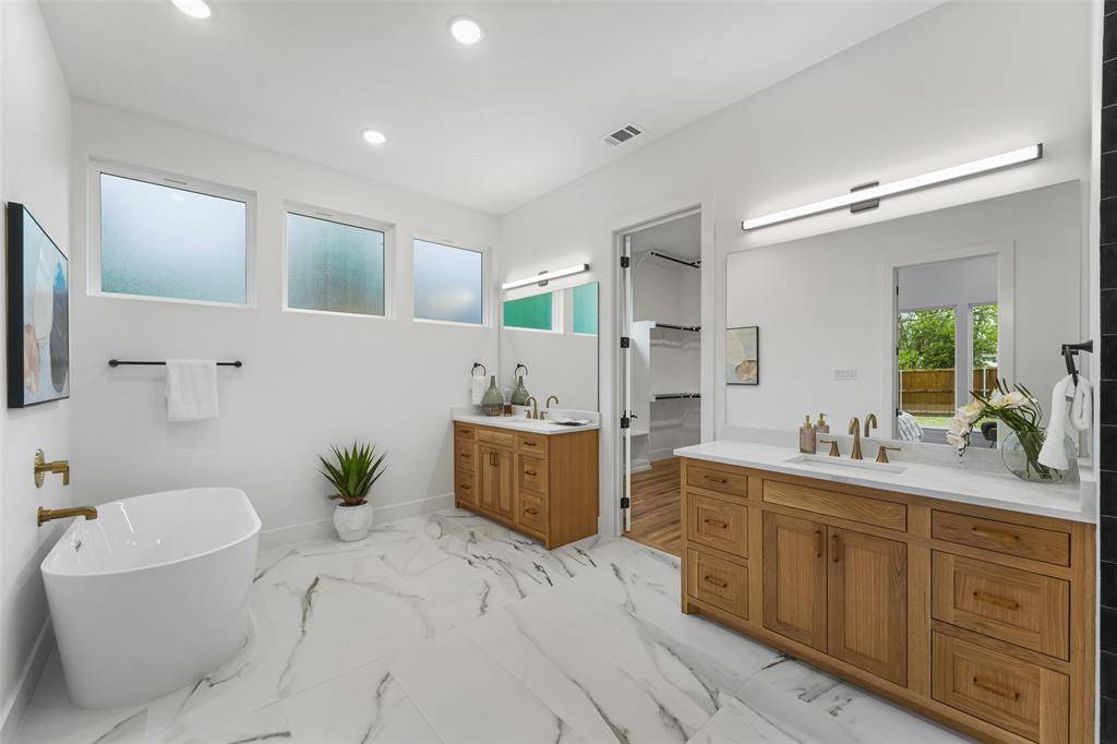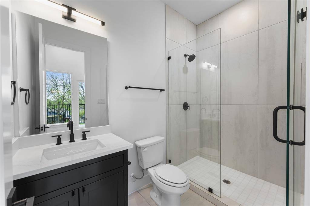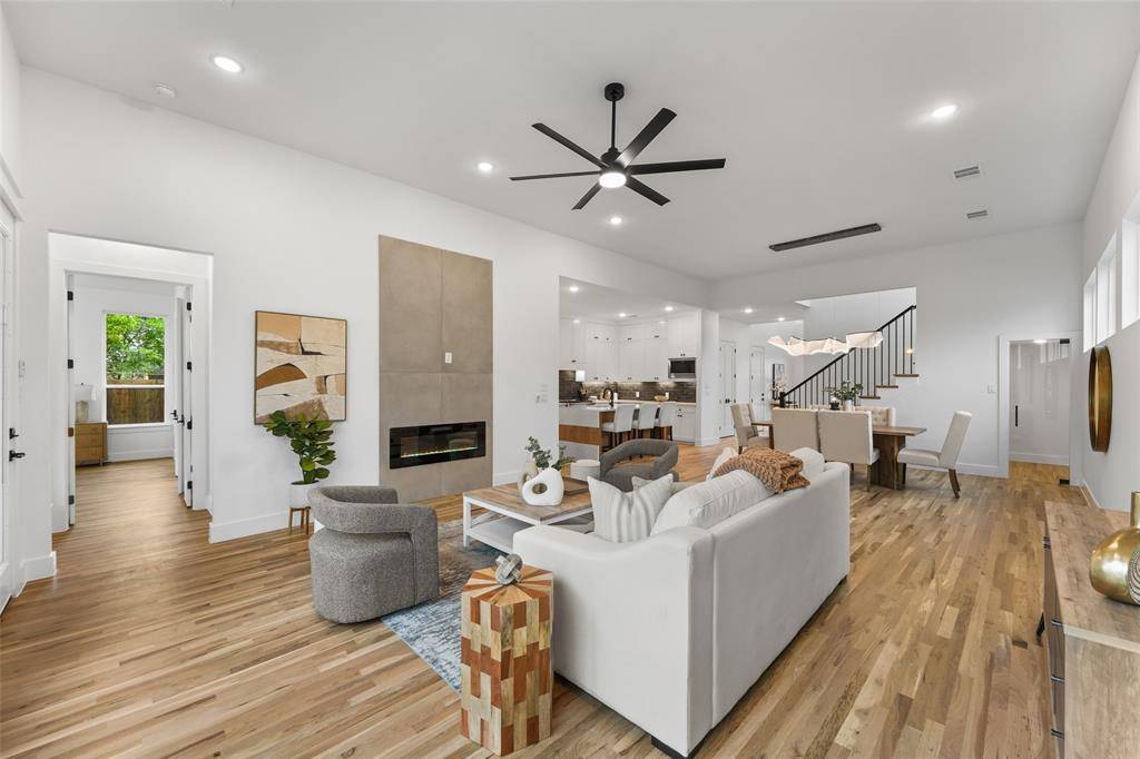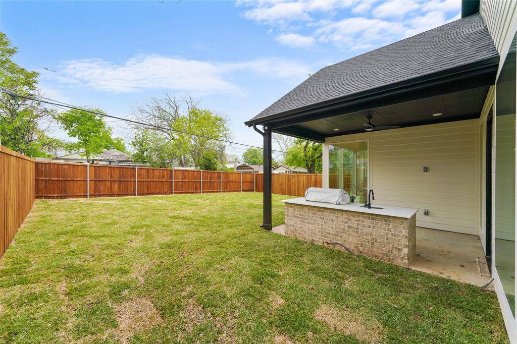 Step into this SHOWSTOPPING modern living custom residence featuring a dramatic 21-foot foyer anchored by a striking steel pivot entry door with glass panels and chevron wood flooring detail. The striking exterior is complemented by oversized horizontal picture windows with sleek black frames, a balcony adorned with cedar wood creating a bold architectural presence. Massive floor to ceiling windows throughout that fill the home with natural light. Inside, enjoy natural-finish white oak hardwood floors throughout and an open-concept layout. The chef's kitchen offers a waterfall quartz island, floor-to-ceiling cabinetry, white oak accents, walk-in pantry, and a professional-grade stove. Designer under-stair wine storage with a glass enclosure that doubles as a statement feature.Spacious living and dining areas feature nearly 12-ft ceilings and a modern electric fireplace with porcelain tile surround. Primary suite includes cathedral ceilings, expansive windows, and a spa-inspired bath with freestanding tub, oversized walk-in shower with dual heads, and custom walk-in closet. A front studio with full bath provides flexible space for office or guests. Upstairs features a second living area, additional bedrooms—including one with cathedral ceilings and private balcony—and a full bath. Enjoy outdoor living with a covered patio, built-in grill, sink, and outdoor kitchen. Additional highlights include a 3-car tandem garage, tankless water heater, foam insulation, solid wood interior doors, high-end fixtures, and irrigation system. Located in the heart of Oak Cliff, just minutes from Downtown Dallas and the Bishop Arts District—offering the perfect blend of convenience and culture. This one will move fast! I mean, it's an A&B Custom Home.