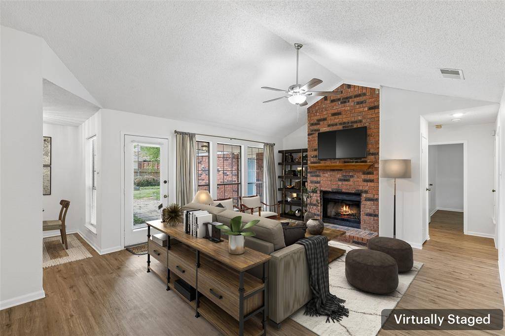 Rare opportunity in Coppell! This beautifully updated 3-bedroom, 2-bath residence offers a warm and inviting atmosphere from the moment you enter. The welcoming living room features a soaring vaulted ceiling and a striking brick fireplace, creating a comfortable and central gathering space. The spacious eat-in kitchen is designed for both everyday living and entertaining, complete with built-in appliances, generous storage, ample preparation space, and a bright breakfast nook filled with natural light. A formal dining room provides additional flexibility, ideal for hosting gatherings or special occasions. The primary bedroom serves as a relaxing retreat with its vaulted ceiling, ensuite bath featuring dual sinks, and a walk-in closet. Secondary bedrooms are well-sized and offer versatile use to meet a variety of needs. Enjoy the private backyard oasis, complete with a patio and lush landscaping—perfect for outdoor relaxation or entertaining. Washer, Dryer, and refrigerator included. Thoughtfully updated and well-maintained, this home combines comfort, functionality, and style in a highly desirable location. Great location with many nearby parks, shopping, and dining options. 3D tour available online!