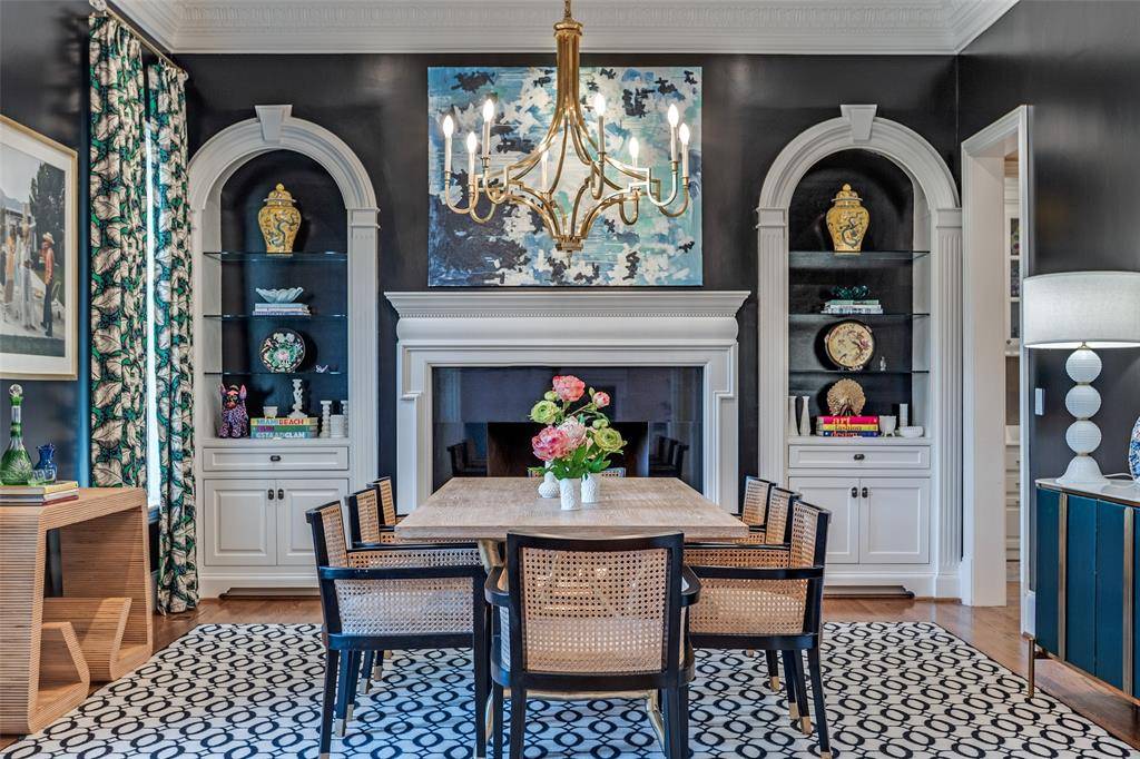 Defined by soaring 12 foot ceilings on both the 1st and 2nd levels and rich hardwoods throughout, the home opens to a stunning formal living and impeccably styled dining room — each anchored by its own fireplace.