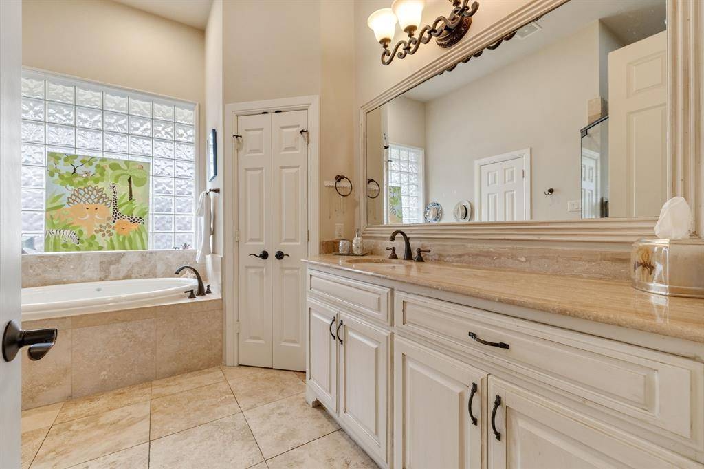 The light filled floorplan features rich hardwood floors, a welcoming entry with formal living and dining rooms, and a comfortable secondary living space that opens to the backyard and breakfast area. The kitchen is well equipped with a large center island, double ovens, warming drawer, two sinks, a walk in pantry, and a JennAir side by side refrigerator.