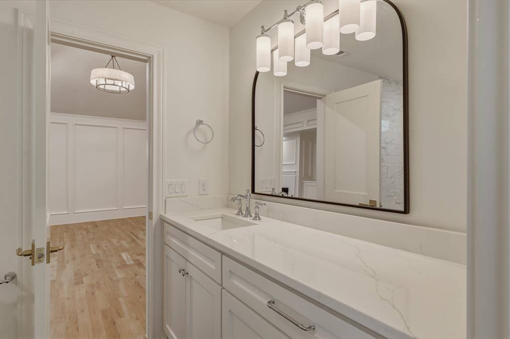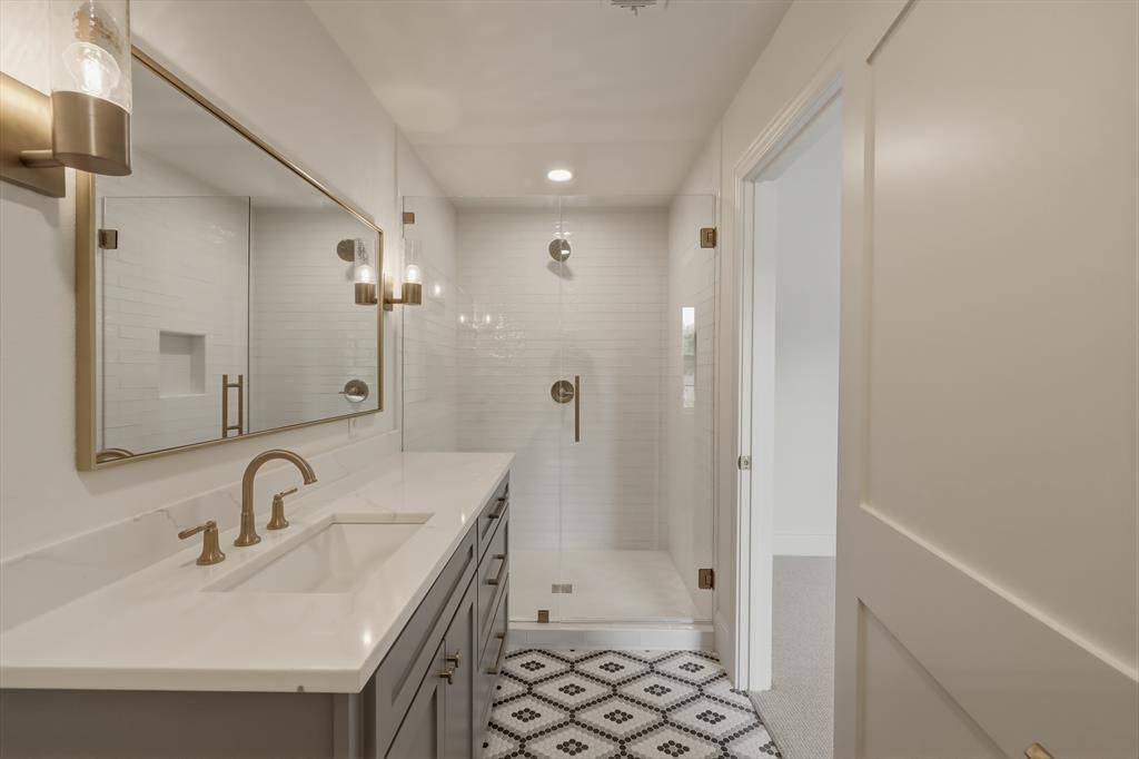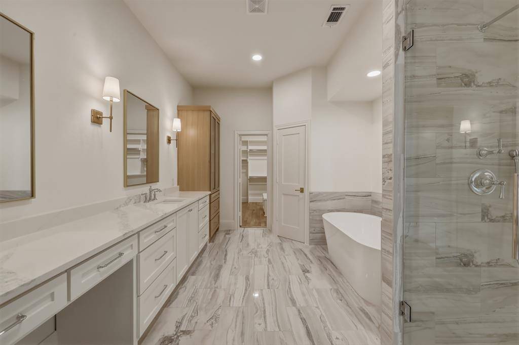 The spacious primary suite located on the main level, provides a peaceful retreat with room for a sitting area. The spa-inspired primary bath is a standout feature, centered around an impressive walk-through shower with dual glass doors—one on each side—creating a seamless flow and a striking architectural moment. Each side of the bathroom is thoughtfully designed with its own separate vanity area, offering true his-and-her functionality, abundant storage, and a sense of personal space. Additional bedrooms offer flexibility for guests, a home office, or hobbies.
