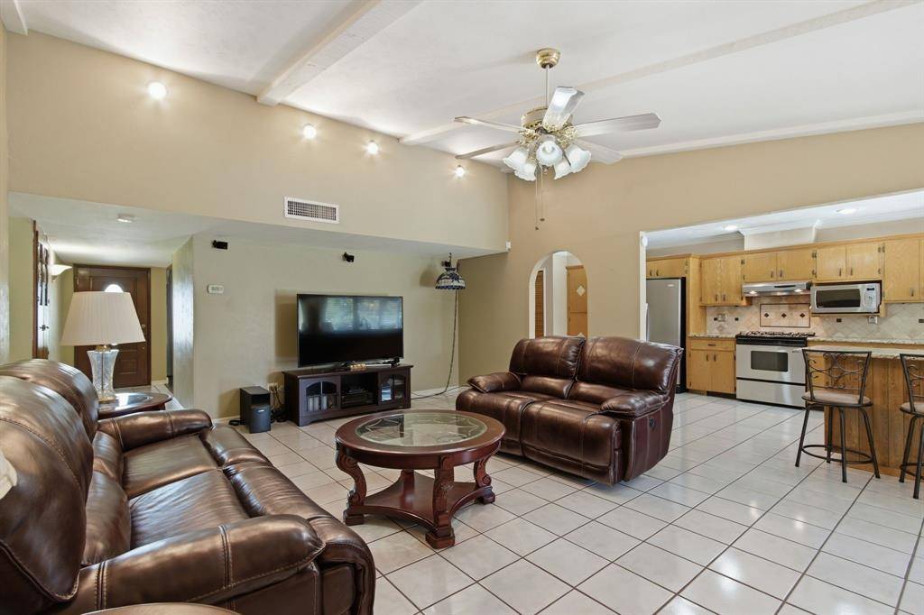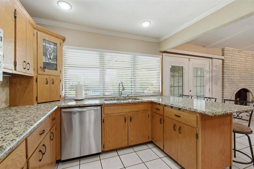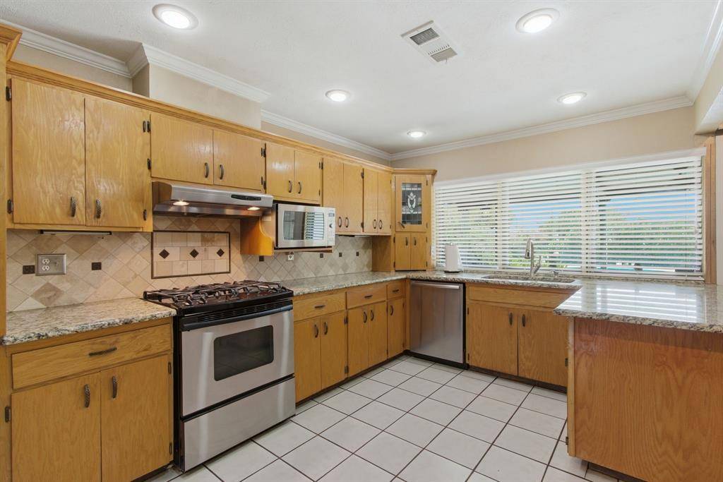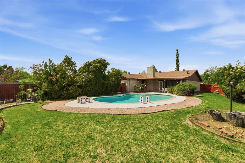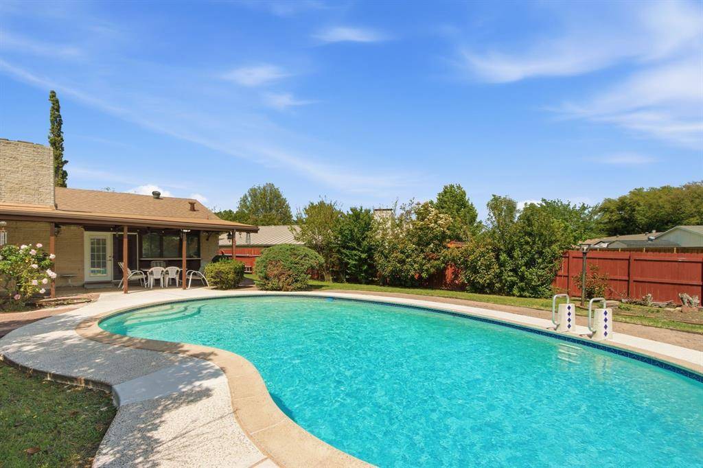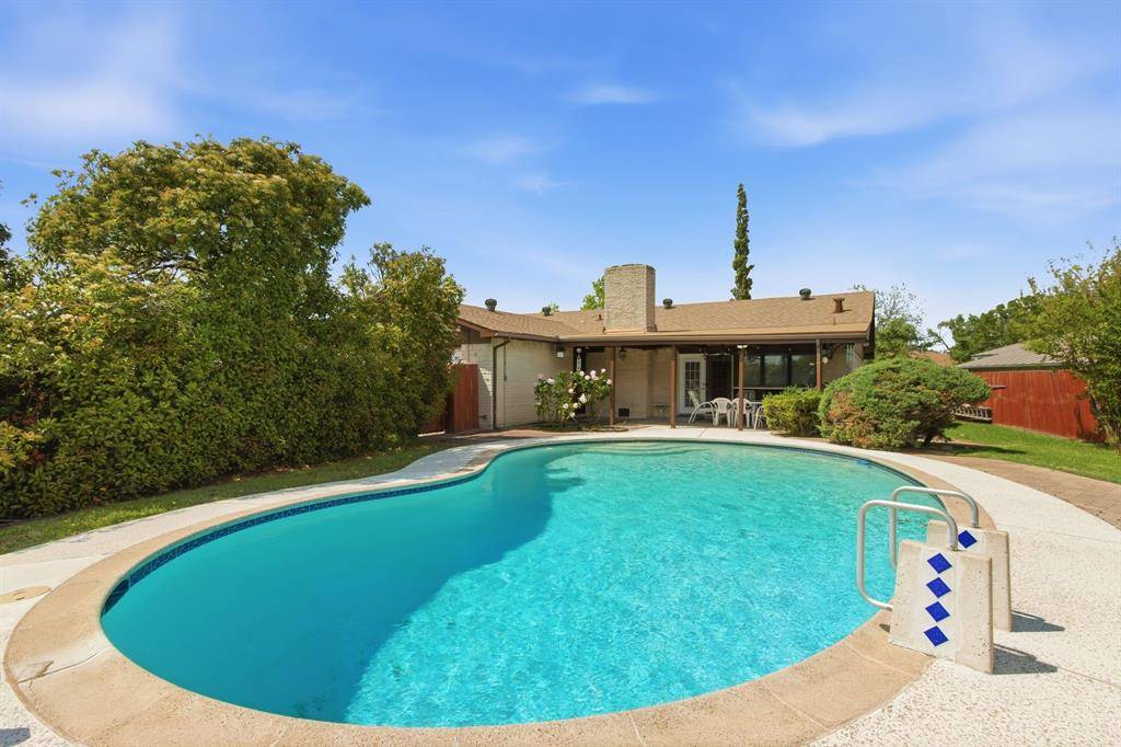 Welcome to this beautifully maintained home nestled on an oversized, pie-shaped 0.346-acre lot in the desirable Woodlake Subdivision! Designed for both comfort and entertaining, this property features a stunning backyard retreat complete with a sparkling swimming pool, recently repaired with updated coping and tile, and professionally maintained by a pool service. Enjoy relaxing or hosting guests under the covered outdoor living area, with plenty of additional space including a large detached shed. Inside, the home offers 3 bedrooms and 2 baths with a functional and inviting layout. A front living room and adjacent dining area greet you upon entry, perfect for more formal gatherings. The spacious family room features a cozy fireplace with hearth as its focal point and opens seamlessly to the kitchen—ideal for everyday living and entertaining. The kitchen is well-equipped with a gas cooktop, microwave, Bosch dishwasher, and refrigerator, along with ample space and windows that provide beautiful views of the backyard oasis. Throughout the home, you'll find hard surface flooring, including rich hardwoods and tile, offering both style and easy maintenance. This home truly combines indoor comfort with exceptional outdoor living—perfect for enjoying those hot Texas summers!