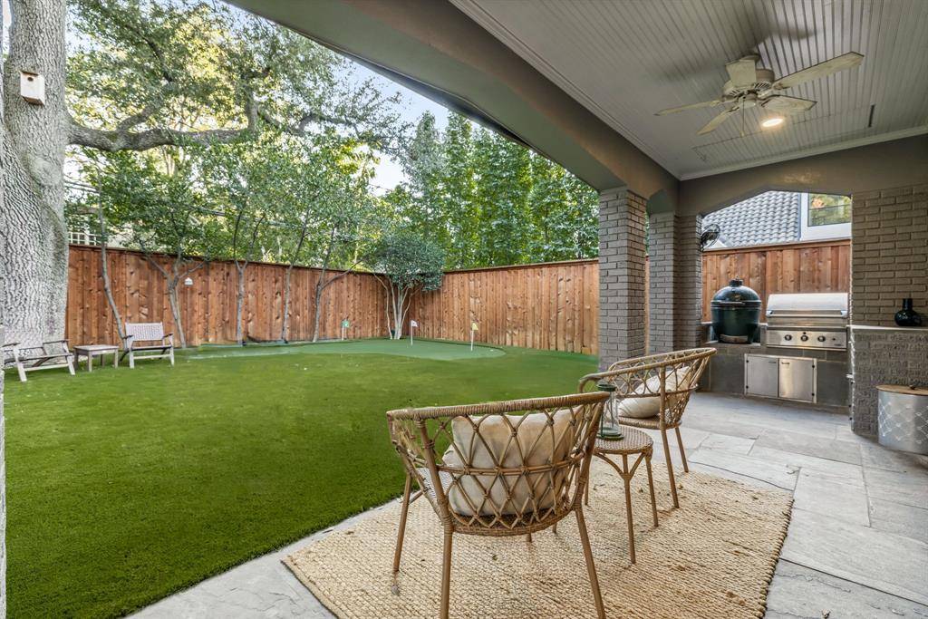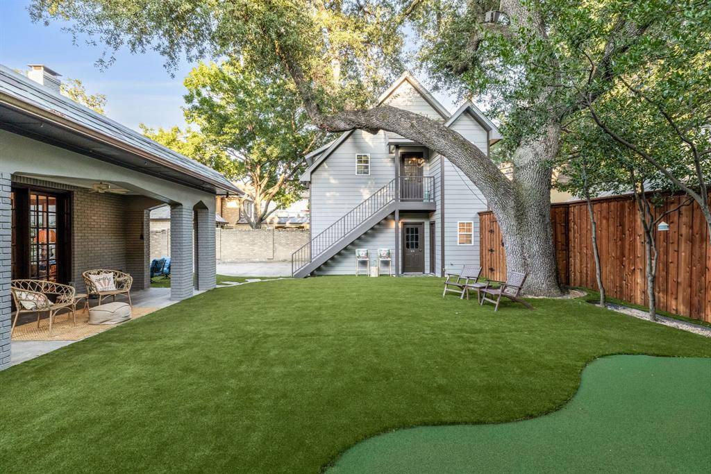 The outdoor spaces are equally captivating. A lush backyard features a covered patio and custom putting green, creating the perfect setting for relaxation, recreation, and entertaining beneath the shade of mature trees. Complementing the main residence, a detached two-car garage with private living quarters above offers flexibility for guests, extended family, or staff.