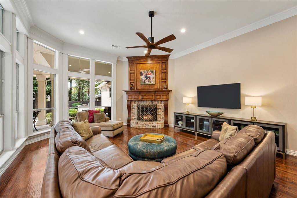 A grand staircase and herringbone wood floors make a striking first impression, gracefully framing the formal living and dining rooms. The formal living room features a see-through fireplace shared with the breakfast room, creating warmth and ambiance throughout the main level. A wet bar conveniently connects the kitchen and dining area, while the open kitchen, family, and breakfast rooms overlook a wall of windows framing the picturesque backyard.