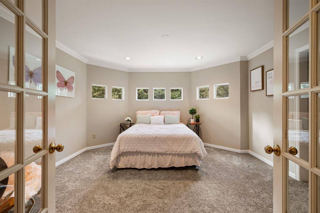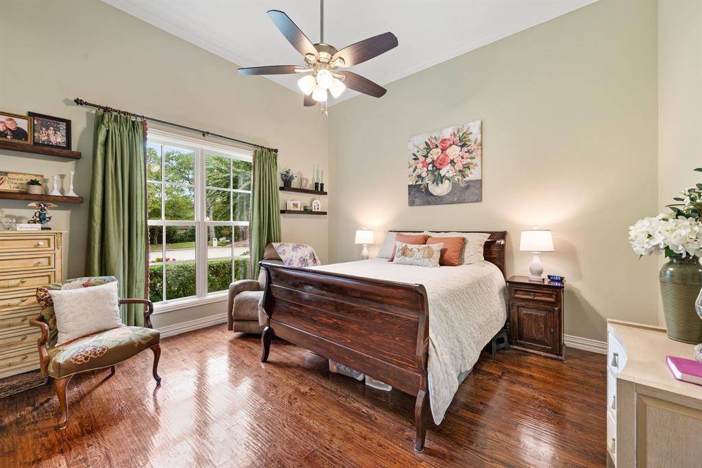 The primary suite serves as a private retreat with dual walk-in closets, a luxurious bath with soaking tub and separate walk-in shower, and a dedicated study accessible through a private wet bar. A first-floor guest suite with a full bath offers comfort and privacy for visitors.