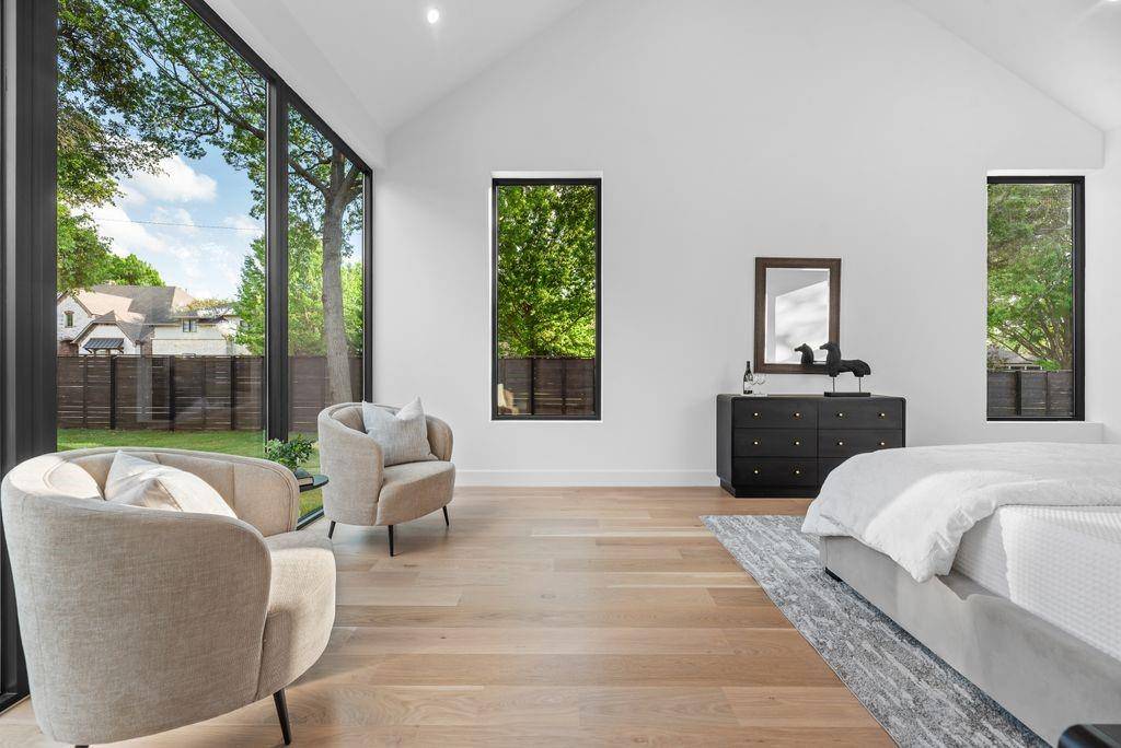 The exterior showcases a standing seam metal roof, custom fencing, and clean modern lines, while expansive 10' windows and sliding doors fill the home with natural light and seamlessly connect indoor and outdoor living. Inside, soaring ceiling heights elevate the space, with 11' ceilings in the main living areas and dramatic 16' to 18' gabled ceilings in the primary suite, office, workout room, and guest bedroom.