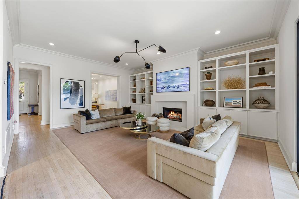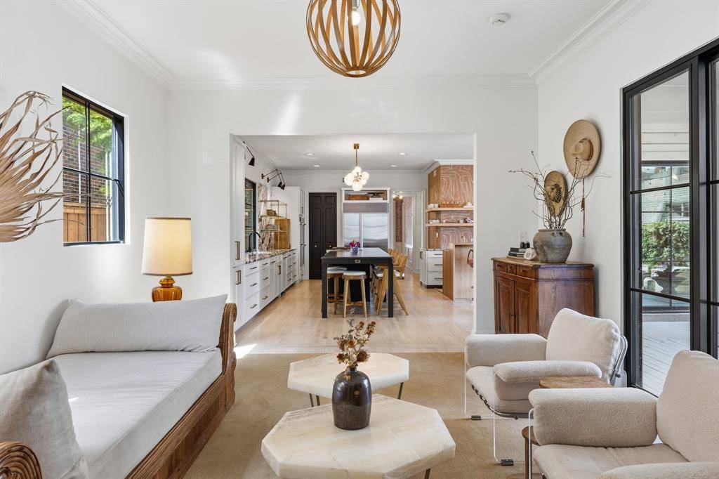 Light-filled living spaces open to the outdoors with all-new rear windows and expansive 10-foot sliding doors, creating seamless indoor-outdoor flow. Recent updates include re-stained hardwood floors, a remodeled fireplace with plaster finish, and designer wall coverings throughout.