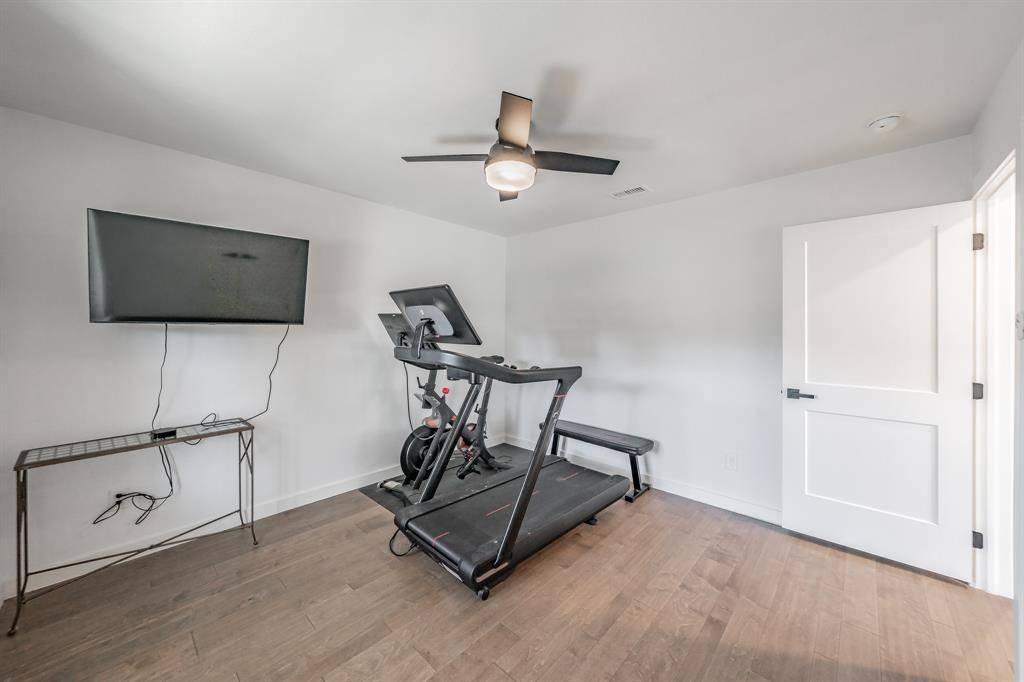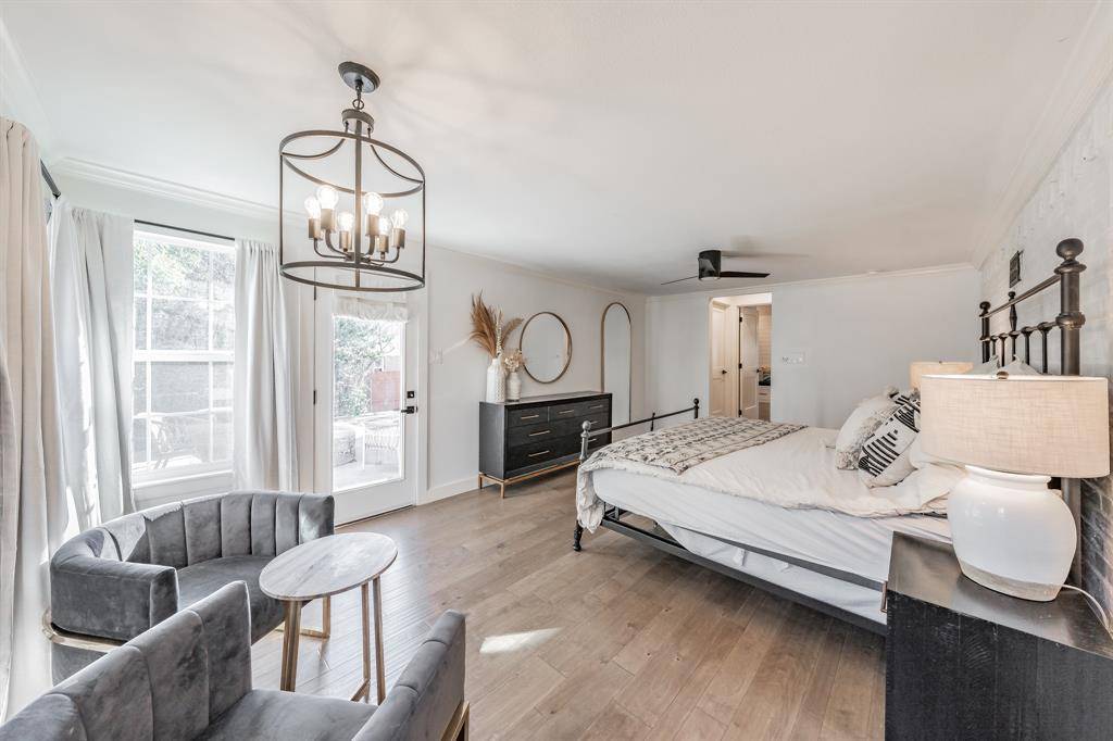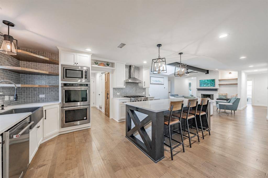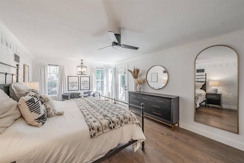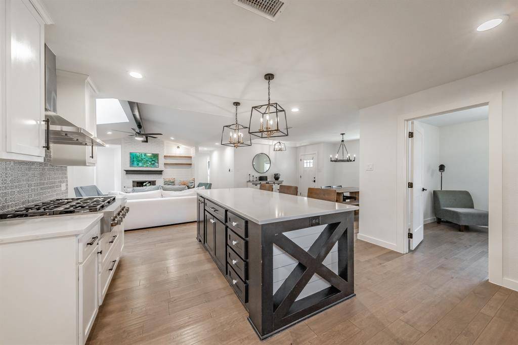 Inside, the renovation is thoughtful and thorough. The five bedrooms and three full baths are ready to support any family. The wide-plank engineered hardwood running throughout makes the house feel light and sophisticated. The main living room anchors around a white painted brick fireplace beneath an exposed beam and skylight — warm, architectural, and entirely original in character. A sun-filled master bedroom with white brick accent wall and a backyard view that goes on forever is an oasis.