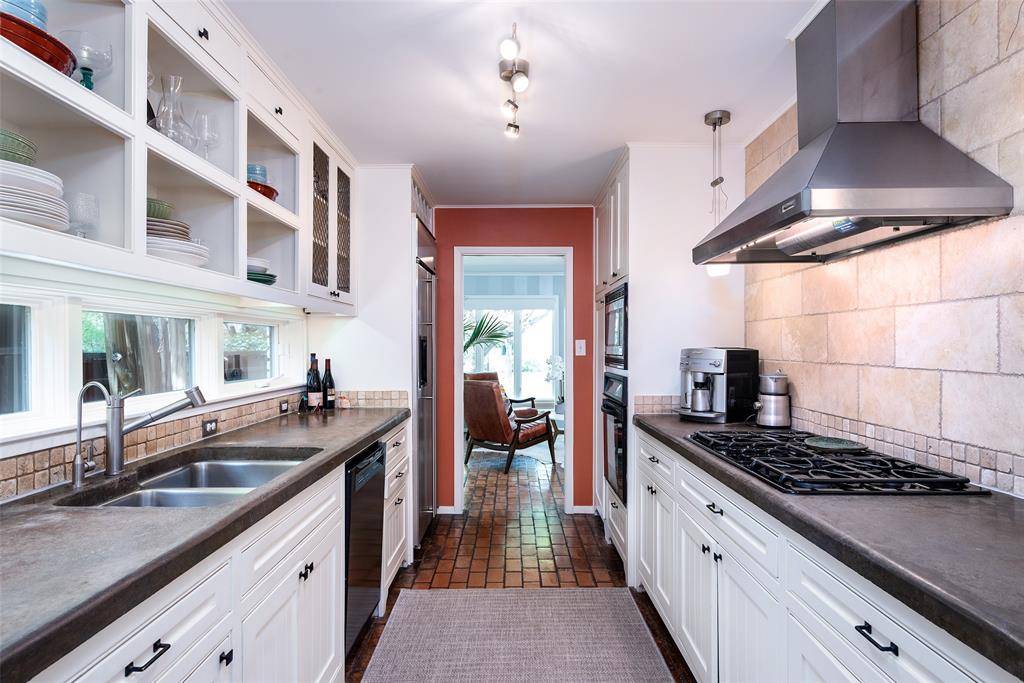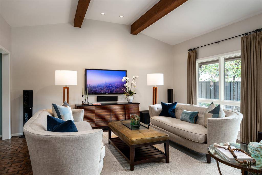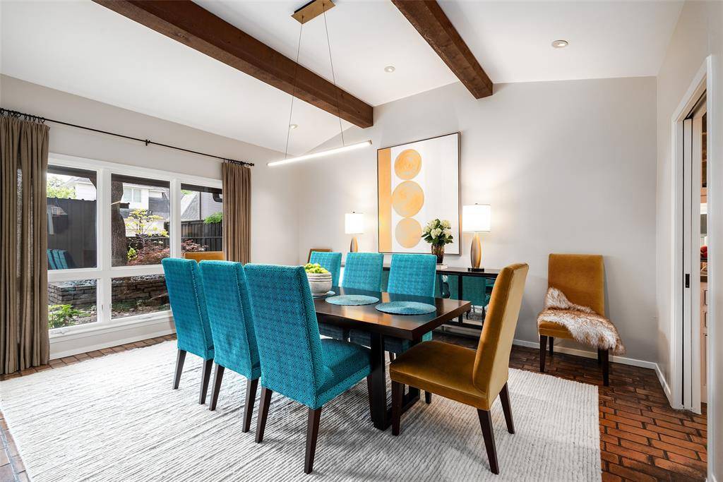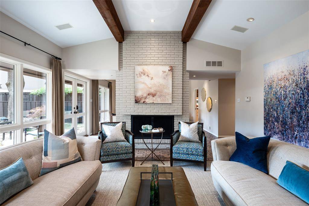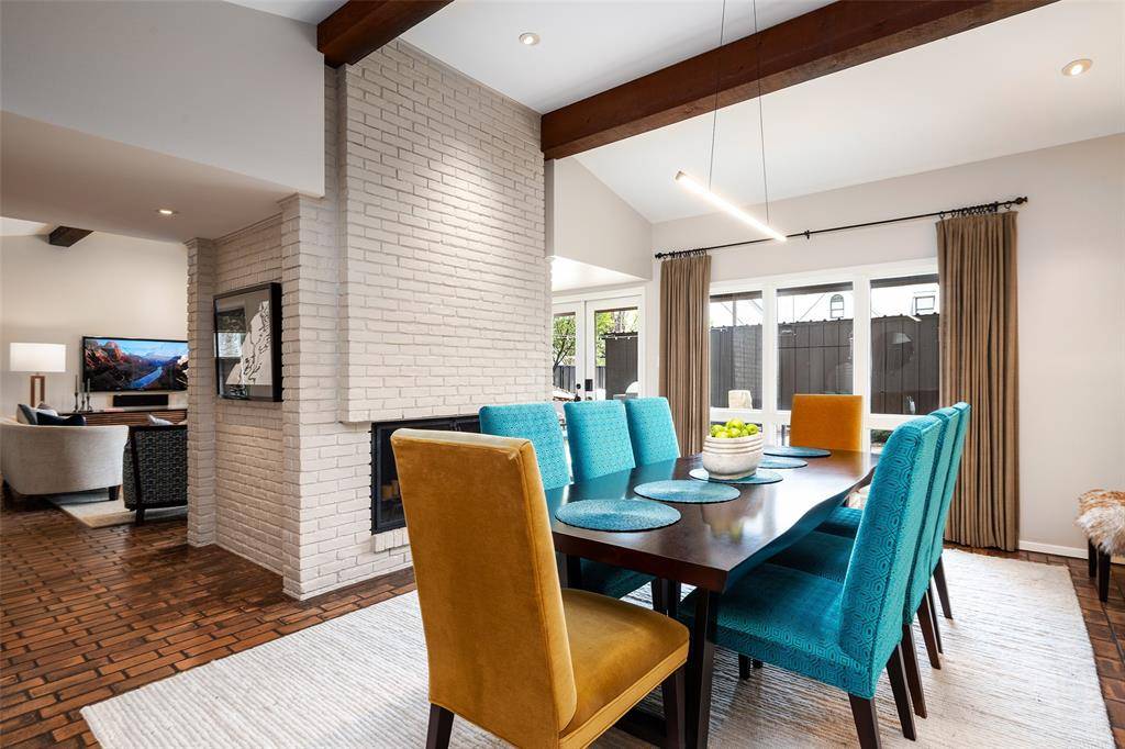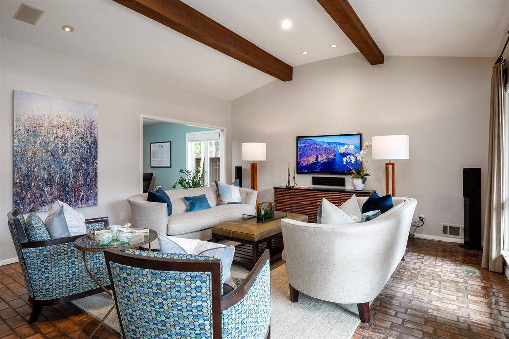 Built in 1972, the home offers approximately 2,966 square feet with a well-designed, flexible layout. Light-filled interiors and clean lines define the soft contemporary style, while brick floors anchor the downstairs living, dining, study, and kitchen with warmth and character. The front living area offers flexibility to serve as either a formal living or dining space, while a soaring double-sided fireplace elegantly separates the main living and dining areas, creating an inviting flow for both entertaining and everyday living.