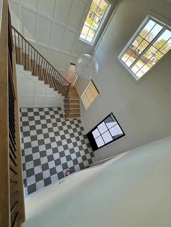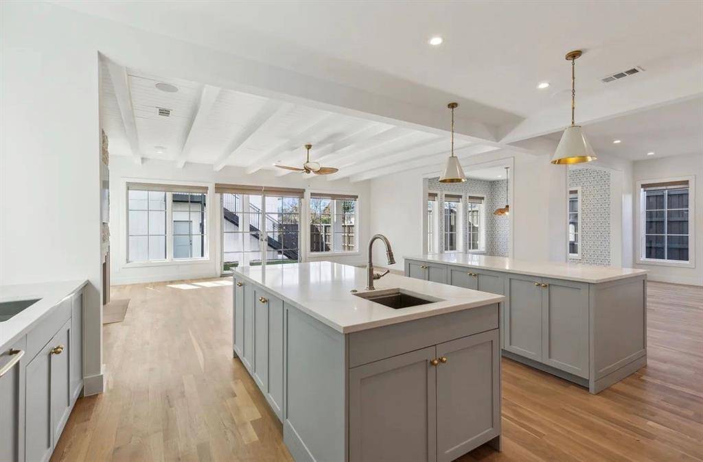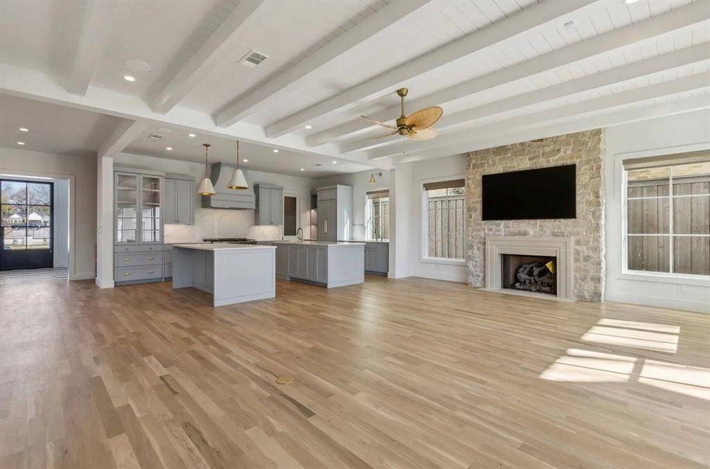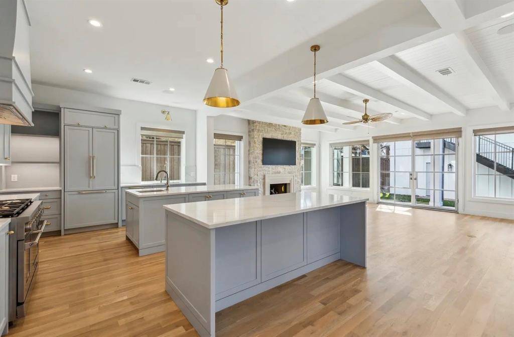 Expansive windows flood the home with natural light, highlighting soaring ceilings and a striking architectural staircase. The open-concept design flows beautifully from the dining area into a chef's kitchen featuring dual islands, and into an inviting living space centered around a sleek built-in fireplace—perfect for both entertaining and everyday living.