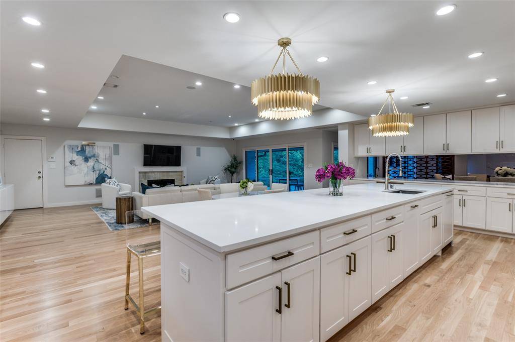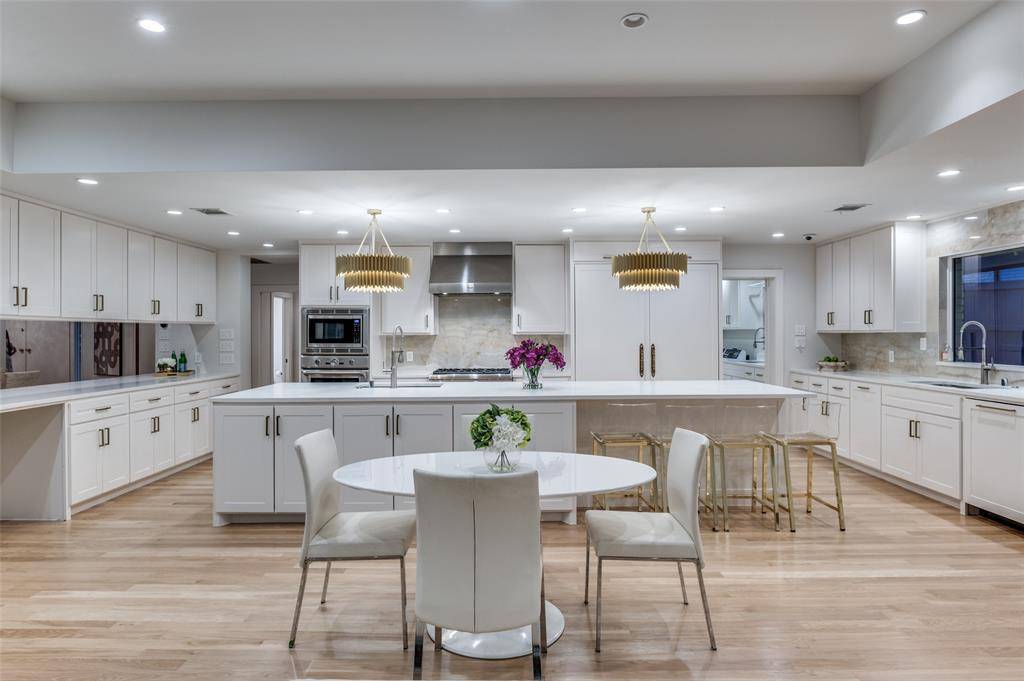 The chef's kitchen is thoughtfully appointed with double sinks, double dishwashers, a warming drawer, and built-in Thermador and Bosch appliances. An oversized island with a buffet-style bar anchors the space, serving as a natural gathering point while opening to the dining and family rooms.