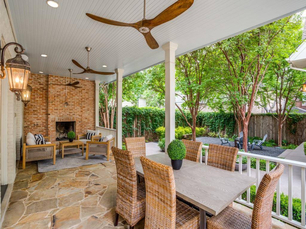 Outdoor spaces have been significantly enhanced with refreshed landscaping and a covered porch featuring dining and living areas centered around an outdoor fireplace and TV area. A built-in outdoor kitchen with gas grill completes the space.