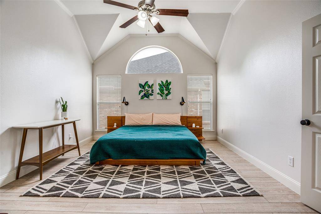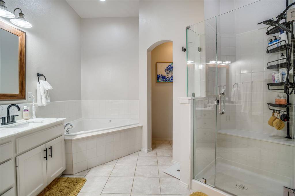 The oversized primary suite offers vaulted ceilings and a comfortable sitting area. The fully updated en-suite bath features dual sinks, a jetted tub, and a refinished oversized shower with a stunning frameless glass enclosure.
