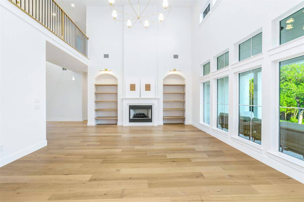 The open living area is filled with natural light and centered around a gas fireplace with built-in shelving. The primary suite offers dual walk-in closets and a well-appointed bathroom with double vanities, soaking tub, and separate shower.
