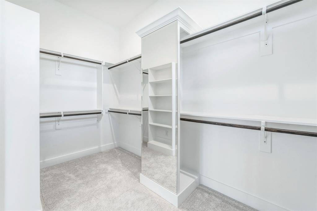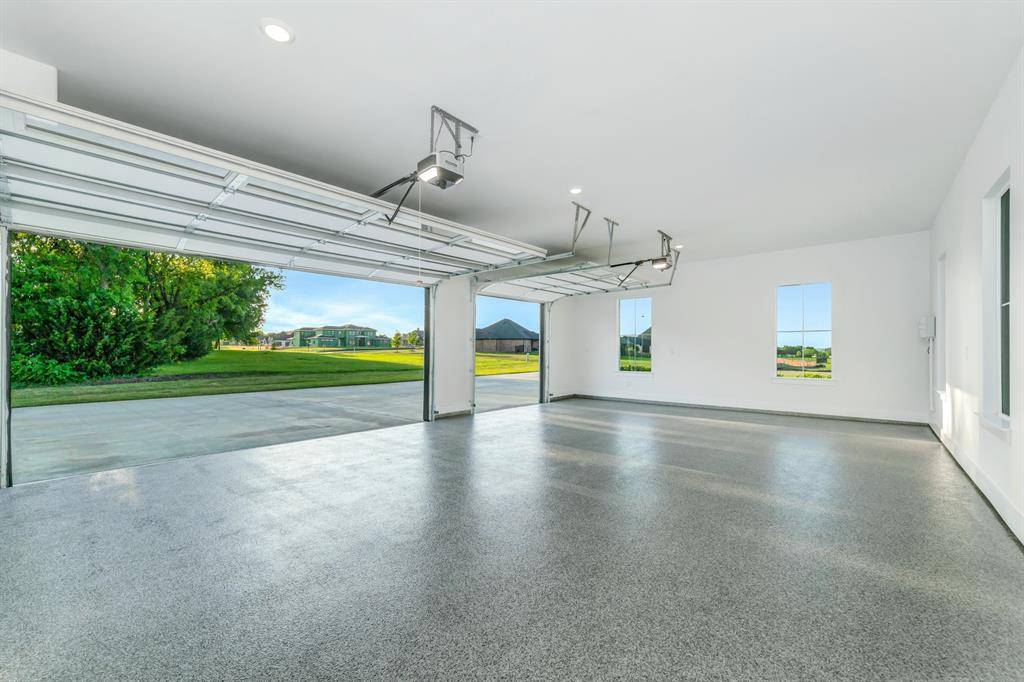 The 3-car garage features durable epoxy flooring and oversized doors, providing plenty of space for larger vehicles, storage, or a workshop setup.