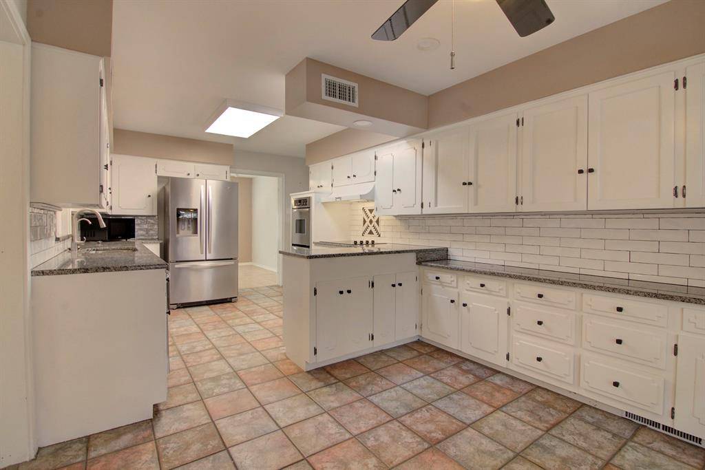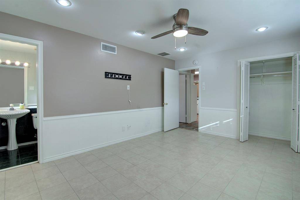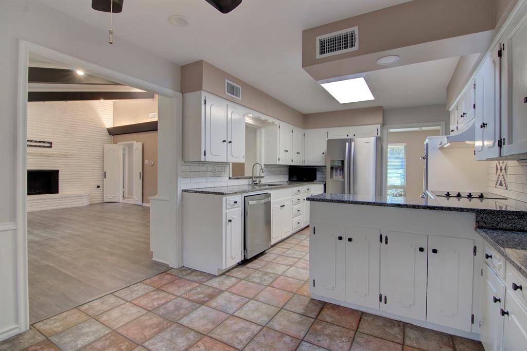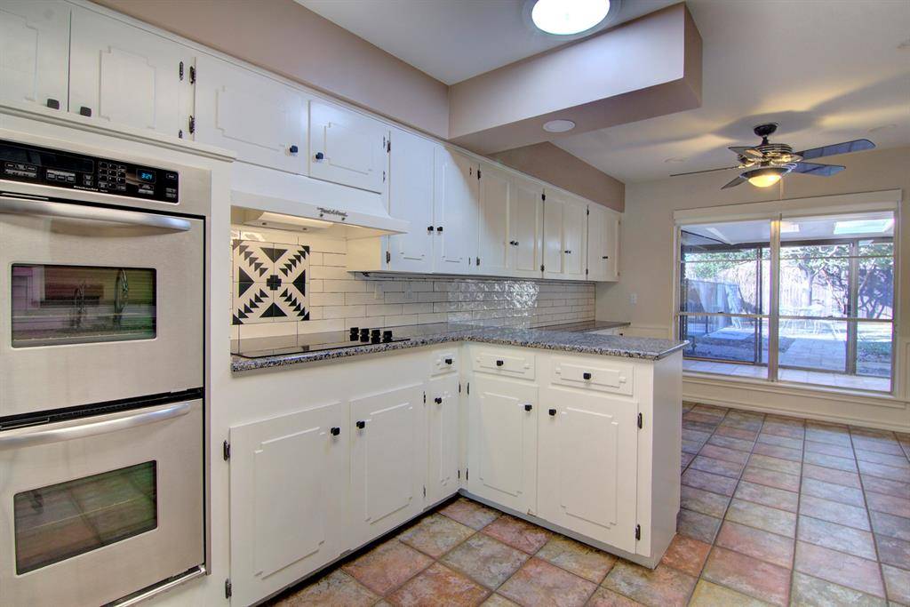 Spacious 4 bedroom, 3 bath soft contemporary home on .38 of an acre with 3 covered parking spots and power remote gate for access to back yard. Home is 2458 square feet with a huge 15X33 enclosed sun room with skylights, AC and heat. Split floor plan with separate guest room and private bath and 2 closets close to kitchen. Hard surface on all floors, no carpet. New wood blinds. Kitchen has lots of counter space with granite tops, double oven, flat glass cook top & large stainless sink with reverse osmosis water. Stainless steel refrigerator is included and brand new dishwasher. Breakfast area looks out on to mature landscape and flowers. Master bedroom has patio door leading to a back paved sitting area. Two full bathrooms have been totally updated. All windows and doors are insulated plus extra insulation in the attic. Solar tube in main bath and kitchen for added natural light. Two HVAC units in home. Landscape-lawn care is included with the rent. The wonderful Katy Trail hike and bike trails are only 2 blocks away. Home is centrally located so access to DFW & downtown is easy.
