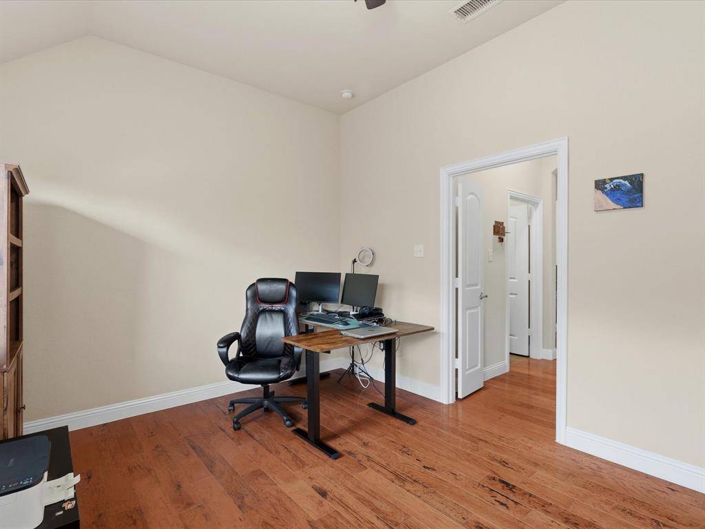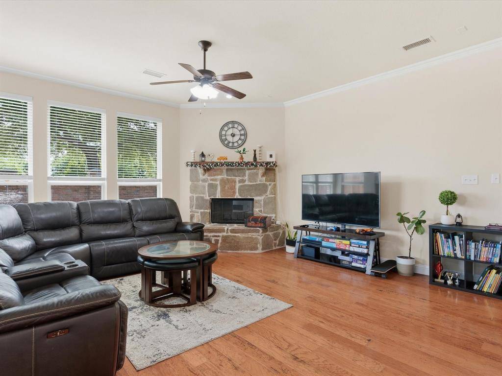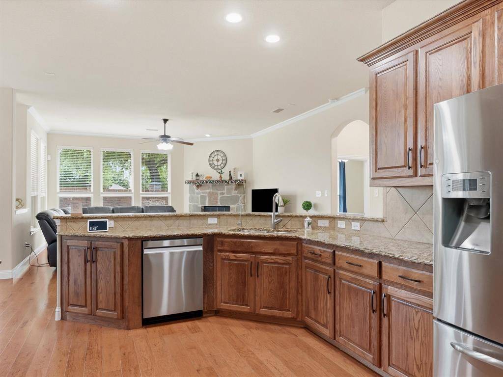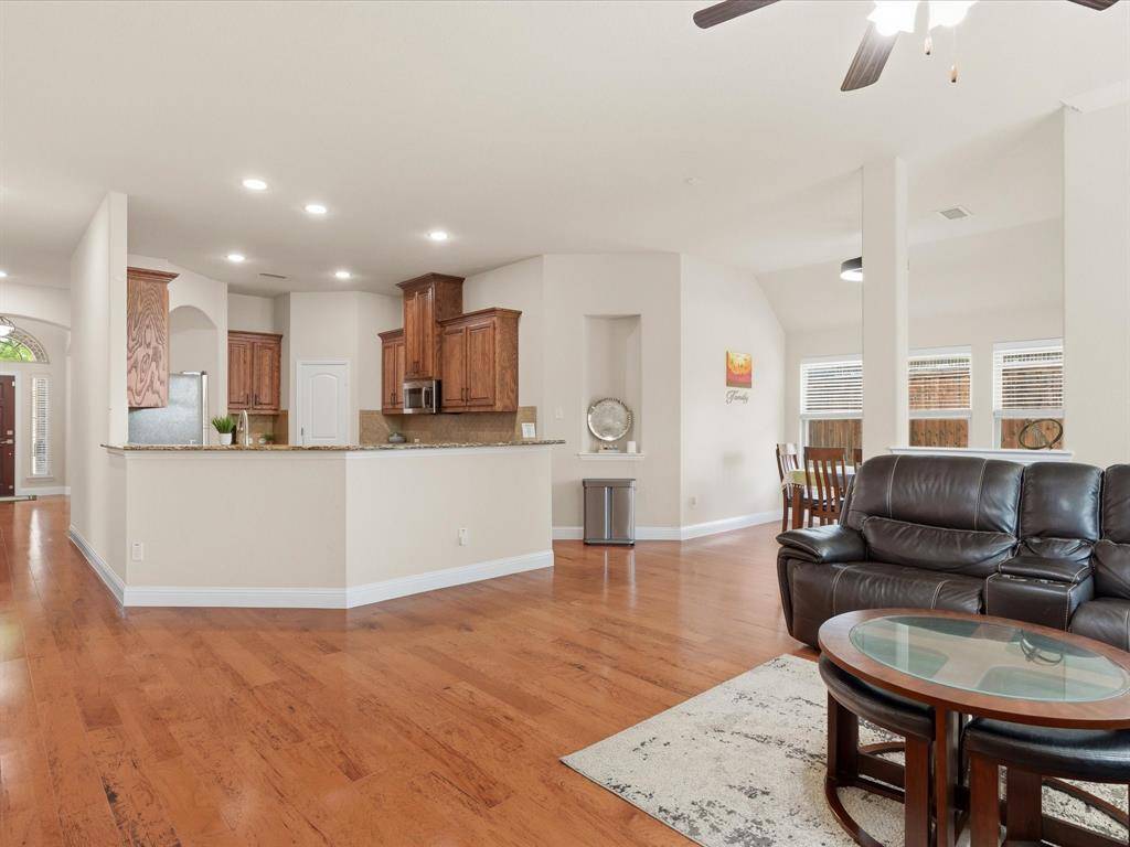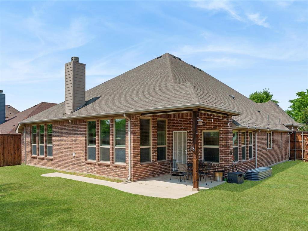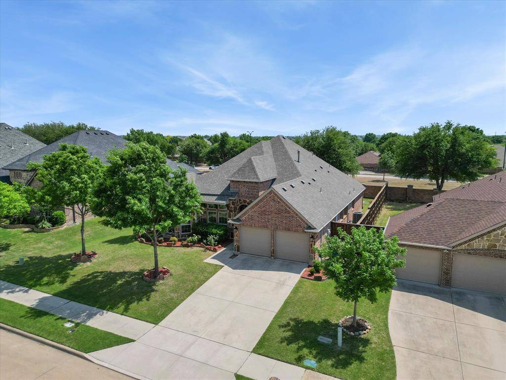 Exceptional North-Facing Single-Story in Crown Ridge! Welcome to effortless luxury in this beautifully maintained, single-story K. Hovnanian residence, ideally positioned in the highly sought-after Crown Ridge community and zoned to acclaimed Prosper ISD (Rock Hill High School). This home has been meticulously cared for and thoughtfully updated, offering true move-in-ready peace of mind: Roof replaced (2021), New HVAC system (2023), Fresh interior paint (Feb 2026), Fence professionally stained (Sep 2025), New dishwasher and washer, dryer (2022), New microwave (2024), Upgraded coach lights, four new ceiling fans, storm doors, and patio sunshade! Step inside to an inviting open-concept layout with rich wood flooring that creates a bright, airy ambiance throughout. The thoughtfully designed split-bedroom floor plan offers added privacy, while a dedicated study enclosed by elegant French doors makes working from home a pleasure. A versatile formal dining space can easily serve as a second office or flex living area. At the heart of the home, the expansive kitchen impresses with abundant cabinetry, granite countertops, a gas cooktop, stainless appliances, and a tankless water heater. The oversized family room anchors the home with a striking stone fireplace — a warm, welcoming space to relax or entertain. The primary suite is a true retreat with a generous sitting area, spa-style ensuite bath and an impressively large walk-in closet. Location is everything here. Minutes from PGA Frisco, The Star, Riders Field, Toyota HQ, Topgolf, and GrandScape! Walking distance to Crown Ridge's community pool, parks, private pond, and miles of trails! Single-story homes with this level of care, in this school district, & in this ideal location are a rare find! Schedule your private showing today.