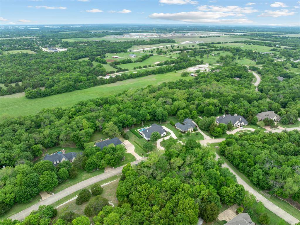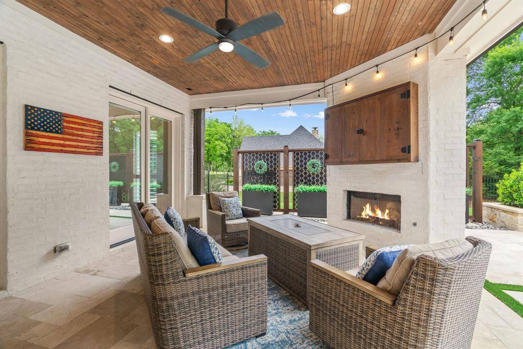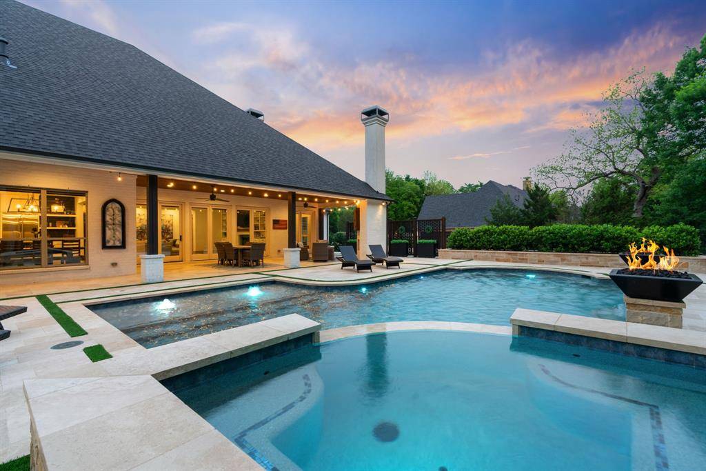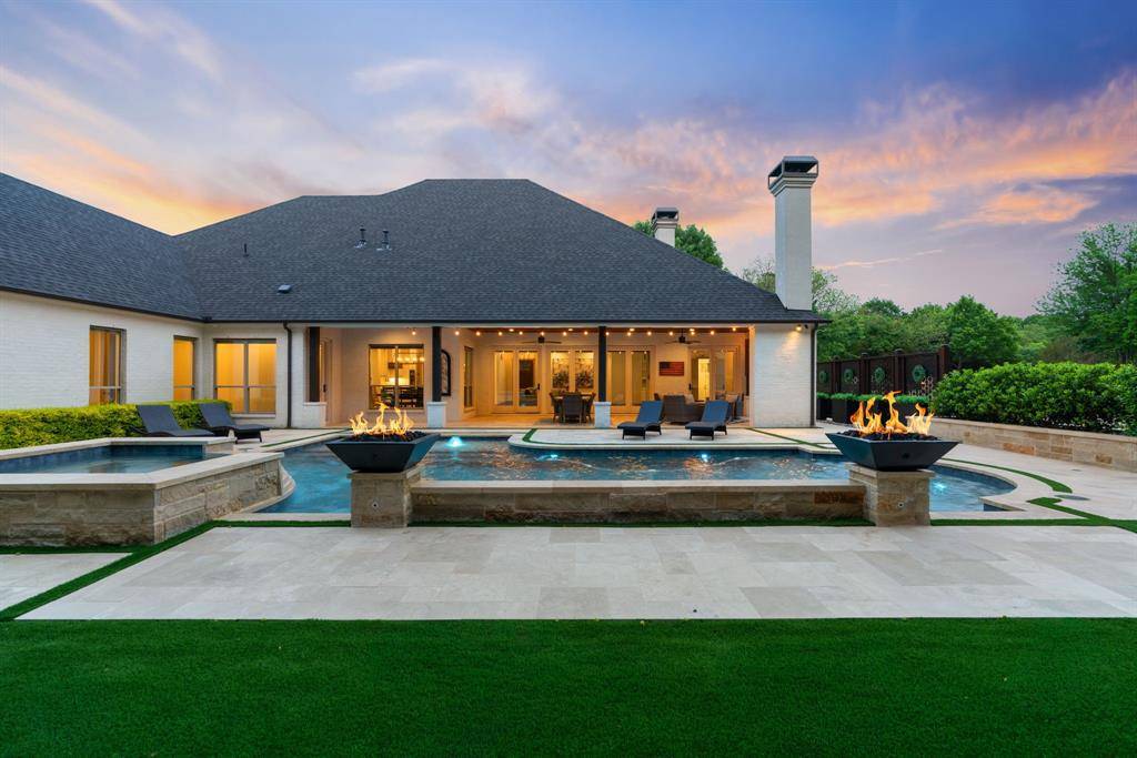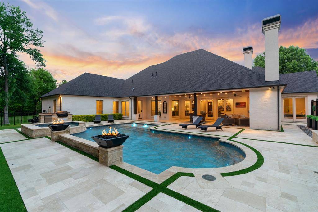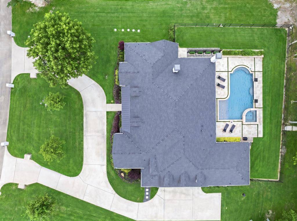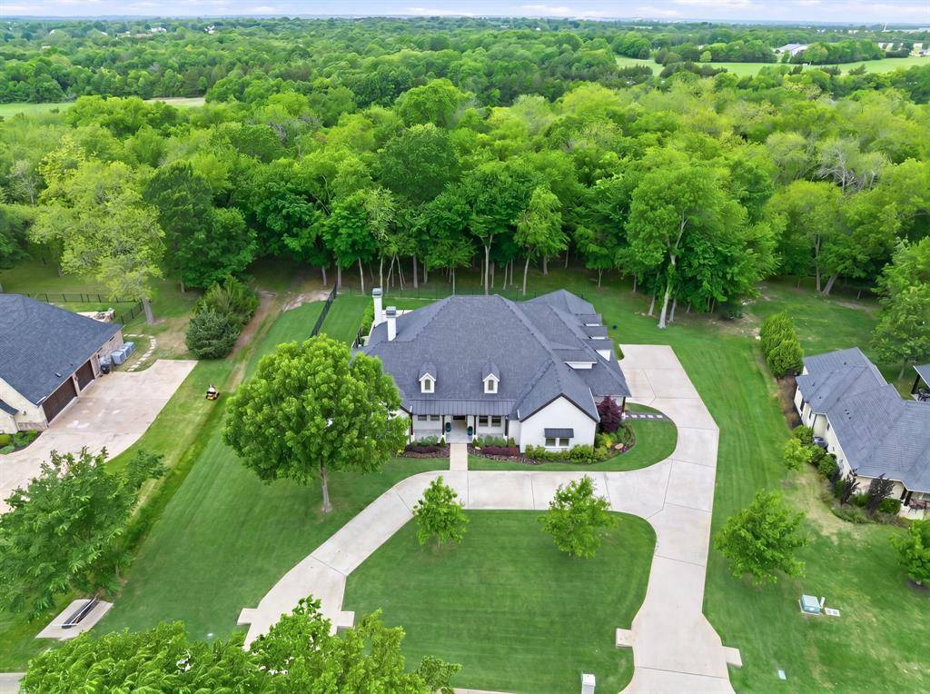 Welcome home to a refined, resort-inspired lifestyle in this stunning estate, privately situated on a two-acre lot with breathtaking sunset views in the sought-after Creekview Landing community of McKinney. Enjoy a peaceful setting just minutes from Historic Downtown McKinney, with convenient access to premier shopping, dining, and entertainment. Blending timeless architecture with elevated design, the home features mature landscaping, lush lawns, an expansive curved driveway with additional parking, and 3-car garage. Inside, a spacious, light-filled living room opens to the kitchen, highlighted by vaulted ceilings with exposed beams, a cozy fireplace, and hardwood flooring. The chef's kitchen includes a walk-in pantry, farmhouse sink, gas cooktop, double ovens, spacious coffee bar area, and custom cabinetry, with generous counter space and storage. The layout offers all bedrooms on the main level with spacious closets and well-appointed baths, plus a versatile flex space ideal for dining or an executive study. The private owner's suite features a sitting area overlooking the acreage and beautiful backyard oasis, a large walk-in closet, and a spa-inspired bath. Upstairs, a flex space with a half bath, perfect for a game room, media room, or guest retreat. Designed for modern living, the home includes Cat6A wiring, fiber internet and built-in storm shelter. The outdoor living experience is exceptional, offering a private, resort-style setting for both relaxation and entertaining. A stunning pool and heated spa are complemented by expansive lounging areas and low-maintenance turf, all framed by a wrought iron fence and open Texas skies. Whether hosting guests or enjoying quiet evenings at sunset, this space offers a seamless blend of luxury, privacy, and everyday escape. Plantation shutters and electric shades add comfort and sophistication throughout. This exceptional estate offers a rare combination of design, privacy, and elevated everyday living.
