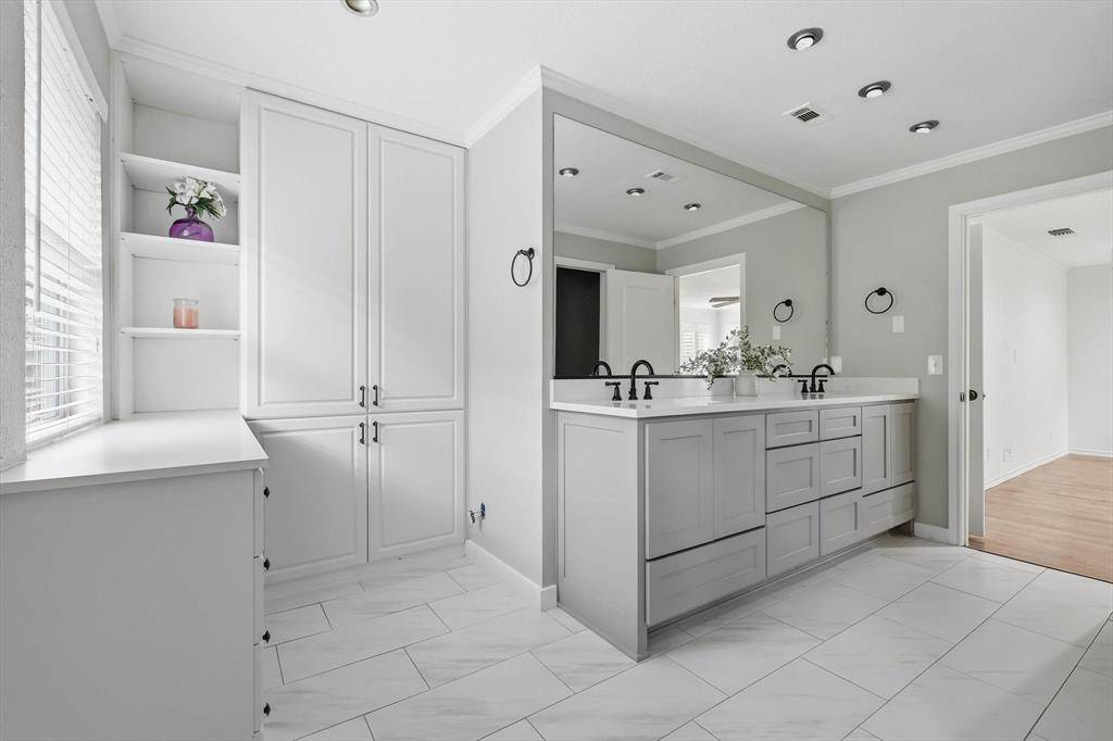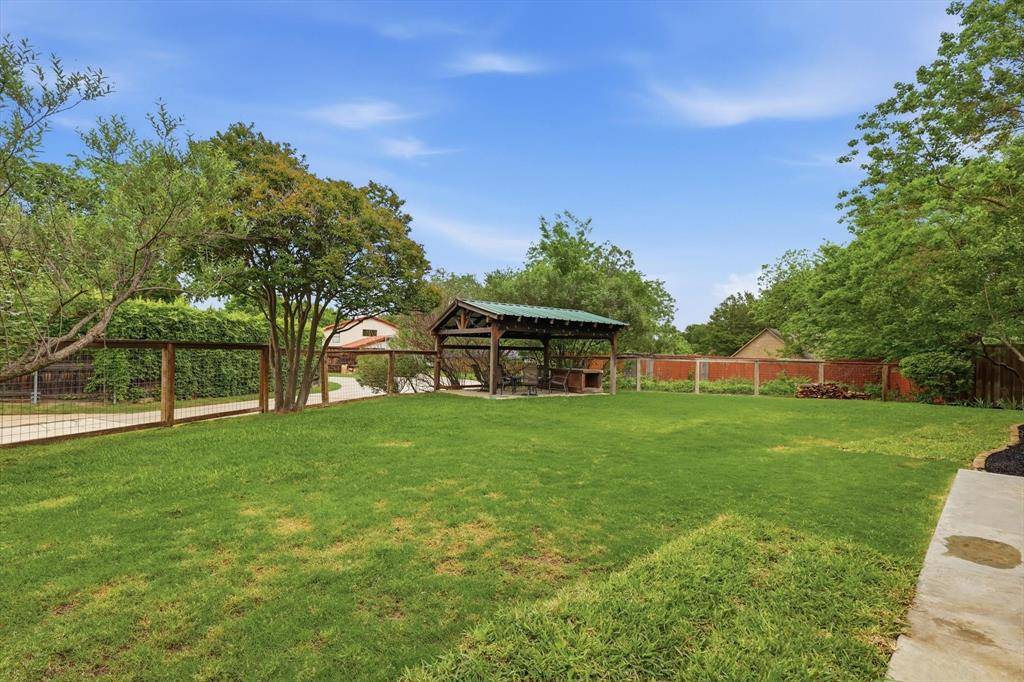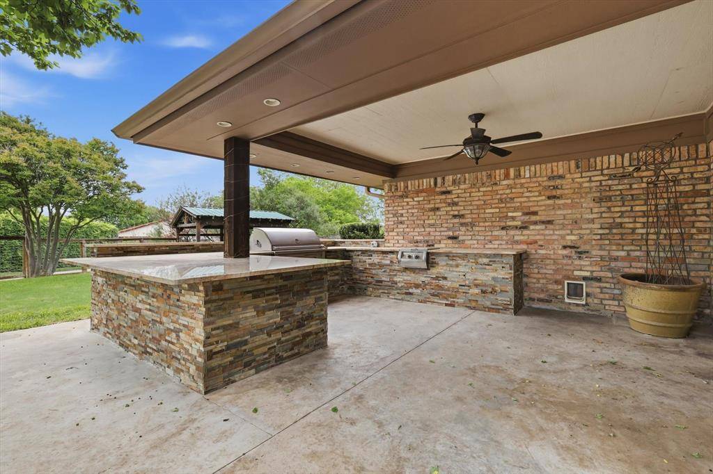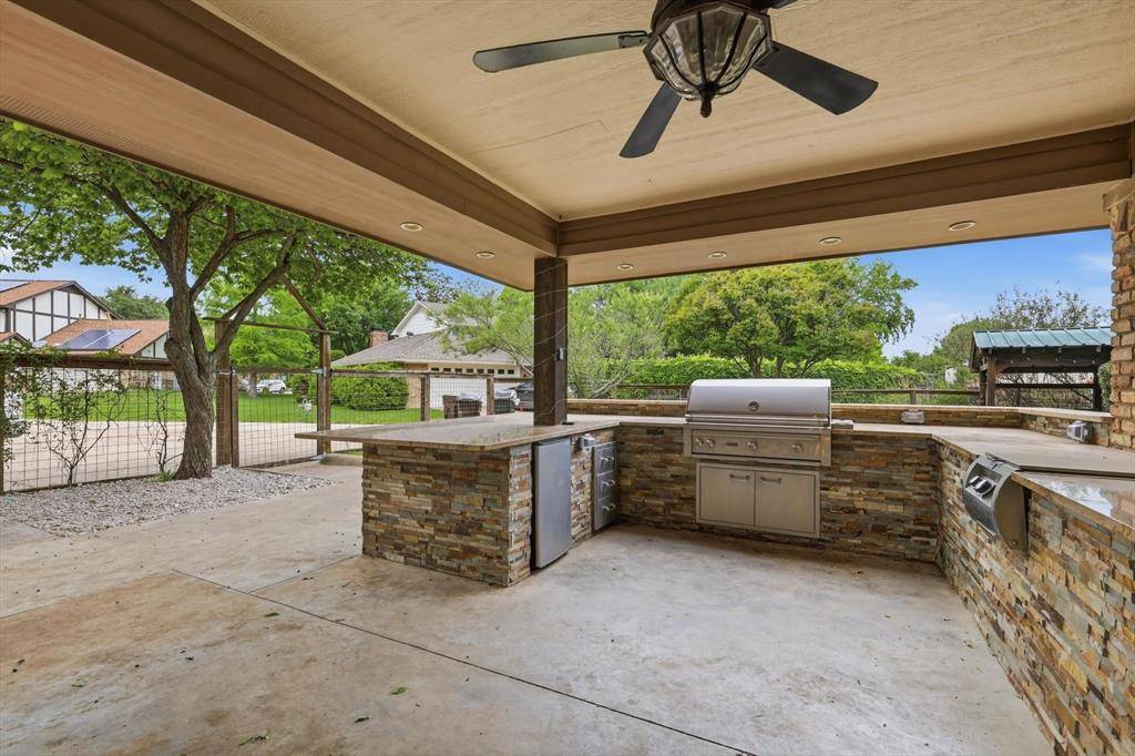 The open floor plan flows beautifully and offers expansive family room and kitchen -perfect for time together. Kitchen offers extra large island, specialty drawers, custom built in dining banquette and plenty of custom cabinet space! Extra large pantry and prep kitchen with custom built in cabinets for optimal storage and organization! Downstairs offers bedroom and full bath. Retreat to the primary bedroom and recently renovated upstairs bathroom offering dual sinks, customized cabinets, large walk in closet, frameless glass shower and extra shelving for storage. 3 additional bedrooms and full bath on second level. Spend time in the back yard or under the expansive outdoor covered patio and kitchen with granite countertops, built in burner, grill, and sink. Separate covered outdoor pavilion with electricity perfect for relaxing and BBQing. The extra large driveway offers space for multiple cars and an RV or boat. The oversized garage can accommodate two SUV vehicles, home gym, work bench & fridge. Location is ideal with quick access to major highways and a central commute to some of DFWs finest including Legacy West, Shops at Legacy, Downtown Dallas, Frisco Star, and Grandscape.