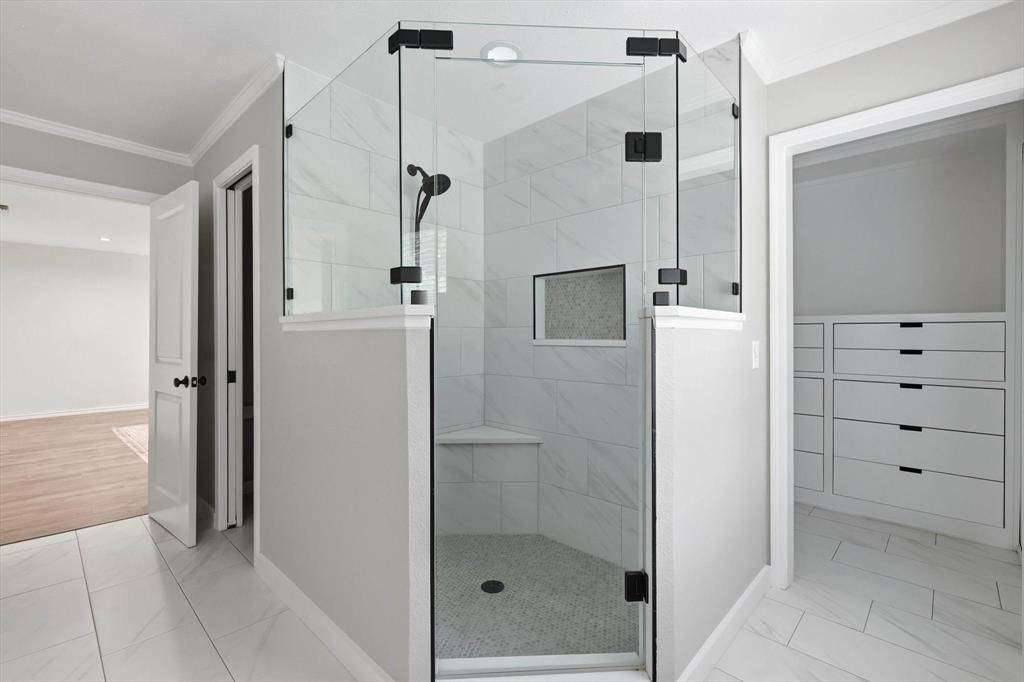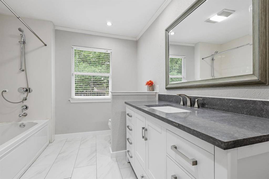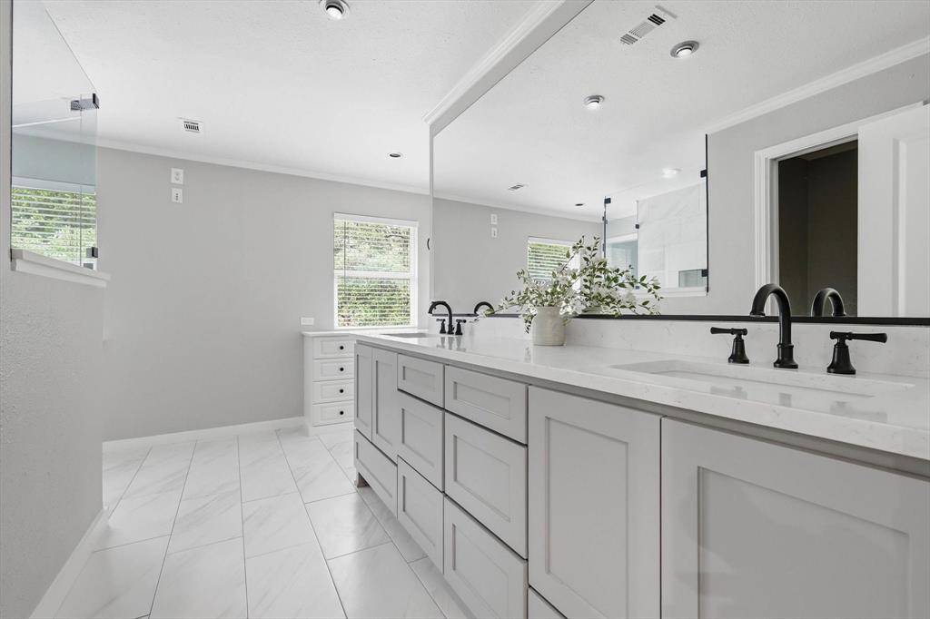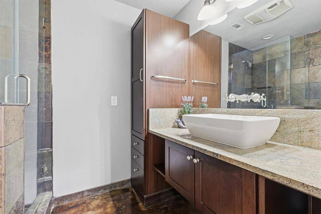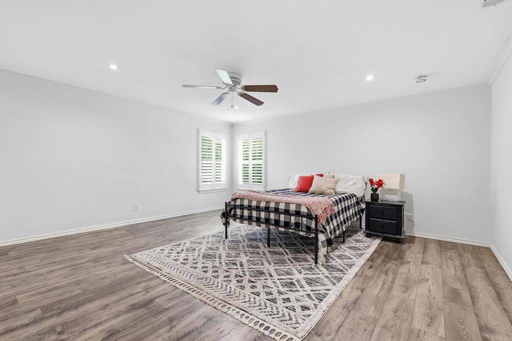 The open floor plan flows beautifully and offers expansive family room and kitchen -perfect for time together. Kitchen offers extra large island, specialty drawers, custom built in dining banquette and plenty of custom cabinet space! Extra large pantry and prep kitchen with custom built in cabinets for optimal storage and organization! Downstairs offers bedroom and full bath. Retreat to the primary bedroom and recently renovated upstairs bathroom offering dual sinks, customized cabinets, large walk in closet, frameless glass shower and extra shelving for storage. 3 additional bedrooms and full bath on second level. Spend time in the back yard or under the expansive outdoor covered patio and kitchen with granite countertops, built in burner, grill, and sink. Separate covered outdoor pavilion with electricity perfect for relaxing and BBQing. The extra large driveway offers space for multiple cars and an RV or boat. The oversized garage can accommodate two SUV vehicles, home gym, work bench & fridge. Location is ideal with quick access to major highways and a central commute to some of DFWs finest including Legacy West, Shops at Legacy, Downtown Dallas, Frisco Star, and Grandscape.