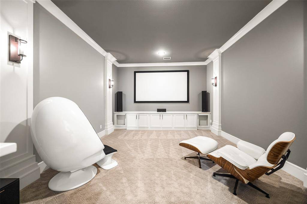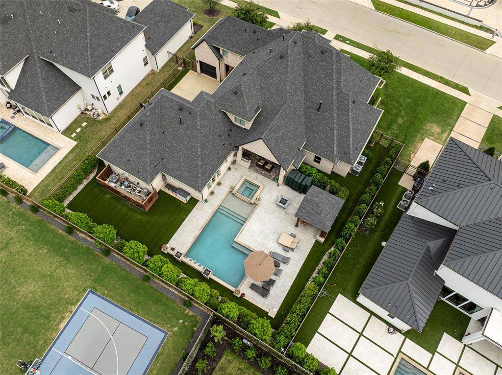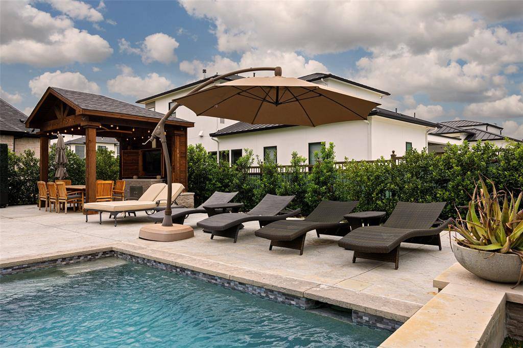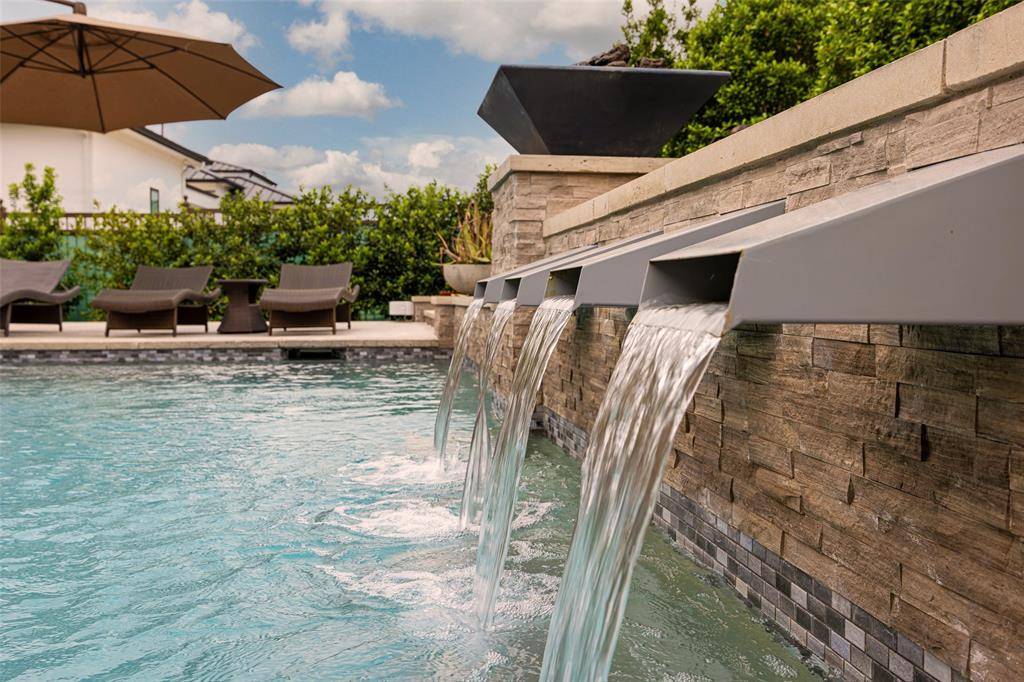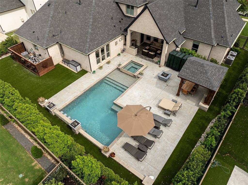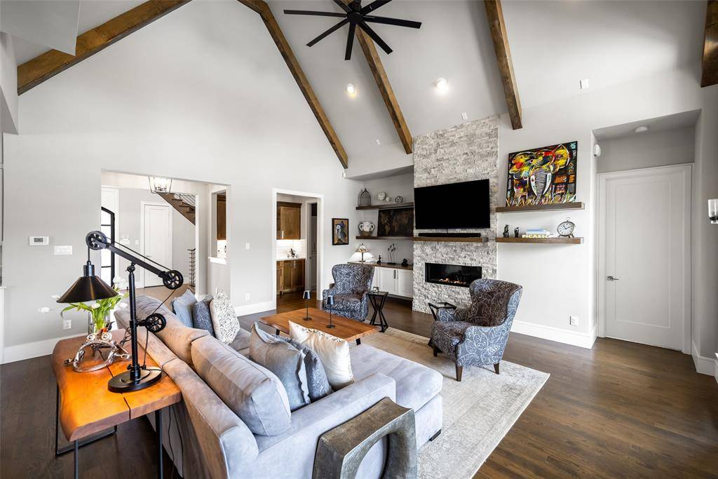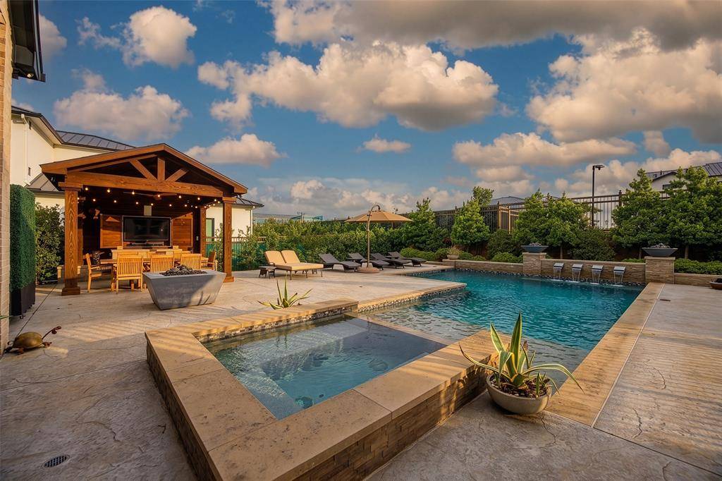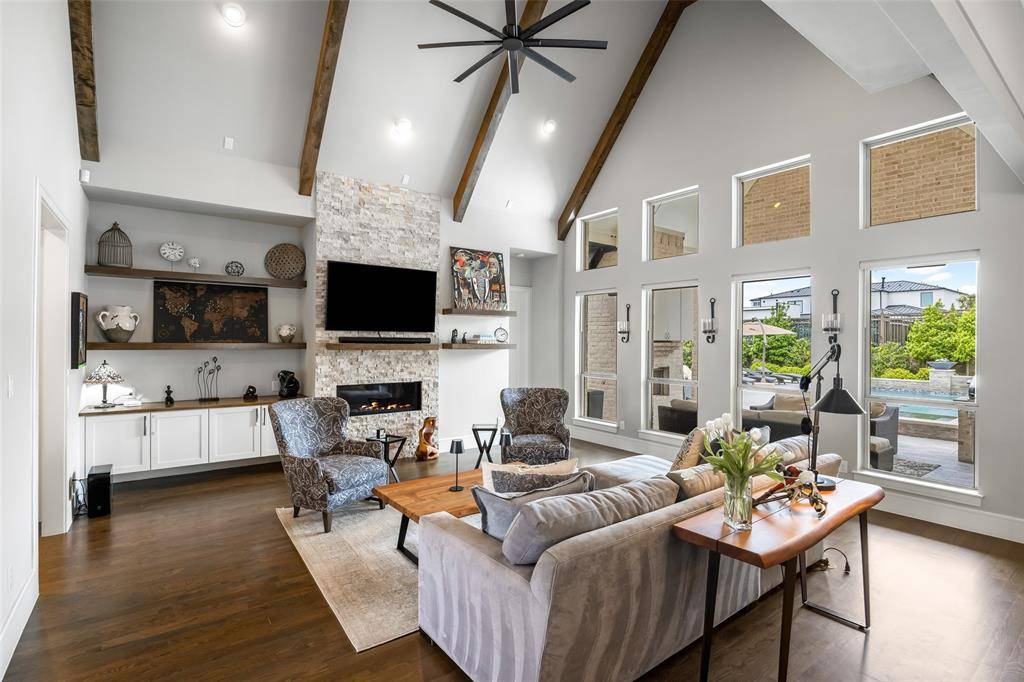 Welcome to refined luxury living in the prestigious, guard-gated community of The Hills of Kingwood. Built by Tom Miller of Oak Creek Custom Homes, this exceptional residence blends timeless craftsmanship with modern elegance. From the moment you arrive, the stately curb appeal & manicured landscaping set the tone for what awaits inside. Step into a stunning living room featuring soaring vaulted ceilings with exposed wood beams, rich wood flooring, custom built-ins, & a dramatic floor-to-ceiling stackstone fireplace. Walls of windows frame picturesque views of the backyard oasis & seamlessly connect to the open-concept chef's kitchen. Designed for entertaining, the kitchen showcases a large island, Thermador commercial-grade gas range, pot filler, built-in refrigerator, microwave, & dishwasher. The home offers elegant & functional spaces throughout, including a formal dining room, large wine closet, & a wet bar with icemaker & wine refrigerator leading into a fully equipped media room—perfect for movie nights with all equipment included. A private study, located midway up the staircase, features custom woodwork & a beautifully detailed ceiling. The luxurious primary suite offers a tray ceiling, cozy fireplace, electric shades, & serene pool views. The spa-inspired bath includes dual vanities, soaking tub, walk-in shower with seating, & a custom closet. Designed with comfort & privacy in mind, all secondary bedrooms are en suites, including a convenient downstairs guest suite. Upstairs, enjoy a spacious game room with wet bar & refrigerator, along with additional en suite bedrooms & a second primary suite. Step outside to your private retreat—an outdoor living space complete with fireplace, built-in grill, sink, icemaker, refrigerator, & two TVs included. The saltwater pool & spa, built by Riverbend Sandler in 2020, features a tanning ledge & is complemented by a cabana and low-maintenance turf. Experience elevated living in this exceptional Frisco home.